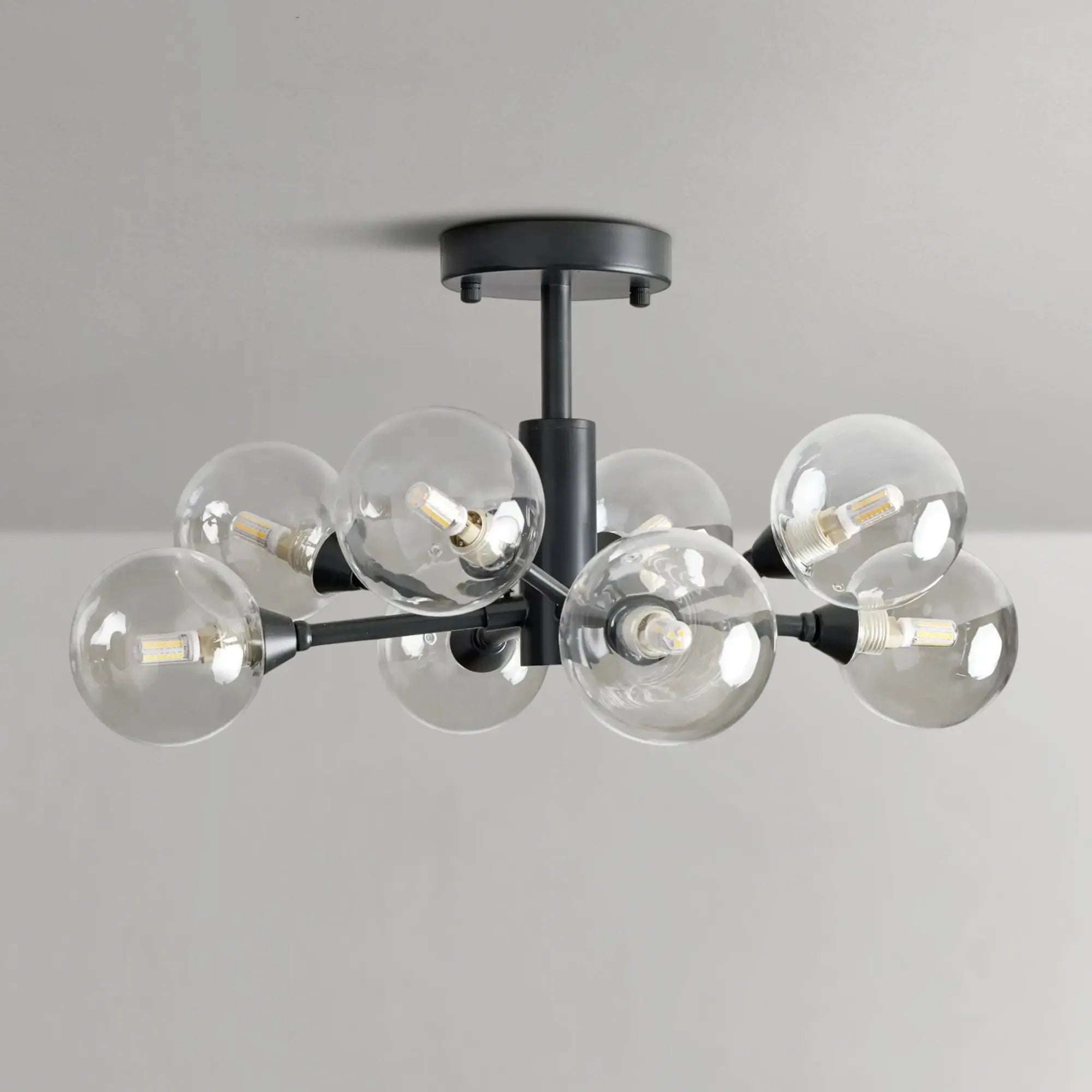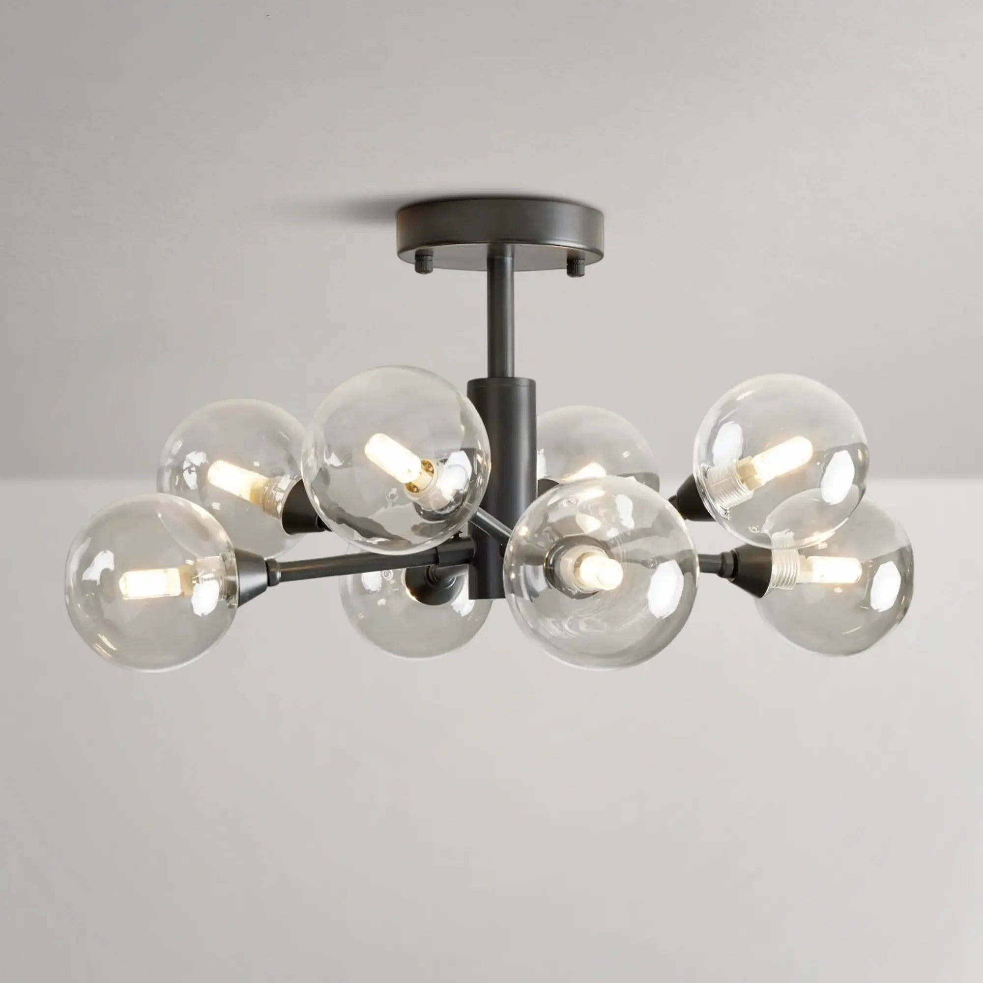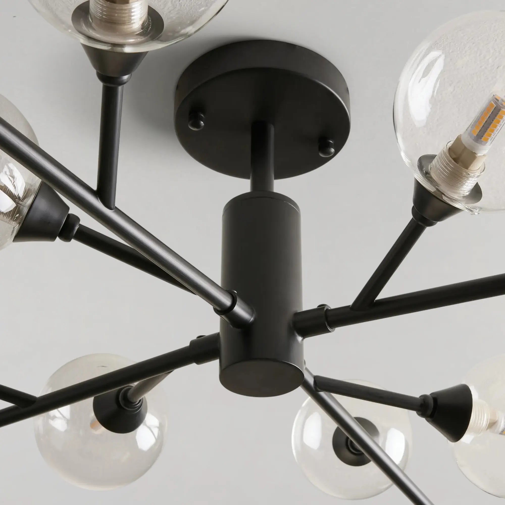 Inspired by the brilliance of the night sky, this mid-century modern flush mount features a radiant iron frame that extends outward in a starburst silhouette. Finished in antiqued bronze, plated brass, or polished nickel, it delivers bold architectural presence while remaining refined and versatile. The evenly spaced light sources create a dynamic glow, making it an eye-catching centerpiece for living rooms, bedrooms, or entryways seeking elevated modern style.