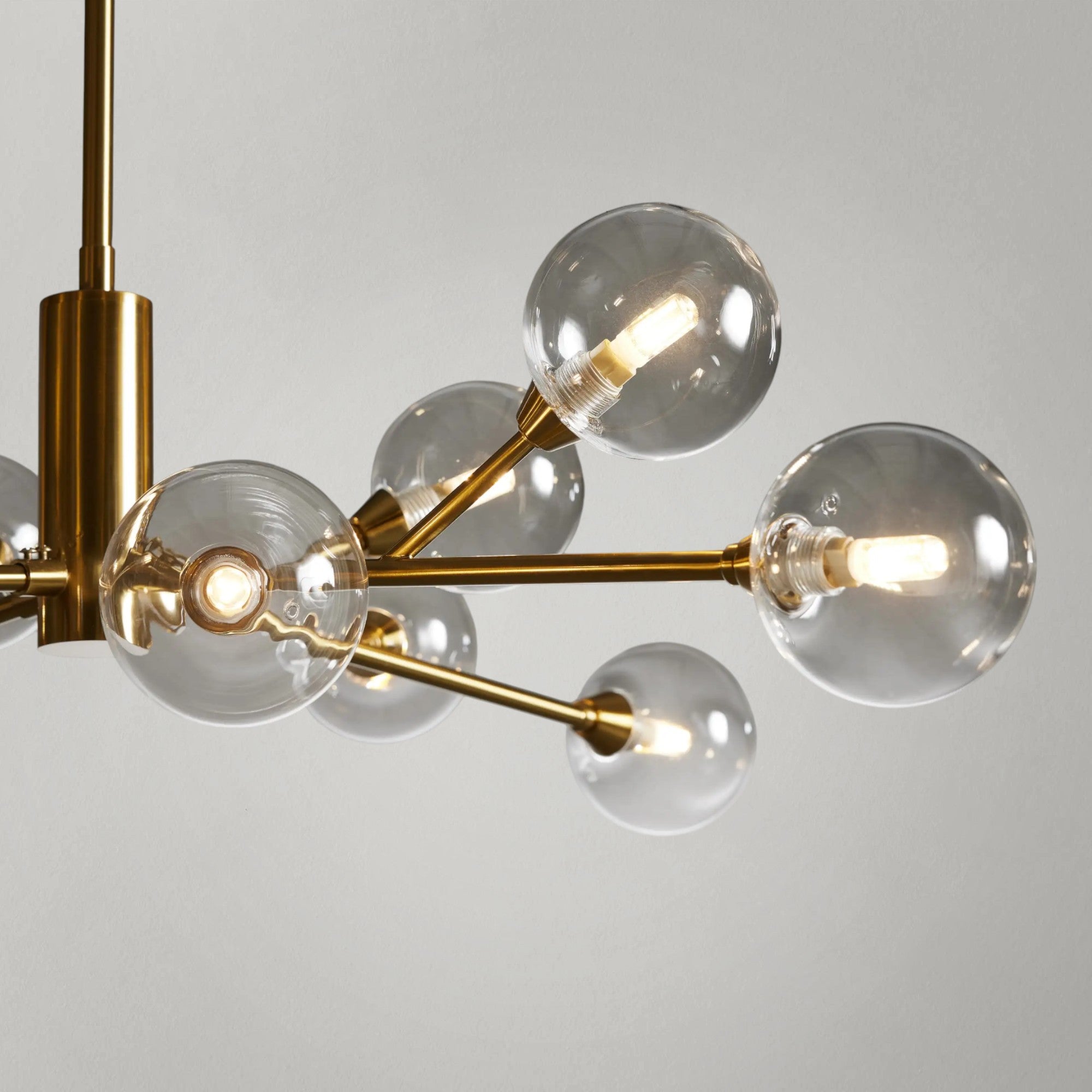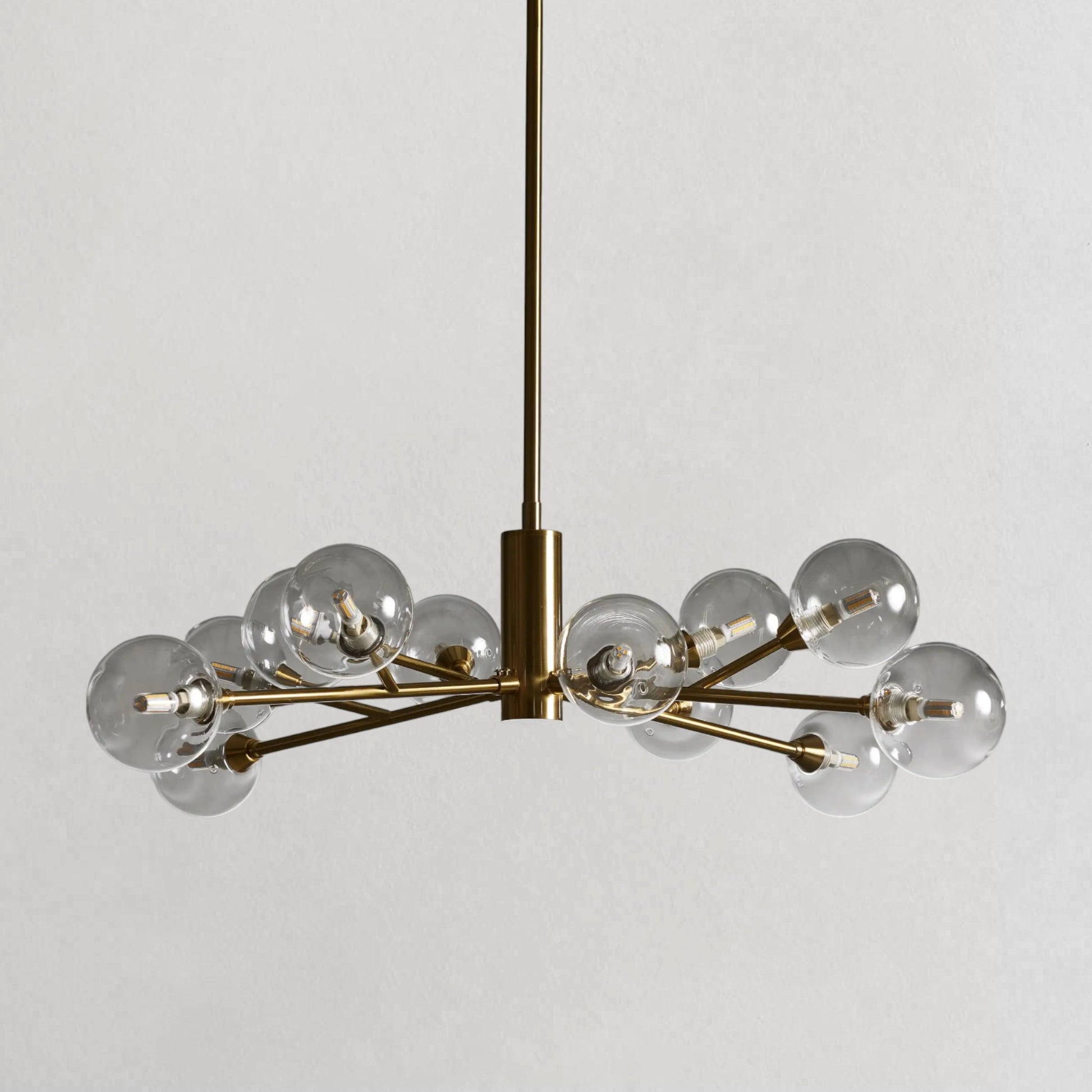 This chandelier draws inspiration from the stars, featuring a radiating metal frame that captures the bold character of midcentury modern design. Evenly spaced light points create a bright, balanced glow that adds energy and visual rhythm to the room. With its sculptural form and refined metal finishes, the fixture blends effortlessly into dining areas, living spaces, and open interiors, serving as a striking focal point with versatile appeal.
