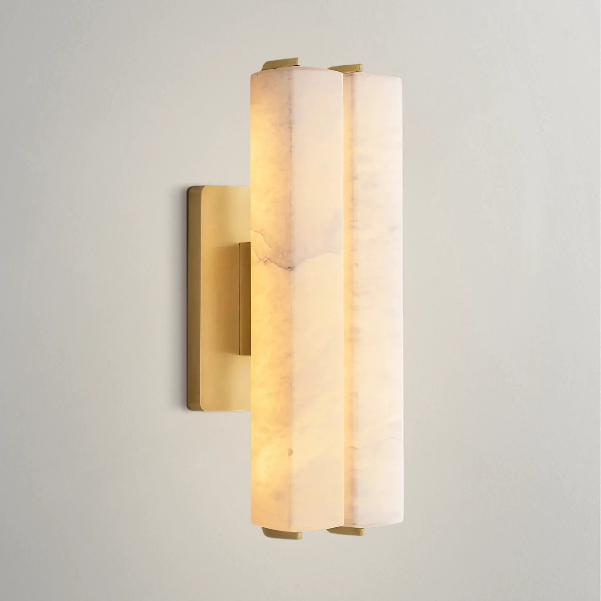 Inspired by the quiet elegance of 1960s Italian minimalism, this wall sconce pairs sculptural brass construction with luminous alabaster prisms. Two natural alabaster panels softly diffuse the integrated LED light, creating a warm glow reminiscent of candlelight. The balanced, architectural form can be mounted vertically or horizontally, making it a refined lighting statement for bathrooms, hallways, and contemporary interiors.