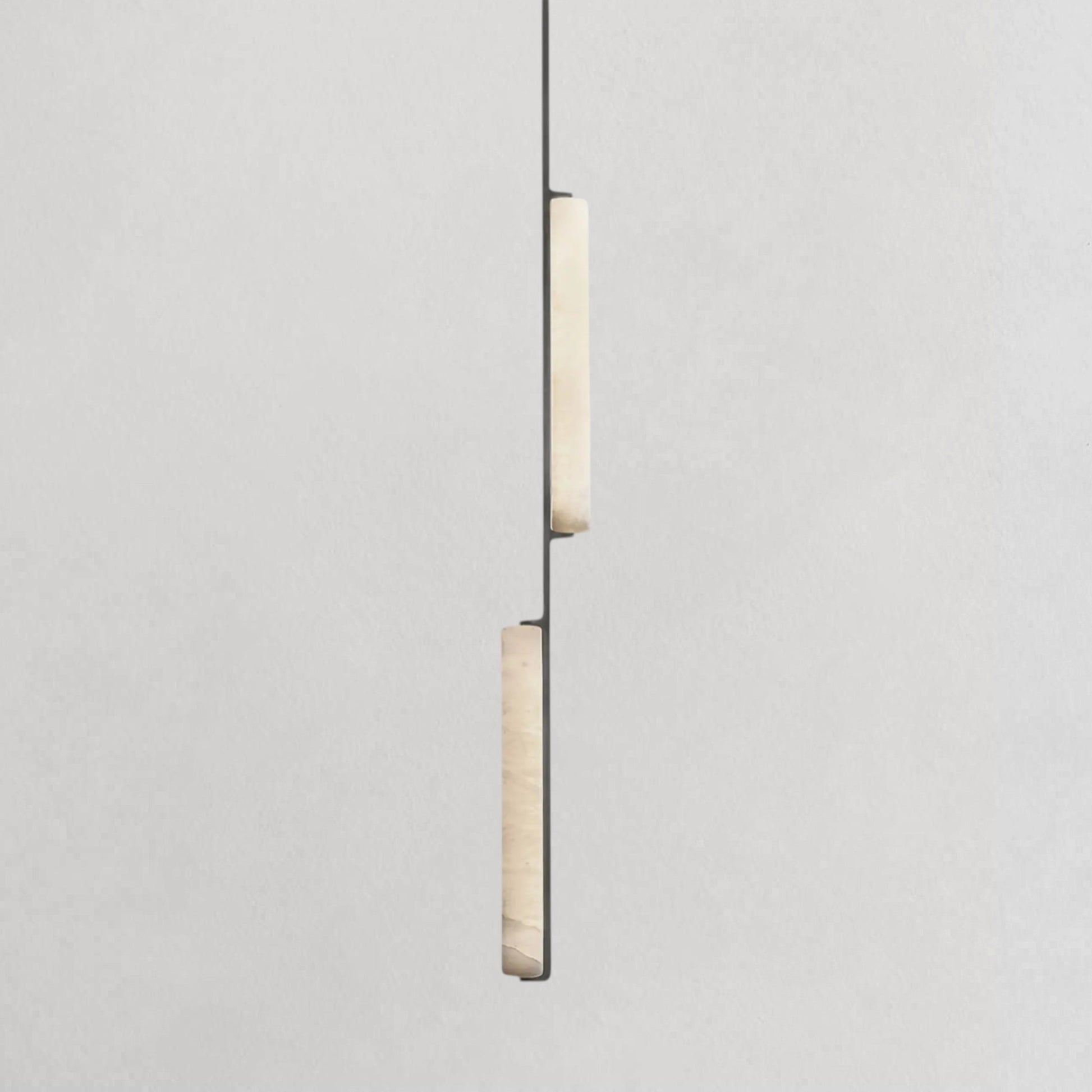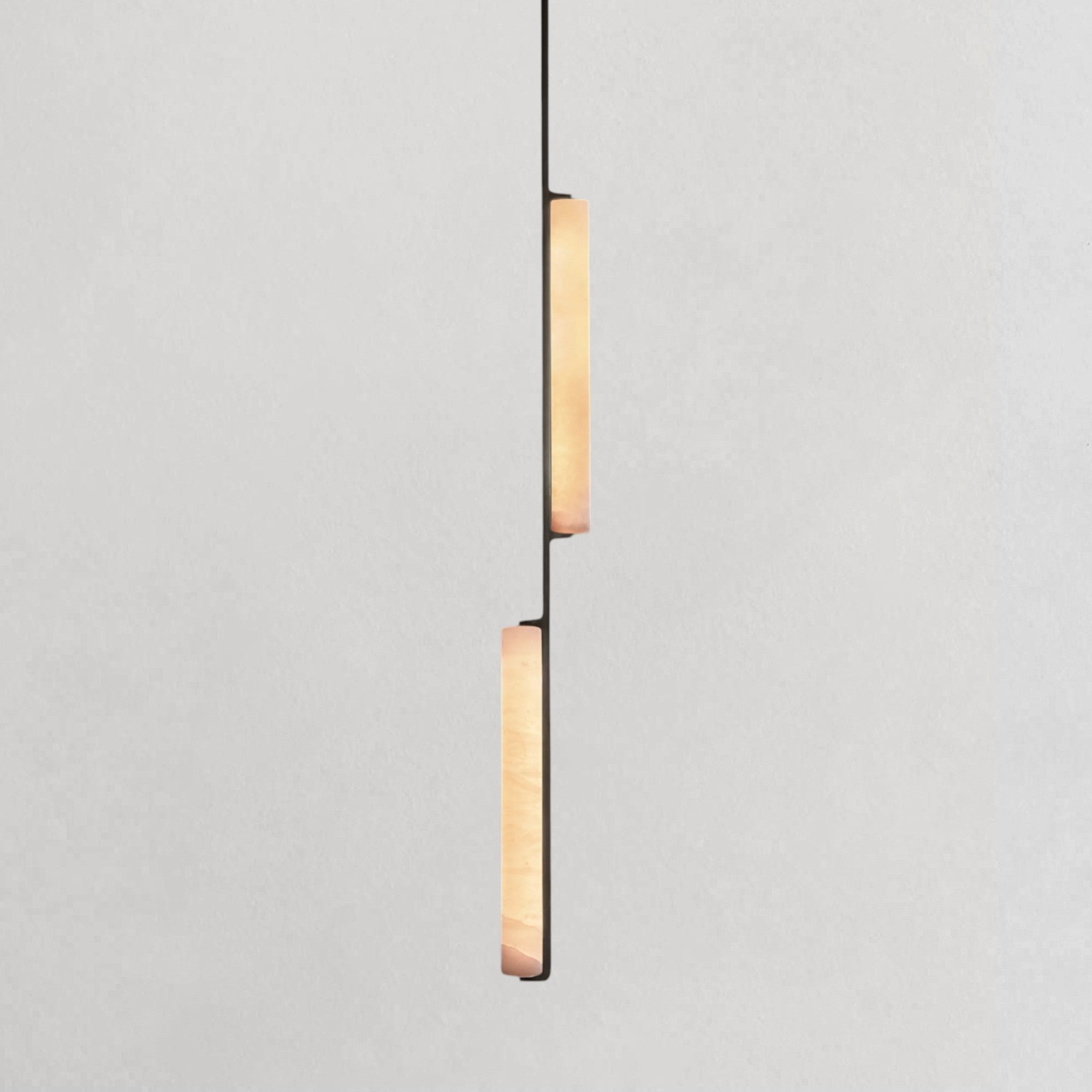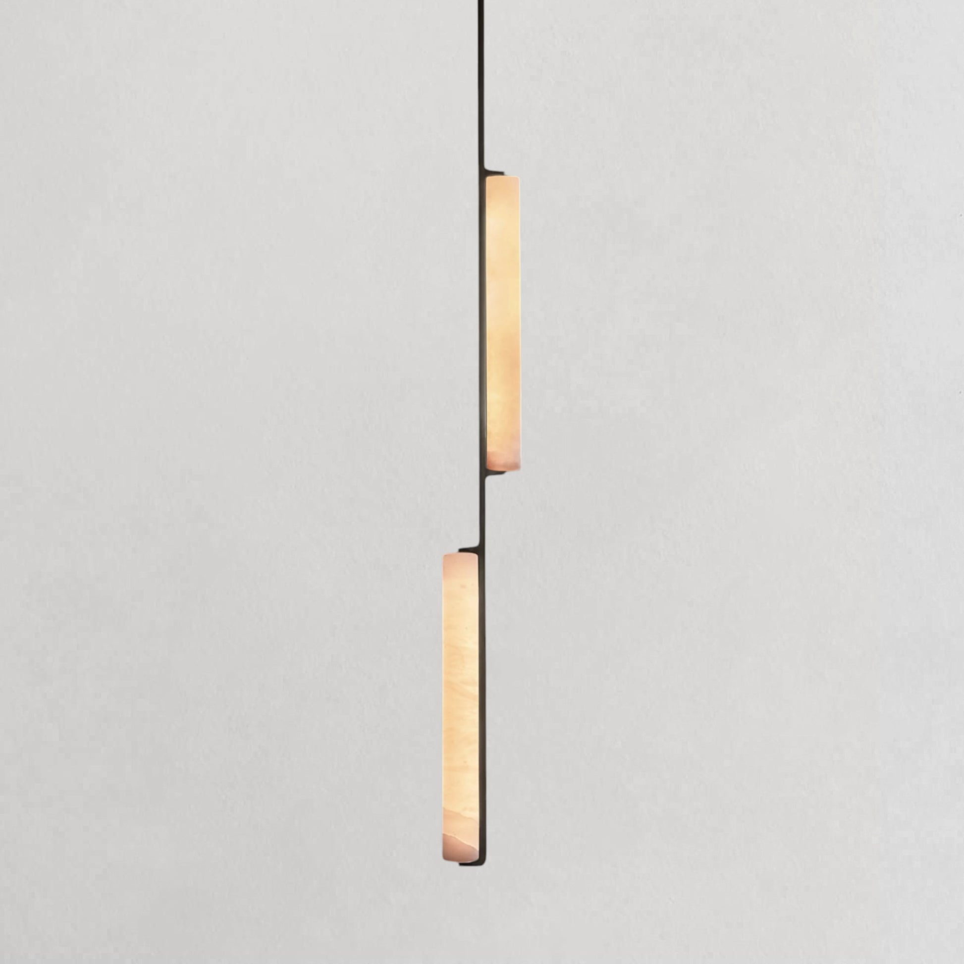 Inspired by the quiet elegance of 1960s Italian minimalism, this pendant features two vertically aligned alabaster prisms suspended from a refined brass drop, forming a composition that is both sculptural and restrained. The translucent stone softly diffuses a warm, candle-like glow, revealing natural veining that adds depth and individuality to each piece. With its slender proportions and balanced form, it introduces a refined vertical accent ideal for dining areas, bedside settings, or layered lighting arrangements.