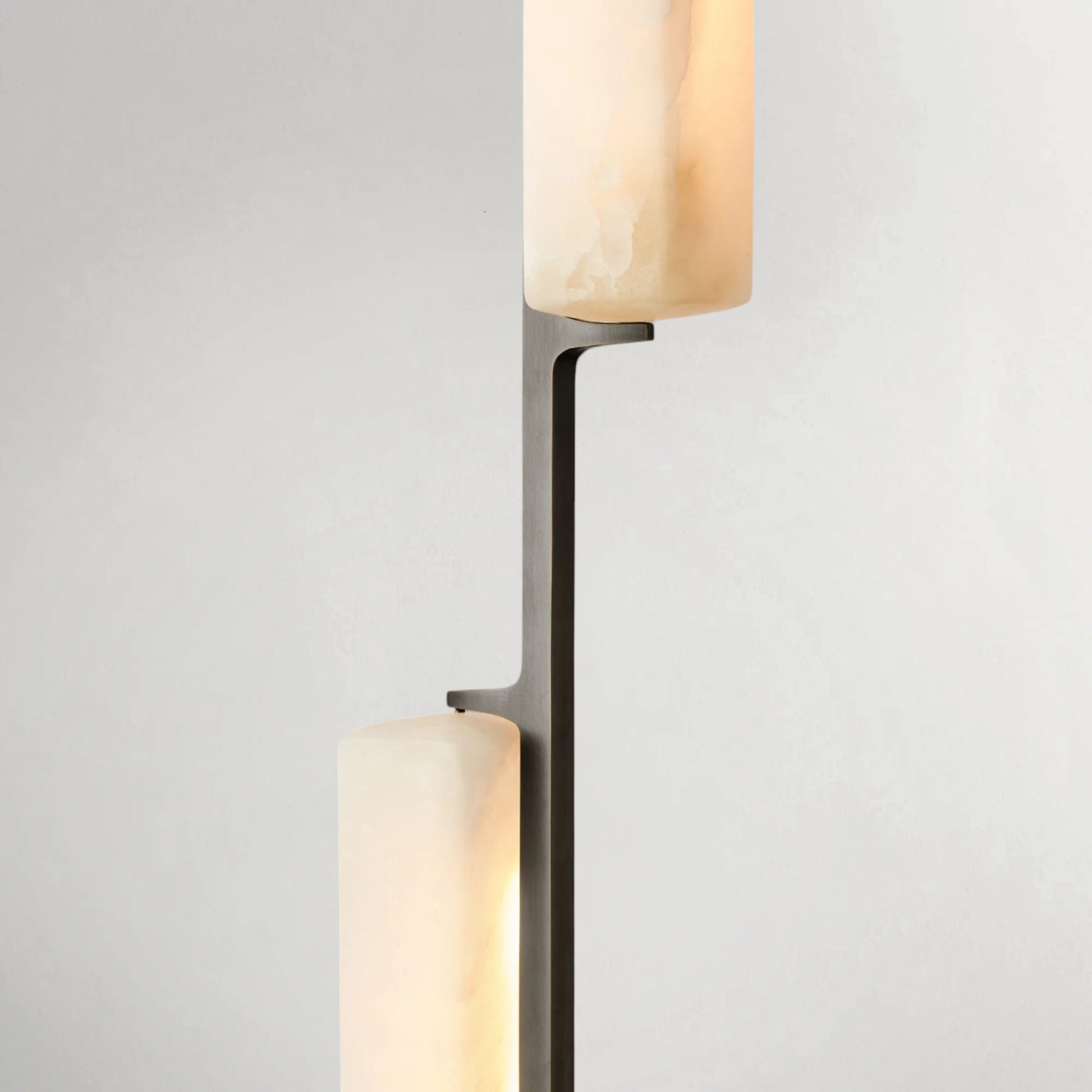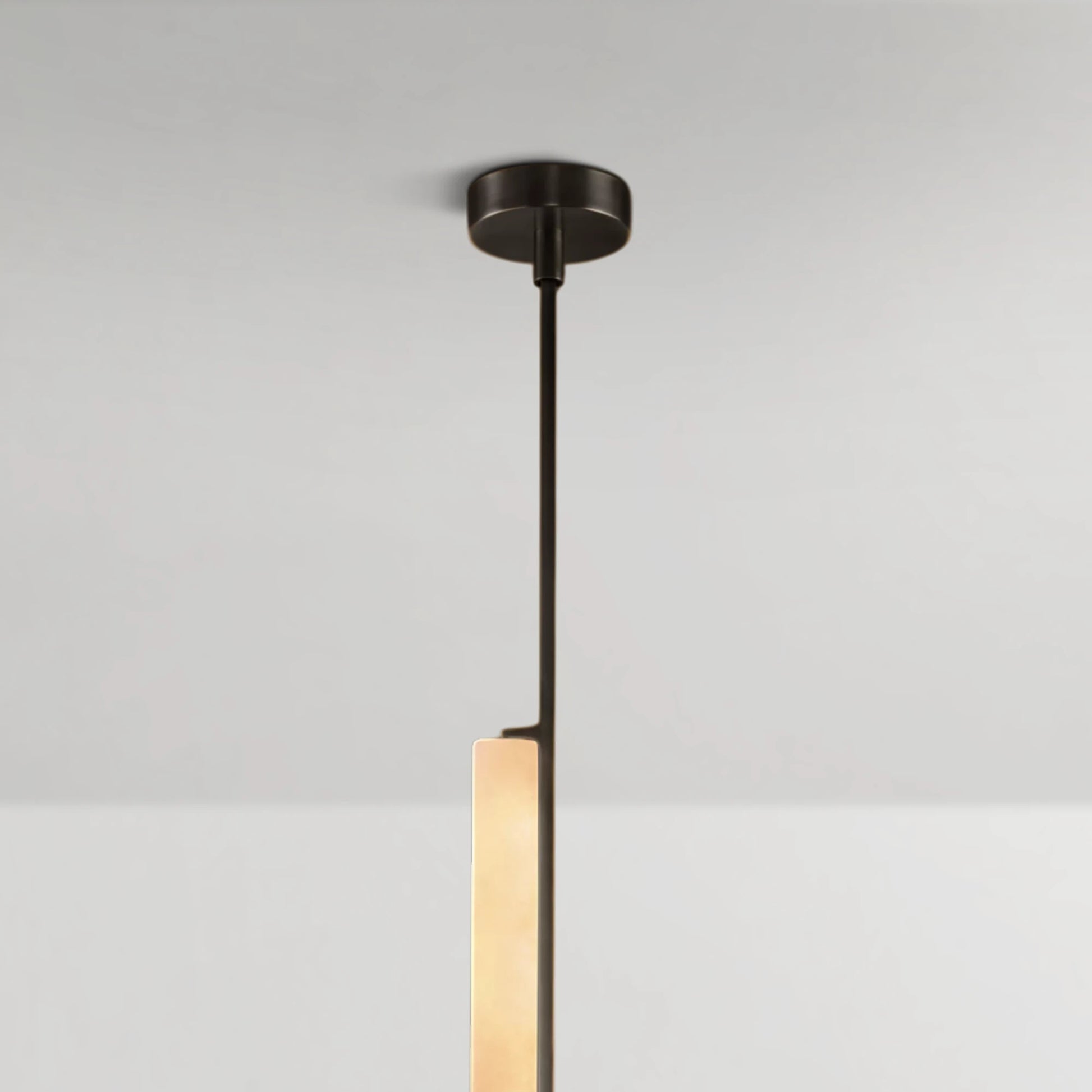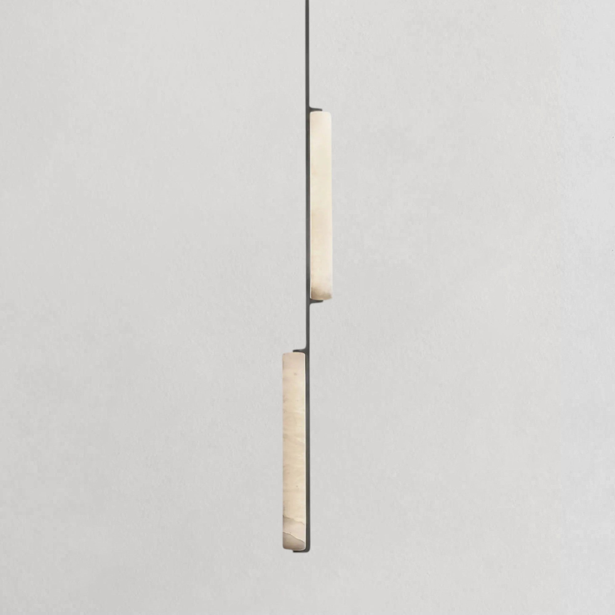 Inspired by the quiet elegance of 1960s Italian minimalism, this pendant features two vertically aligned alabaster prisms suspended from a refined brass drop, forming a composition that is both sculptural and restrained. The translucent stone softly diffuses a warm, candle-like glow, revealing natural veining that adds depth and individuality to each piece. With its slender proportions and balanced form, it introduces a refined vertical accent ideal for dining areas, bedside settings, or layered lighting arrangements.