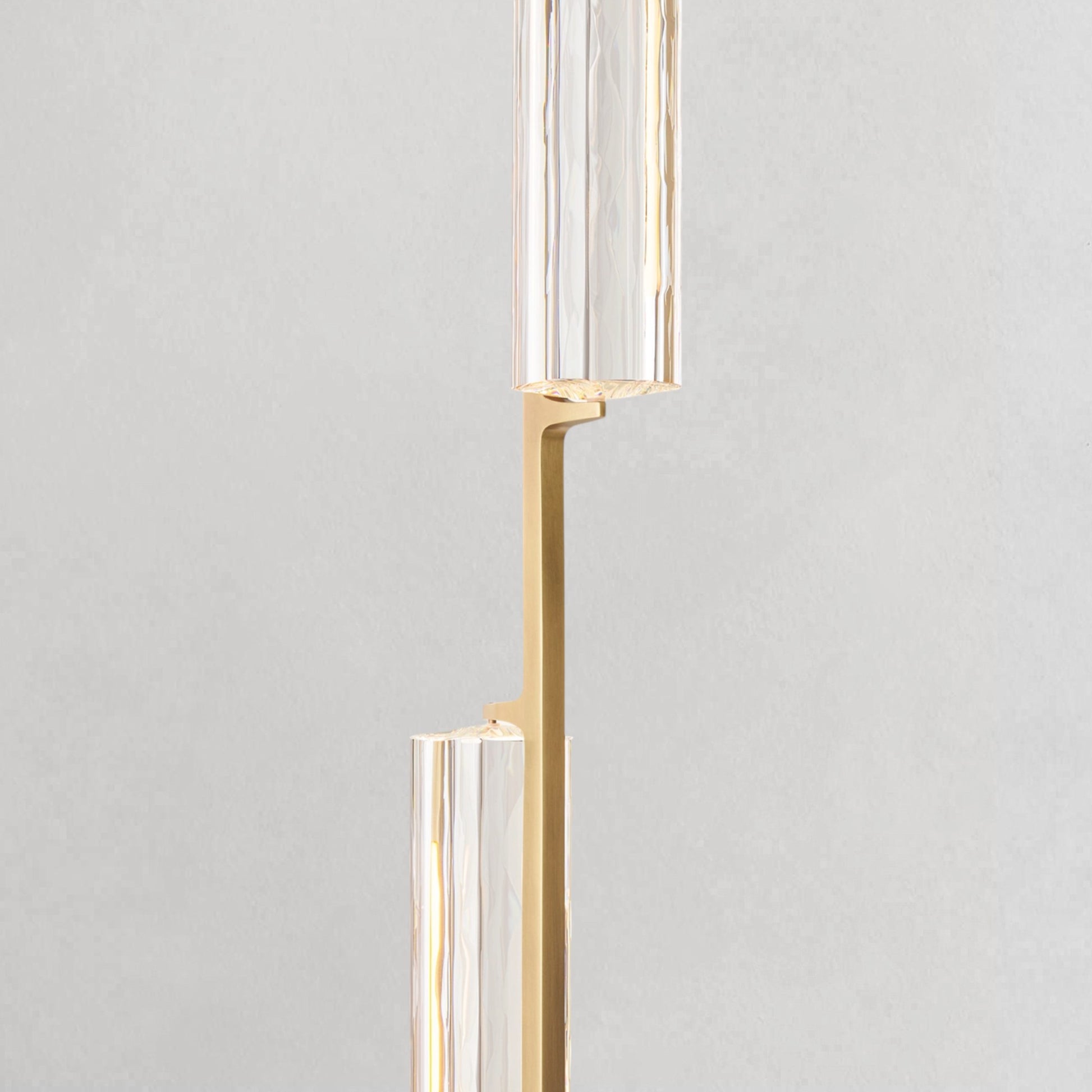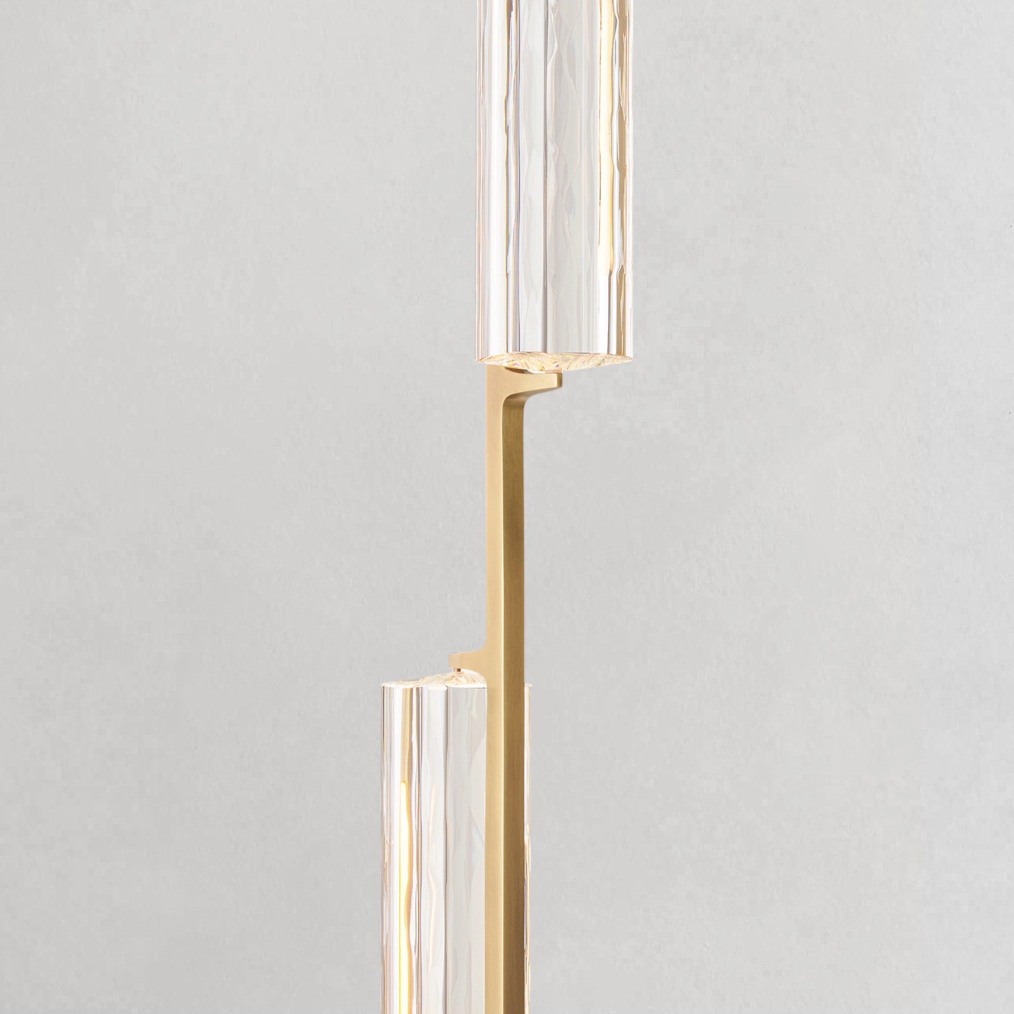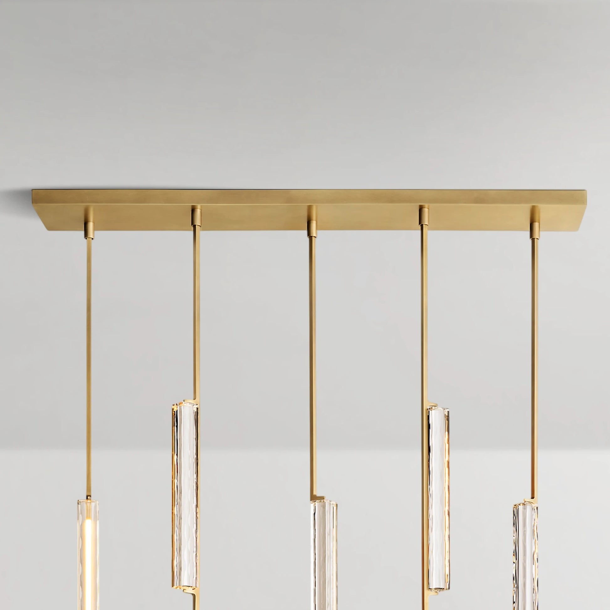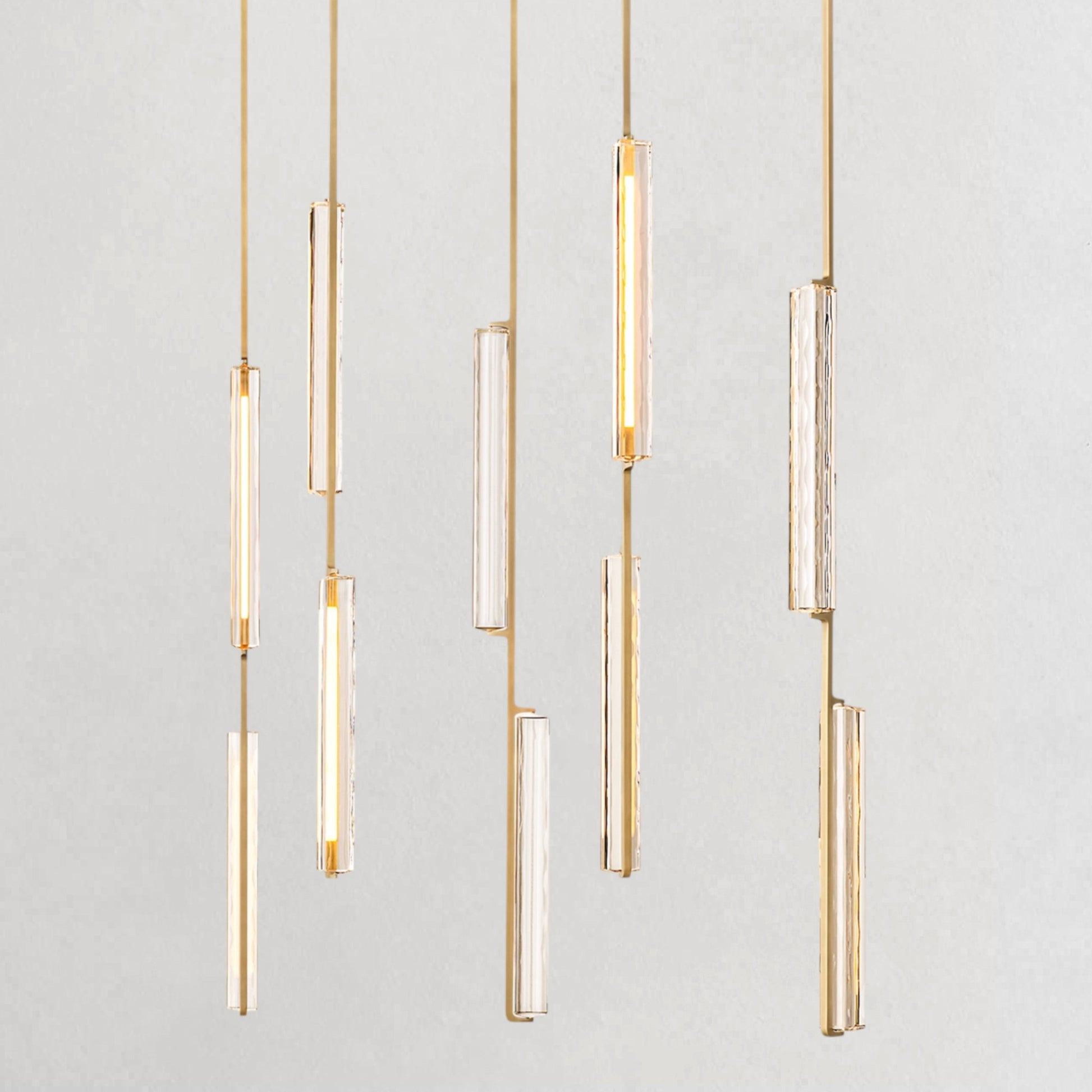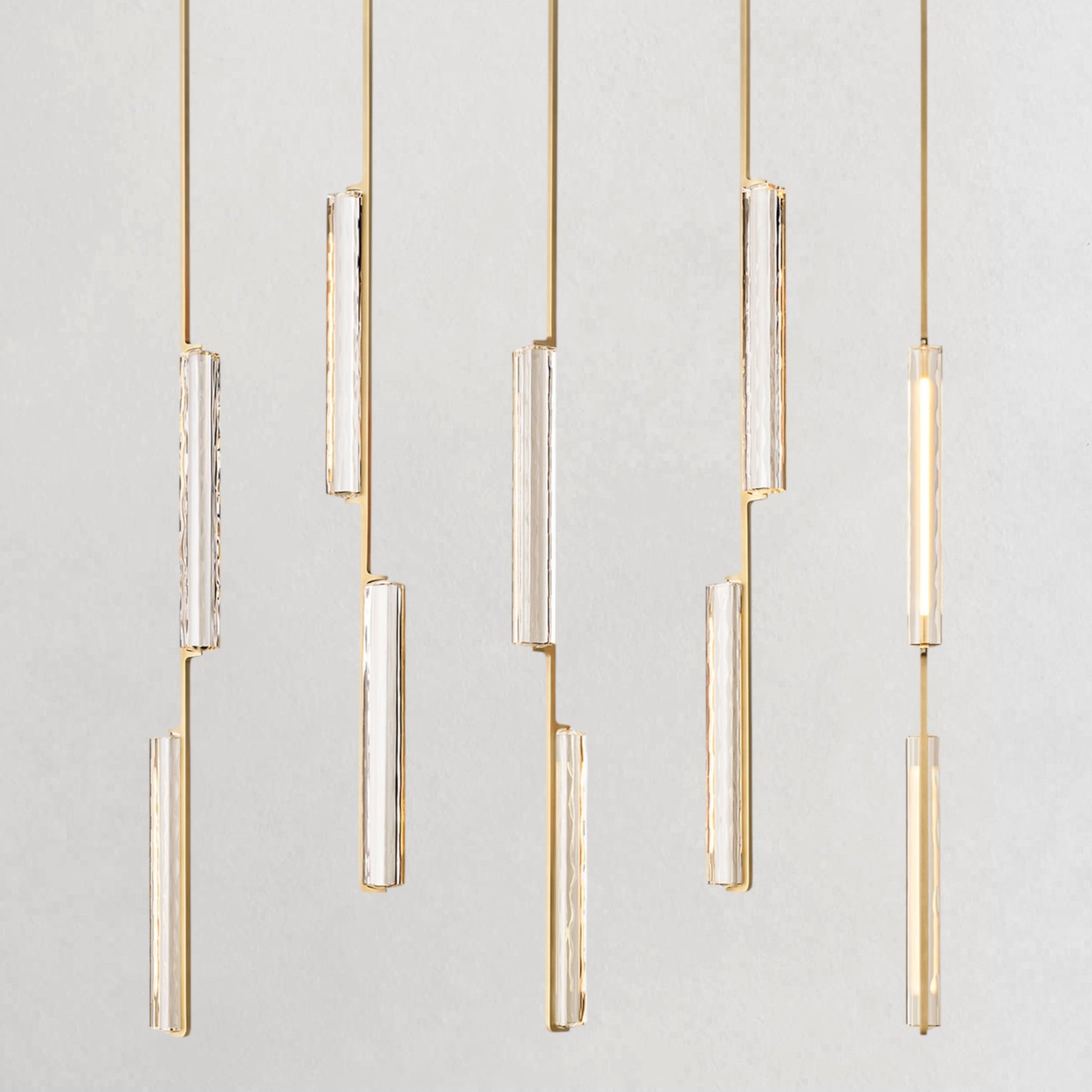 Inspired by the refined restraint of 1960s Italian minimalism, this chandelier showcases a cascading arrangement of hand-polished K9 crystal prisms suspended from slender brass drops, forming a composition that feels both architectural and ethereal. The textured crystal softly diffuses a warm, candle-like glow, while the elongated vertical lines introduce a sense of rhythm and balance. Understated yet striking, it creates a luminous focal point perfectly suited for dining spaces and interiors with elevated ceilings.