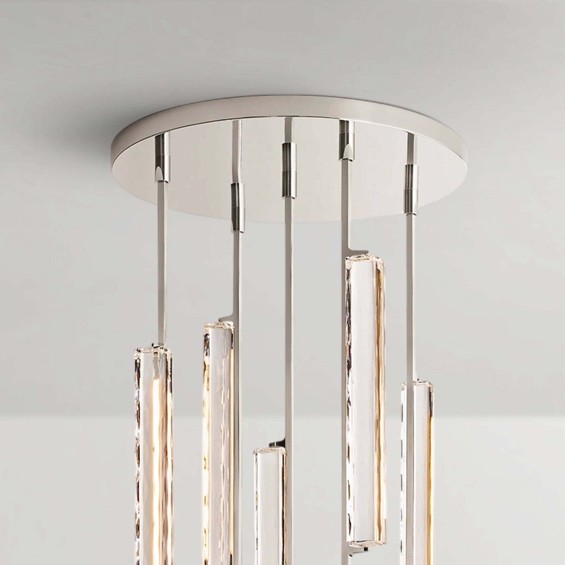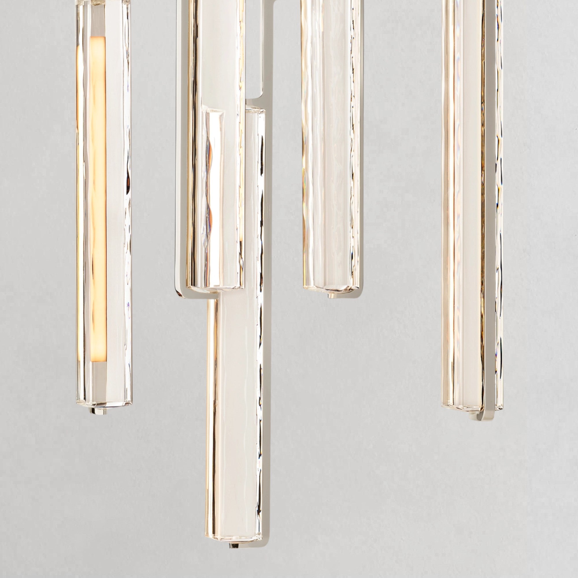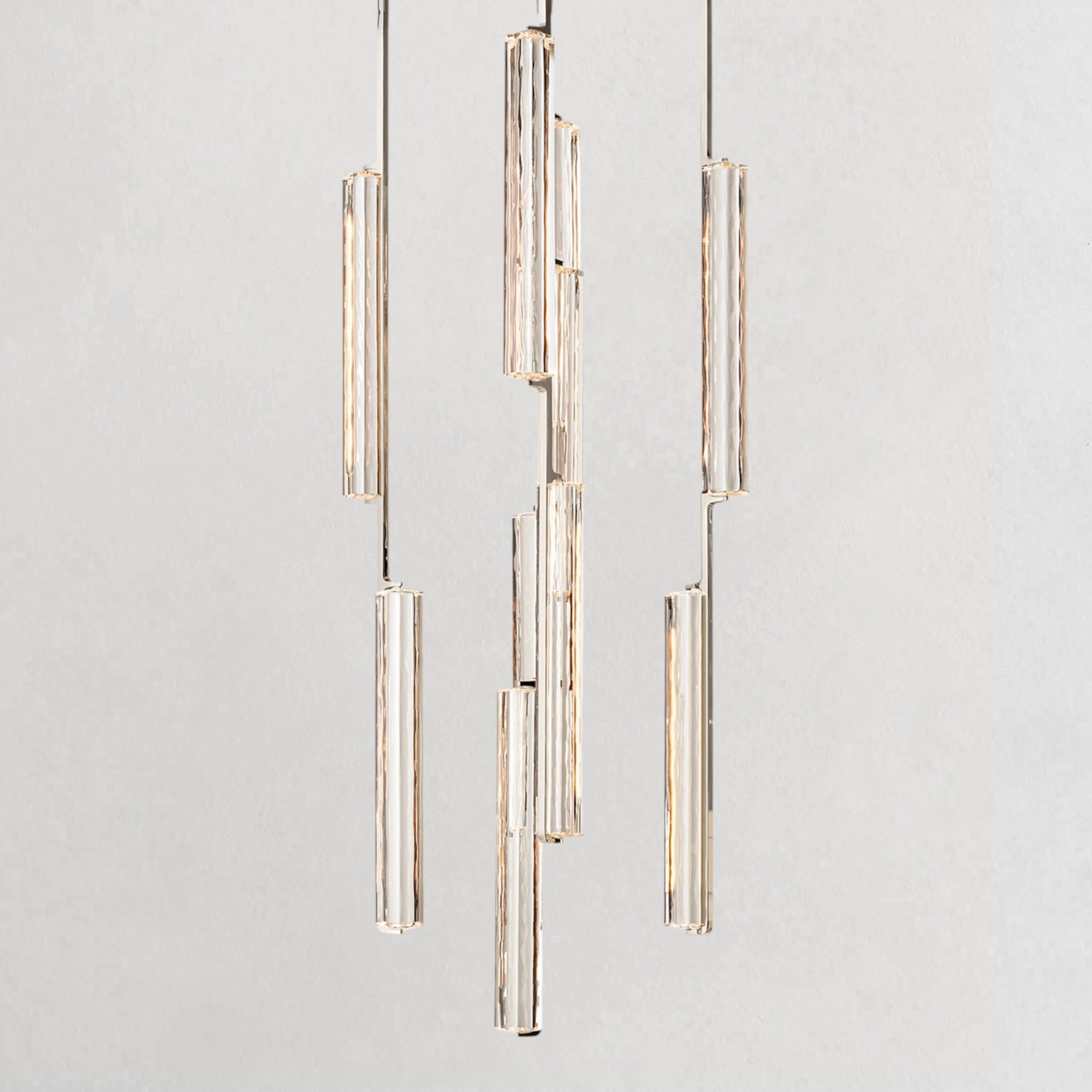 A refined interpretation of mid-century Italian minimalism, this chandelier descends in a rhythmic composition of crystal prisms suspended from slender brass drops. Each hand-polished K9 crystal element captures and refracts light, creating a cascading effect that feels both luminous and architectural. When illuminated, elongated LEDs glow through the faceted glass, producing a warm, candlelike ambiance with subtle movement and depth. Balanced between clarity and drama, it serves as a striking focal point for dining rooms and elevated interiors.