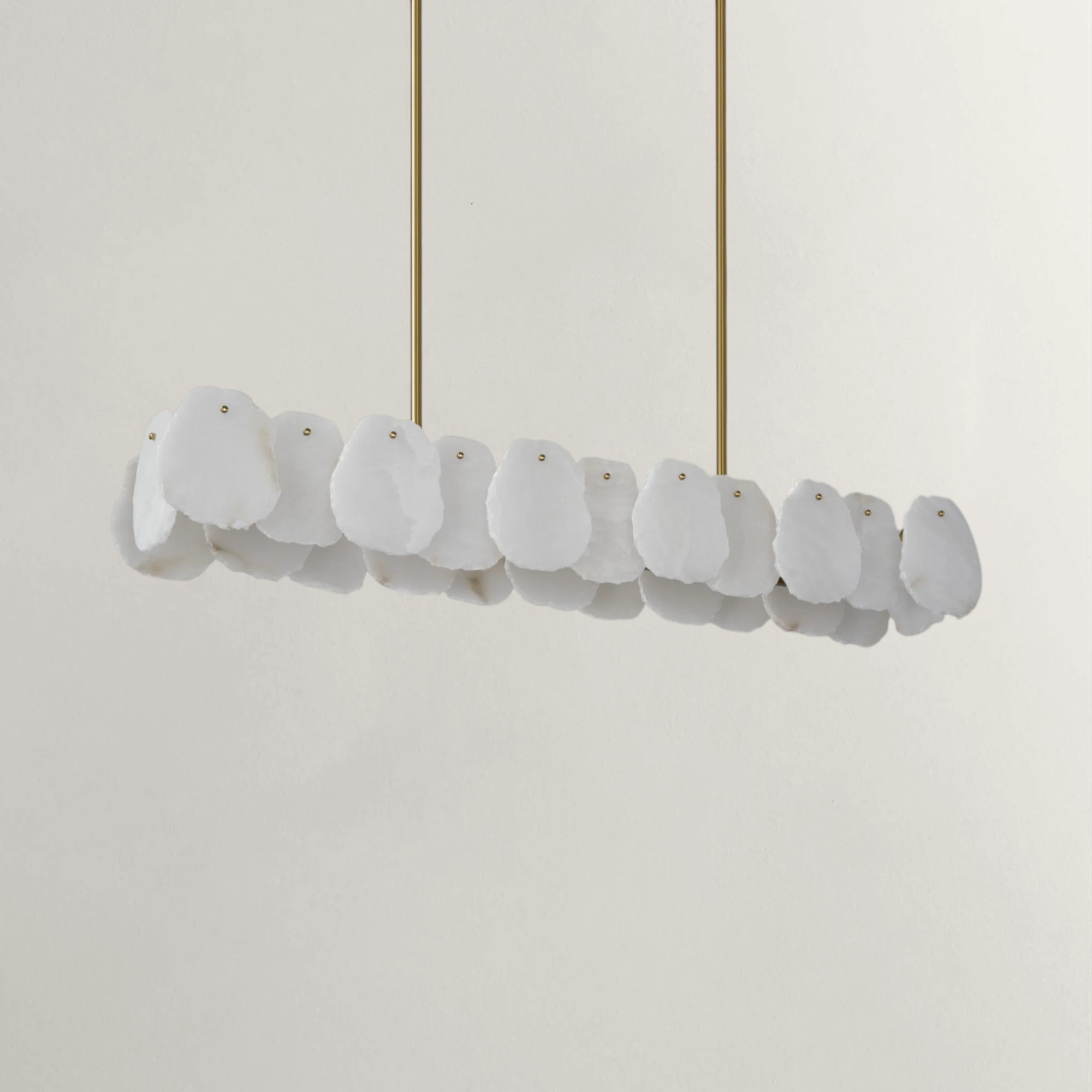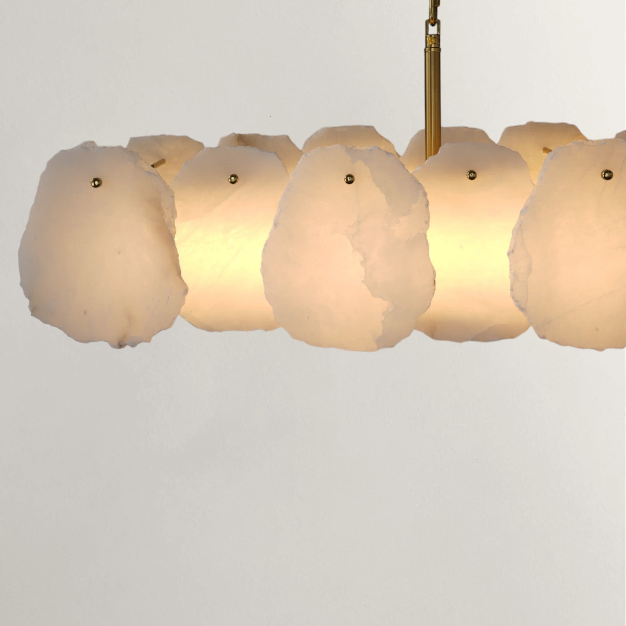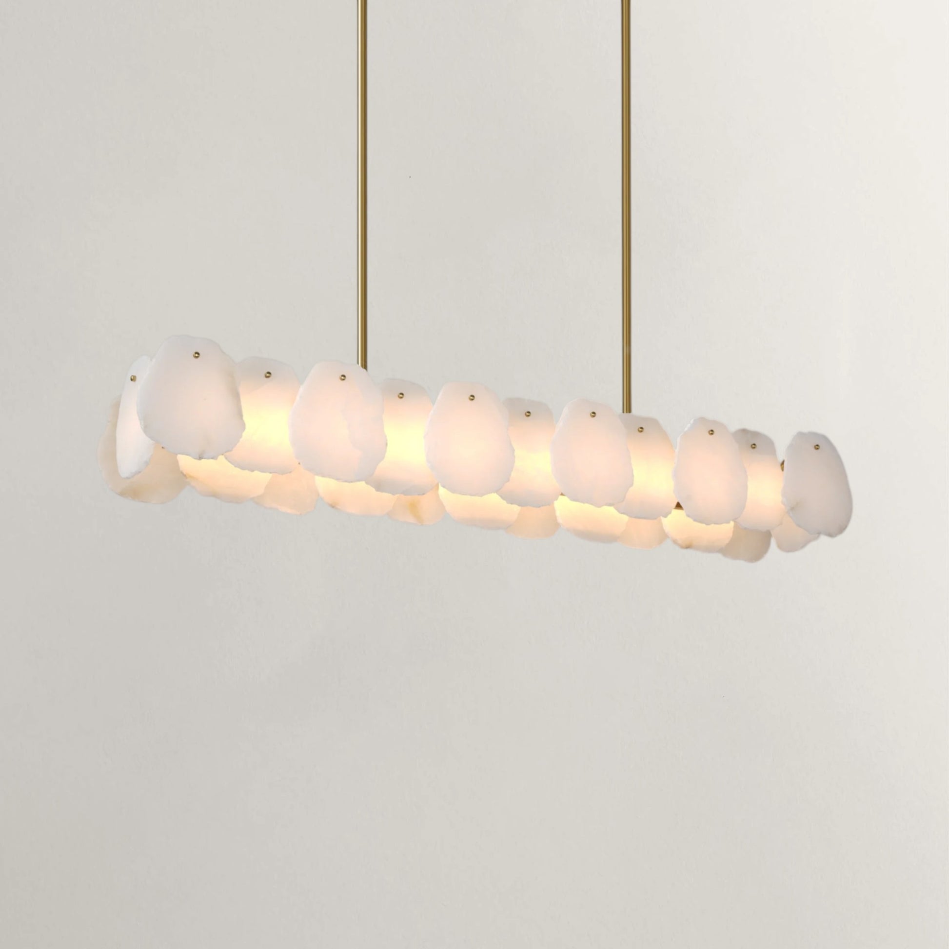 Inspired by the graceful motion of celestial orbits, this linear chandelier translates concentric forms into a refined horizontal composition. Hand-carved alabaster elements are paired with a streamlined metal frame, allowing light to diffuse softly through the natural stone and create a calm, lunar-like glow. Its elongated silhouette makes it an elegant centerpiece for dining tables, kitchen islands, or architectural spaces where sculptural lighting and ambient illumination come together.