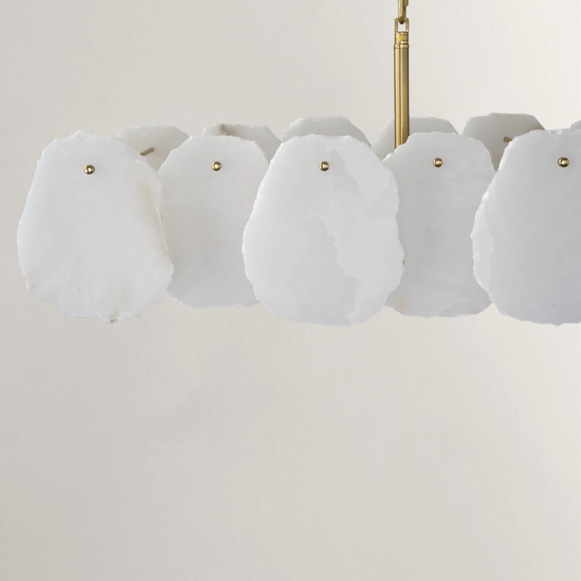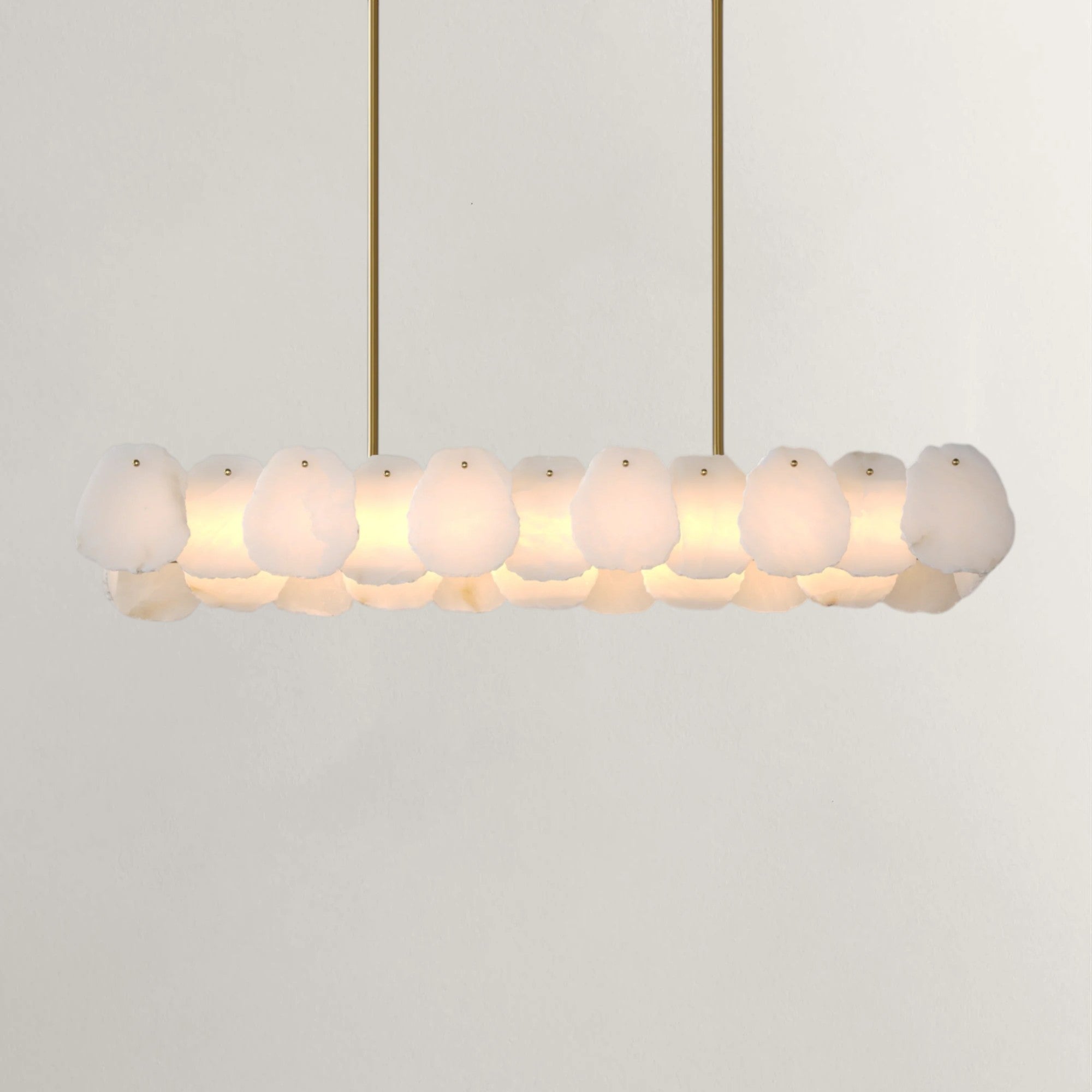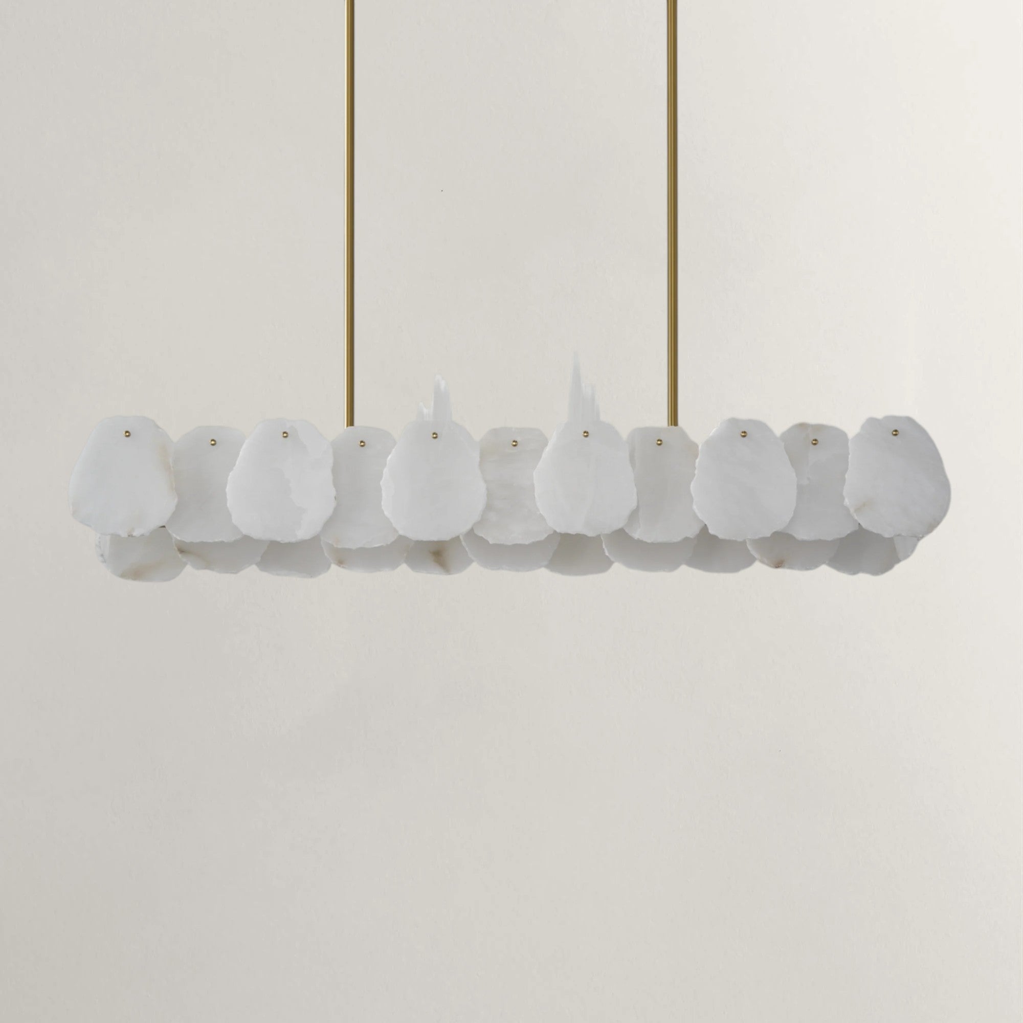 Inspired by the graceful motion of celestial orbits, this linear chandelier translates concentric forms into a refined horizontal composition. Hand-carved alabaster elements are paired with a streamlined metal frame, allowing light to diffuse softly through the natural stone and create a calm, lunar-like glow. Its elongated silhouette makes it an elegant centerpiece for dining tables, kitchen islands, or architectural spaces where sculptural lighting and ambient illumination come together.