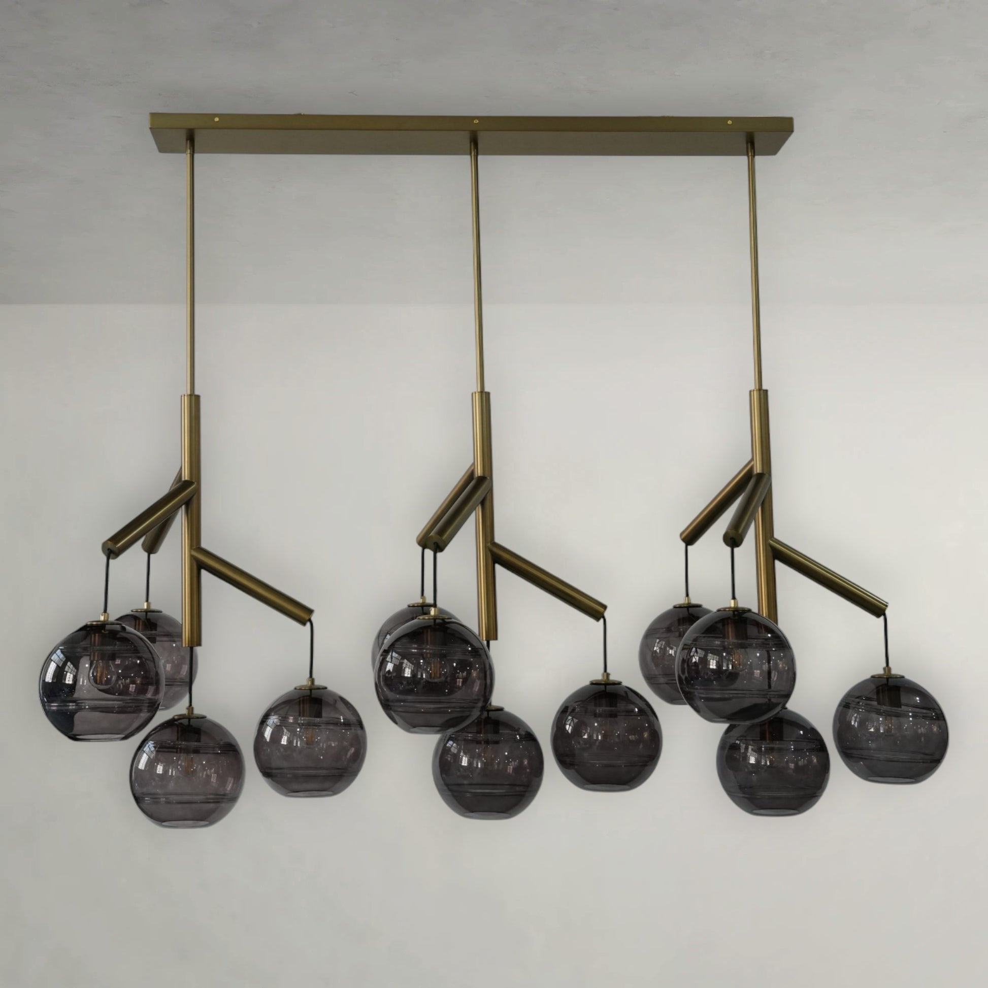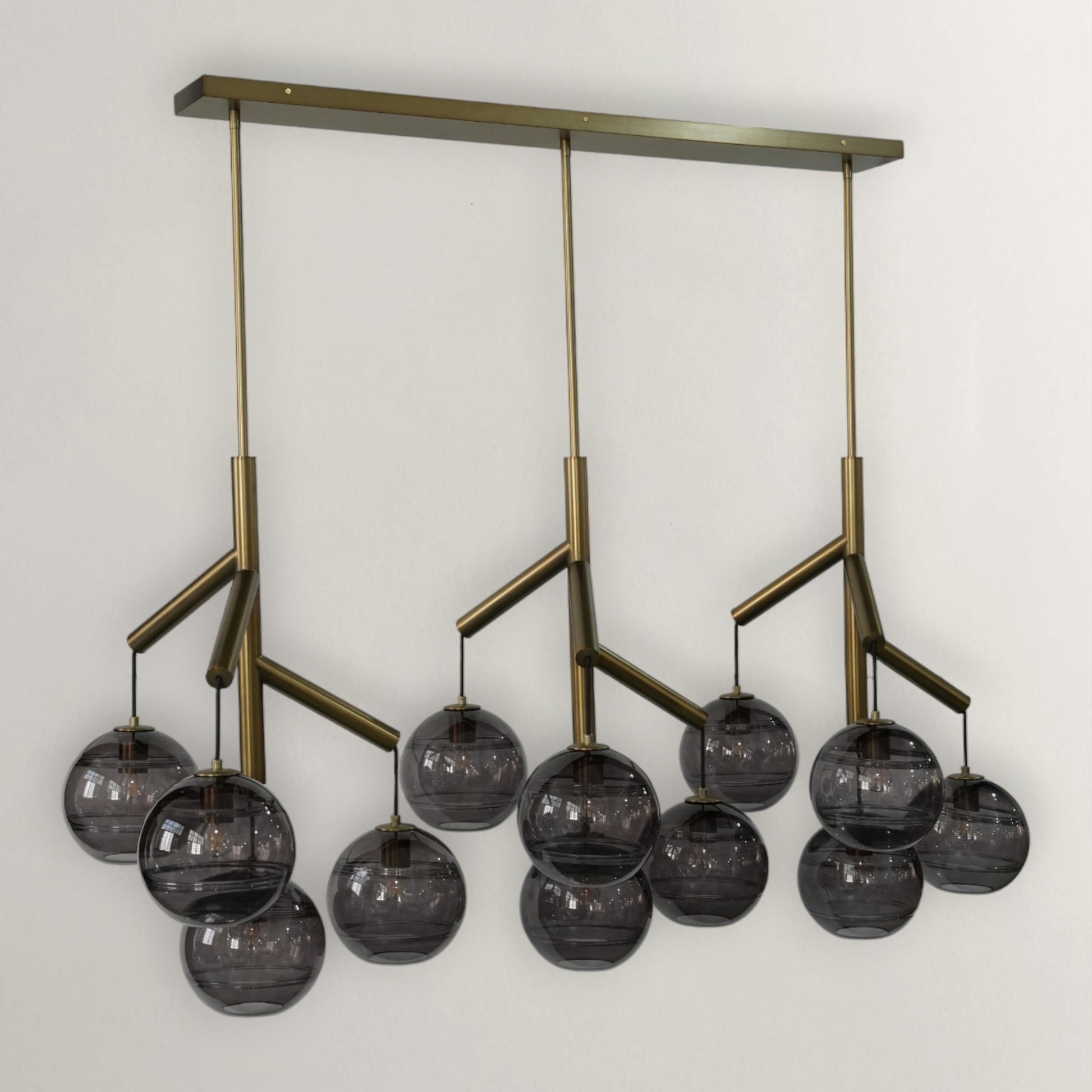 A striking expression of modern artistry, this sculptural chandelier reimagines the traditional form through a refined, deconstructed silhouette. Suspended from a sleek, branch-like structure, luminous glass globes appear to float effortlessly, each connected by textured cords that introduce a subtle sense of movement and contrast. The hand-blown glass reveals delicate internal layering, creating depth and a softly diffused glow that enriches the surrounding space. Whether placed above a kitchen island or as a centerpiece in a dining or living area, this piece delivers a sophisticated ambiance with a warm, inviting radiance.