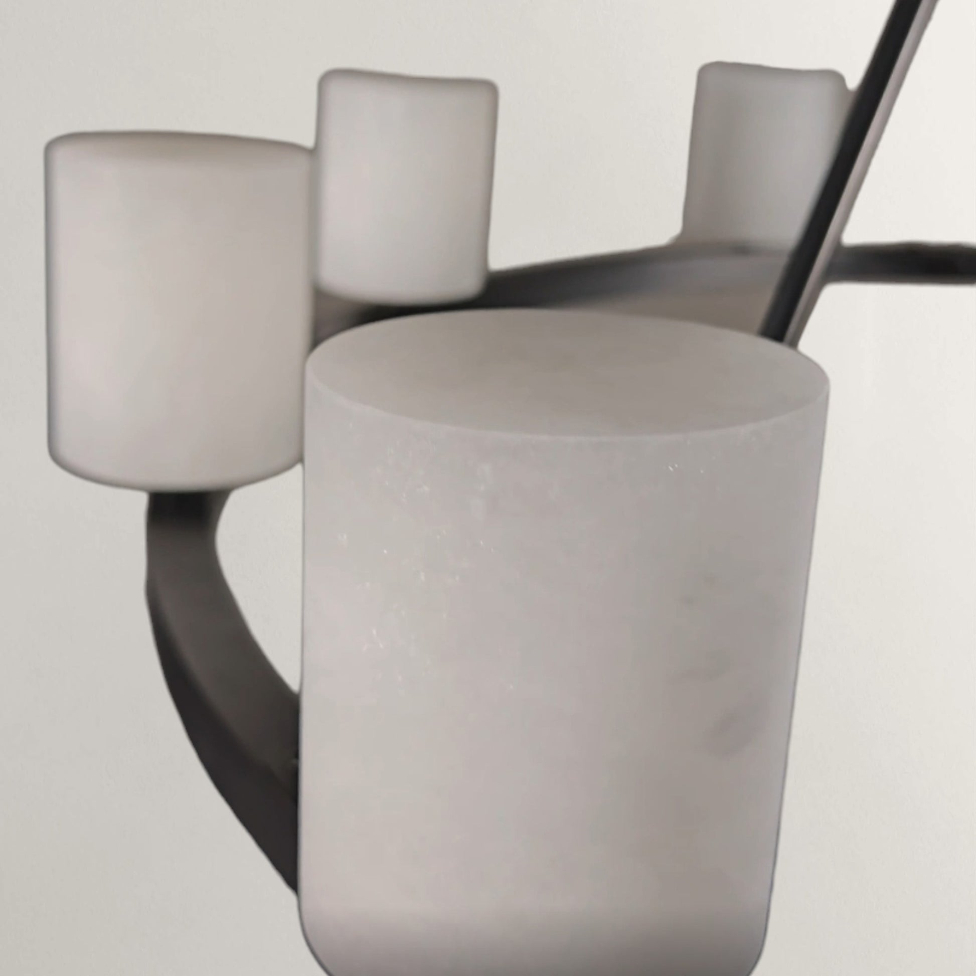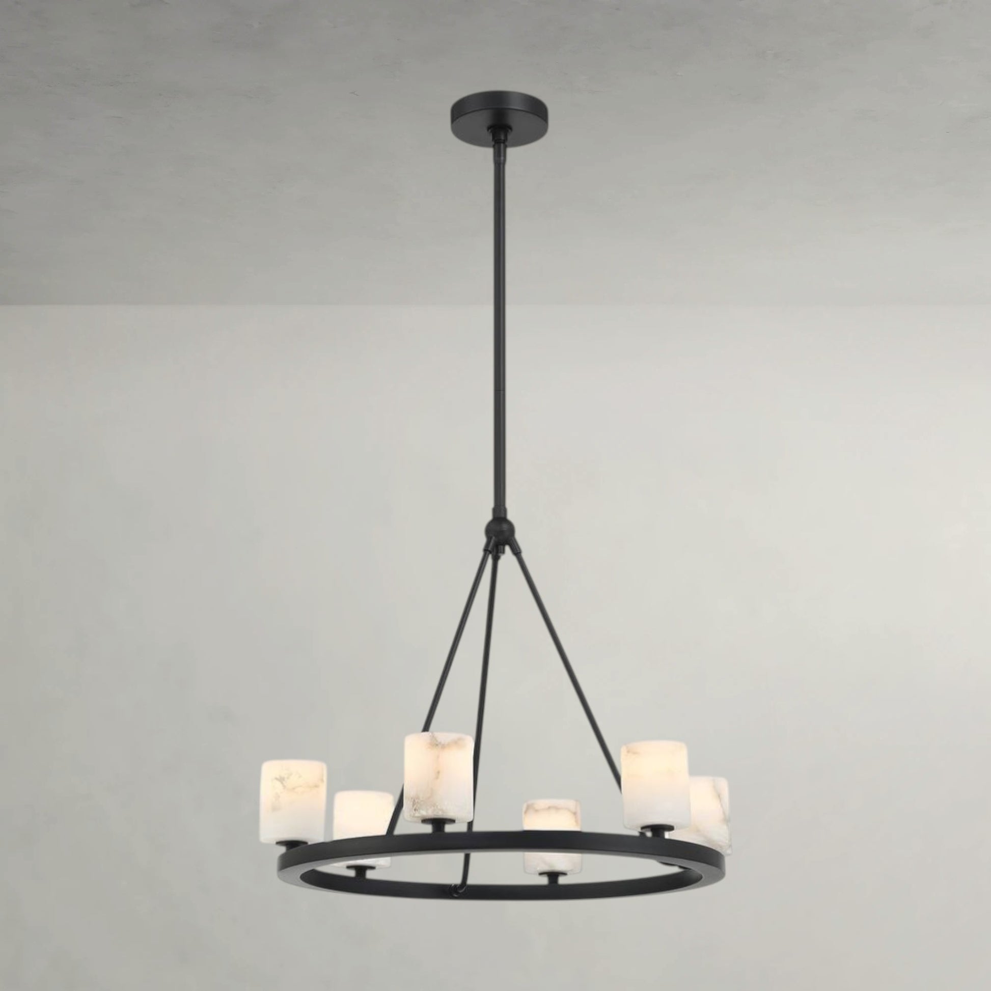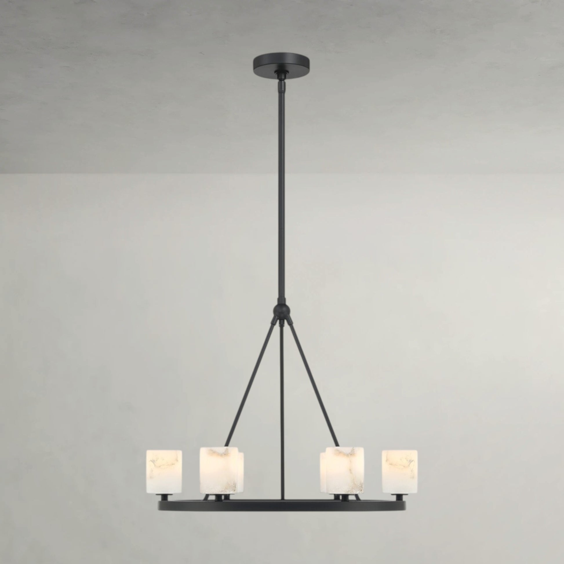 A study in modern restraint, this fixture blends industrial structure with refined detailing to create a bold yet understated presence. Its matte black framework is composed of clean, linear elements, while precision-cut stone accents introduce a subtle contrast of texture and warmth. The composition feels both architectural and balanced, delivering a soft, ambient glow that enhances contemporary interiors with depth, clarity, and quiet sophistication.