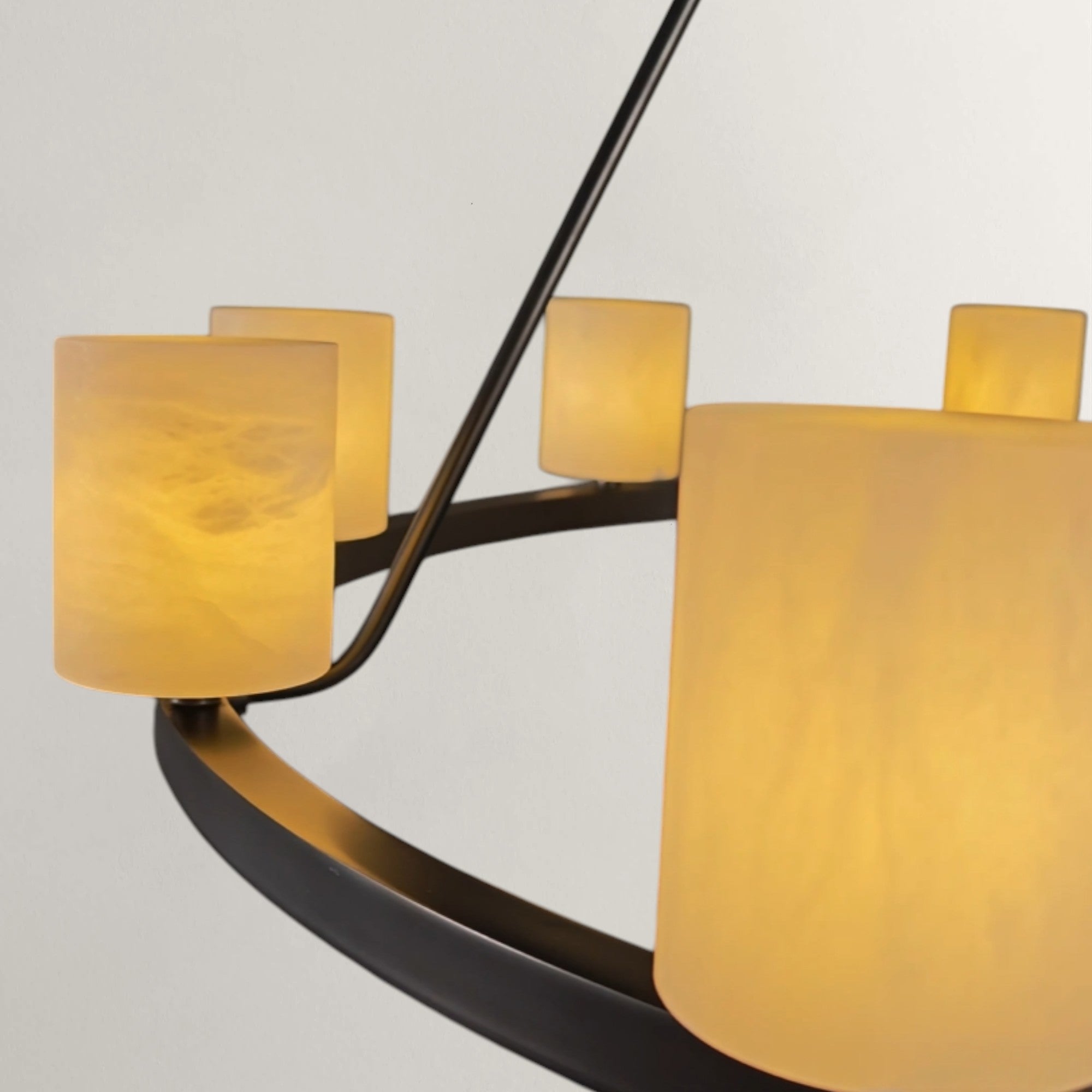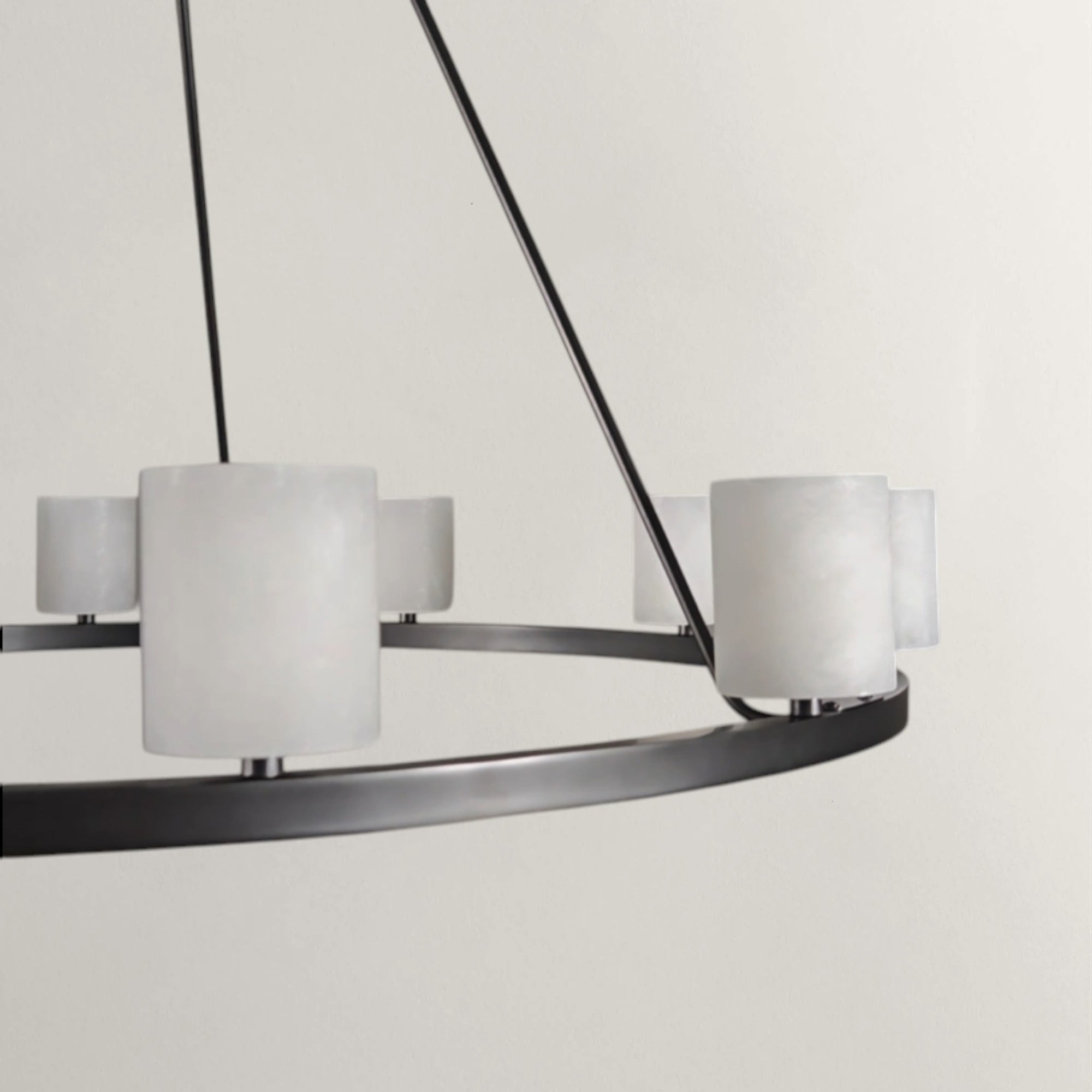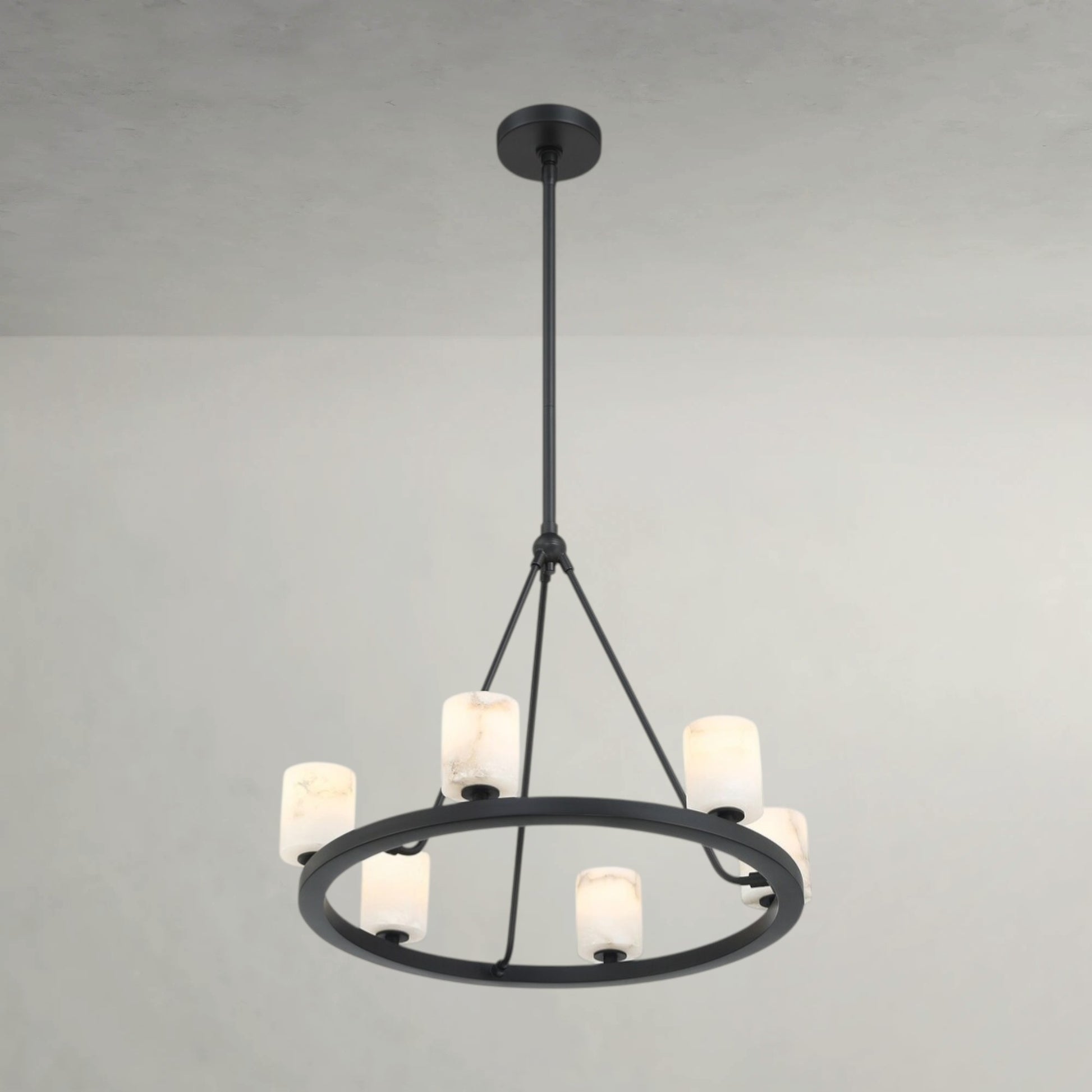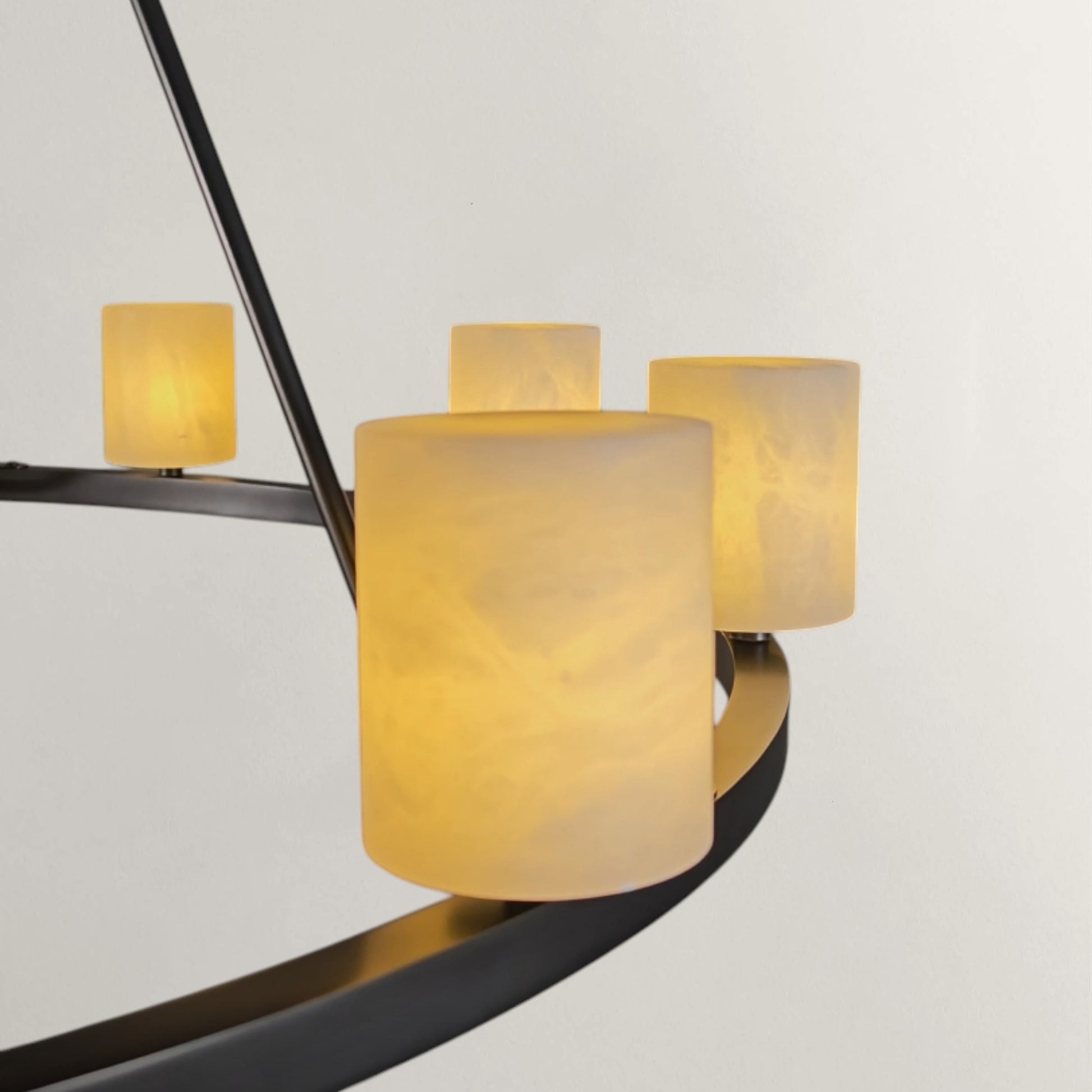 A study in modern restraint, this fixture blends industrial structure with refined detailing to create a bold yet understated presence. Its matte black framework is composed of clean, linear elements, while precision-cut stone accents introduce a subtle contrast of texture and warmth. The composition feels both architectural and balanced, delivering a soft, ambient glow that enhances contemporary interiors with depth, clarity, and quiet sophistication.