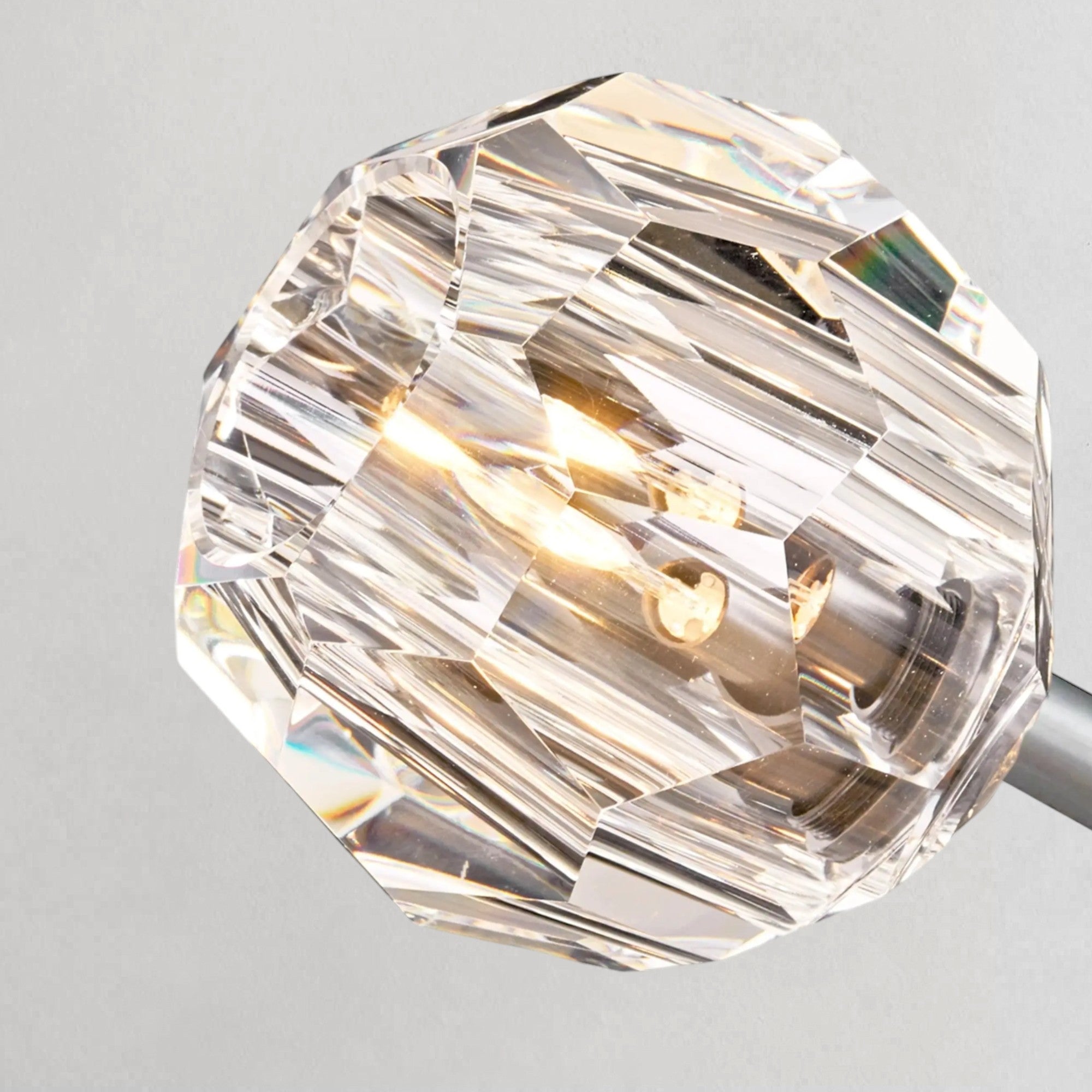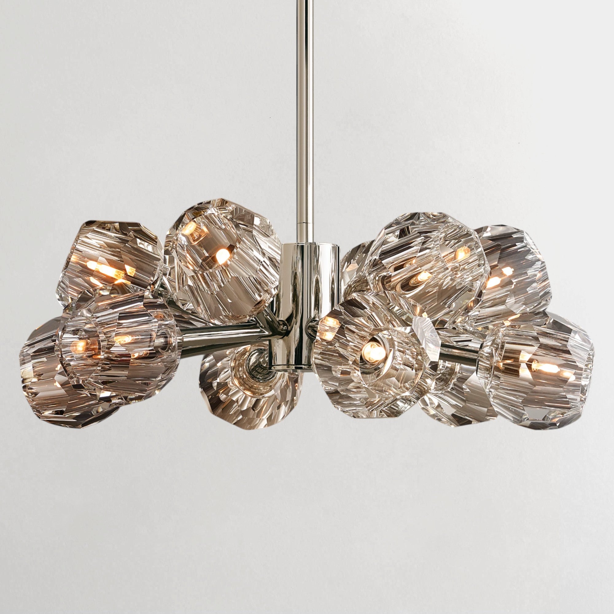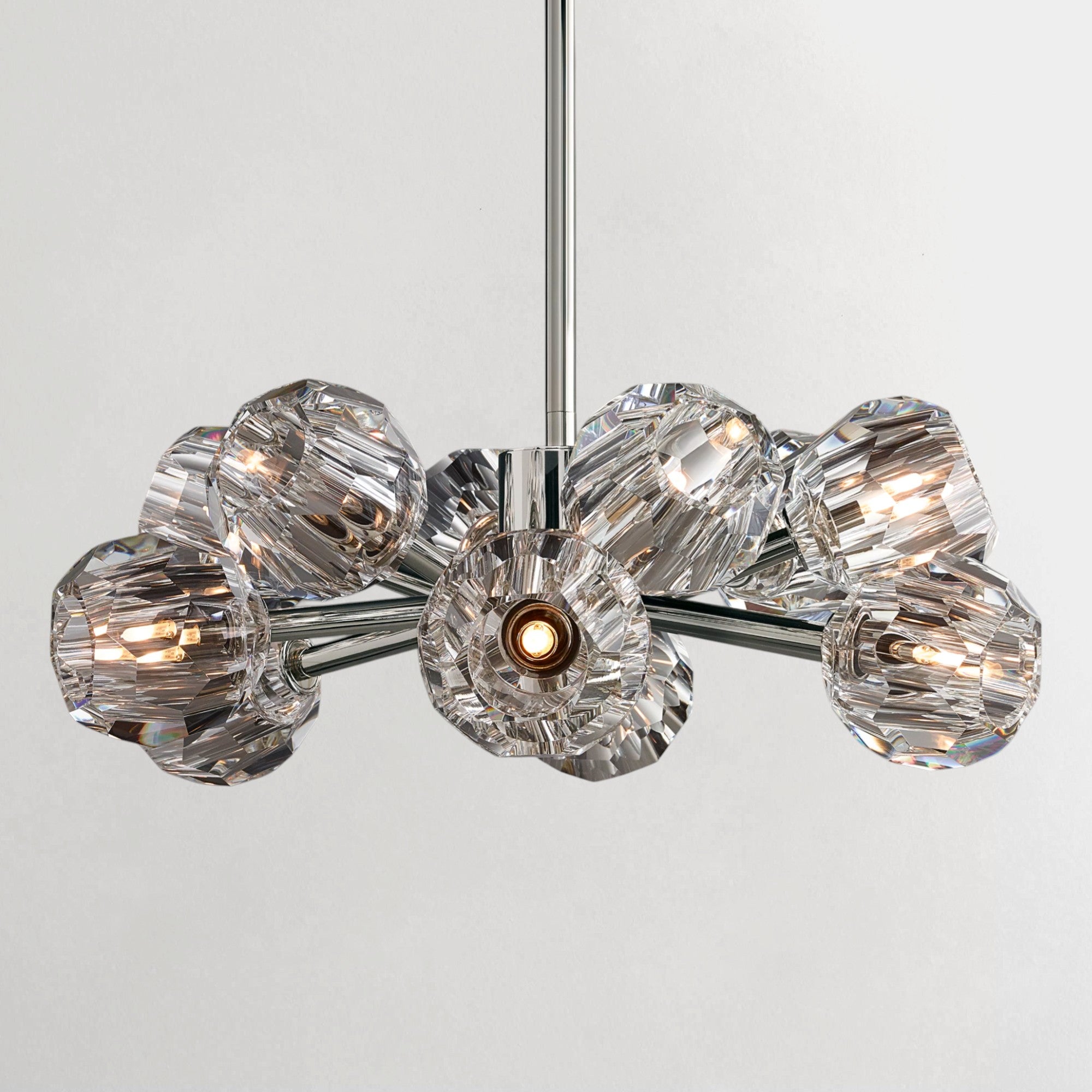 Defined by clarity, proportion, and material precision, this chandelier transforms solid brass and faceted crystal into a refined architectural composition. Each sphere is meticulously hand-polished to refract light with subtle brilliance, creating a luminous interplay that evolves throughout the space. Inspired by mid-century restraint, the silhouette remains clean and balanced, allowing the richness of materials to take focus—delivering a presence that is both striking and quietly sophisticated.