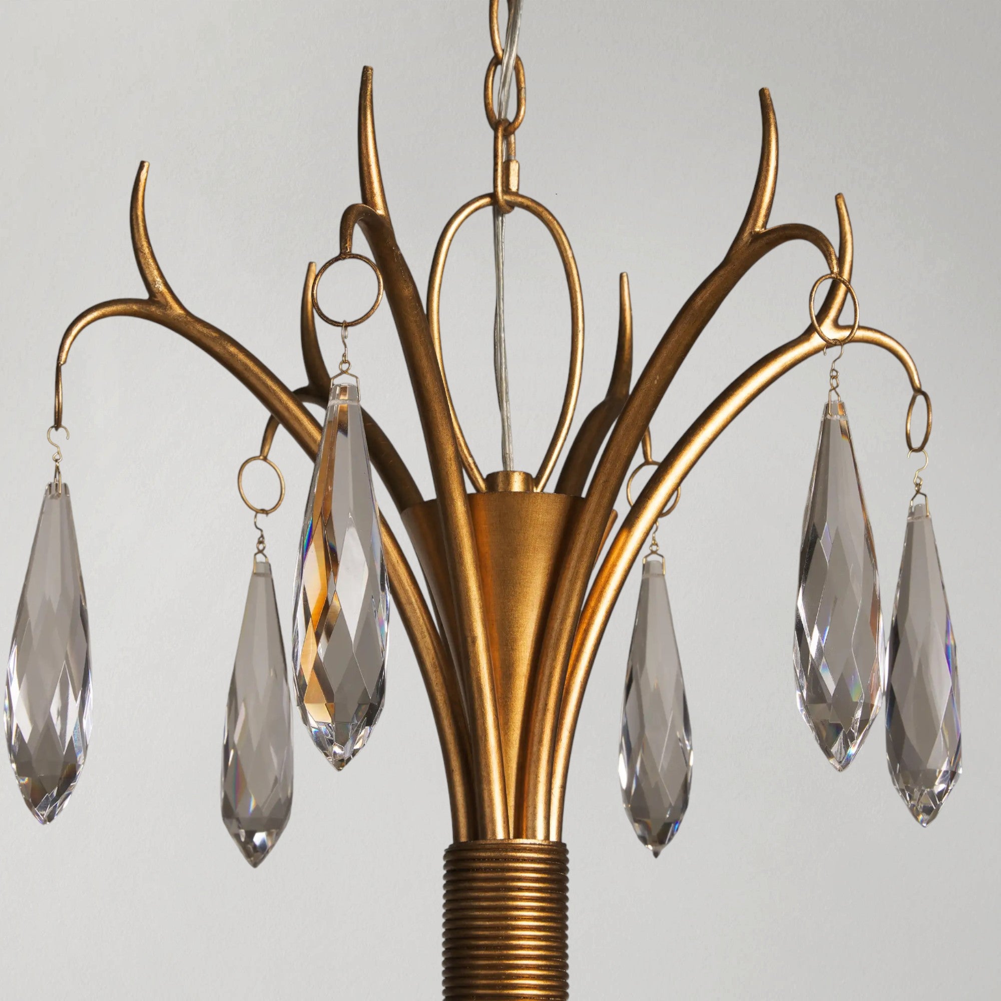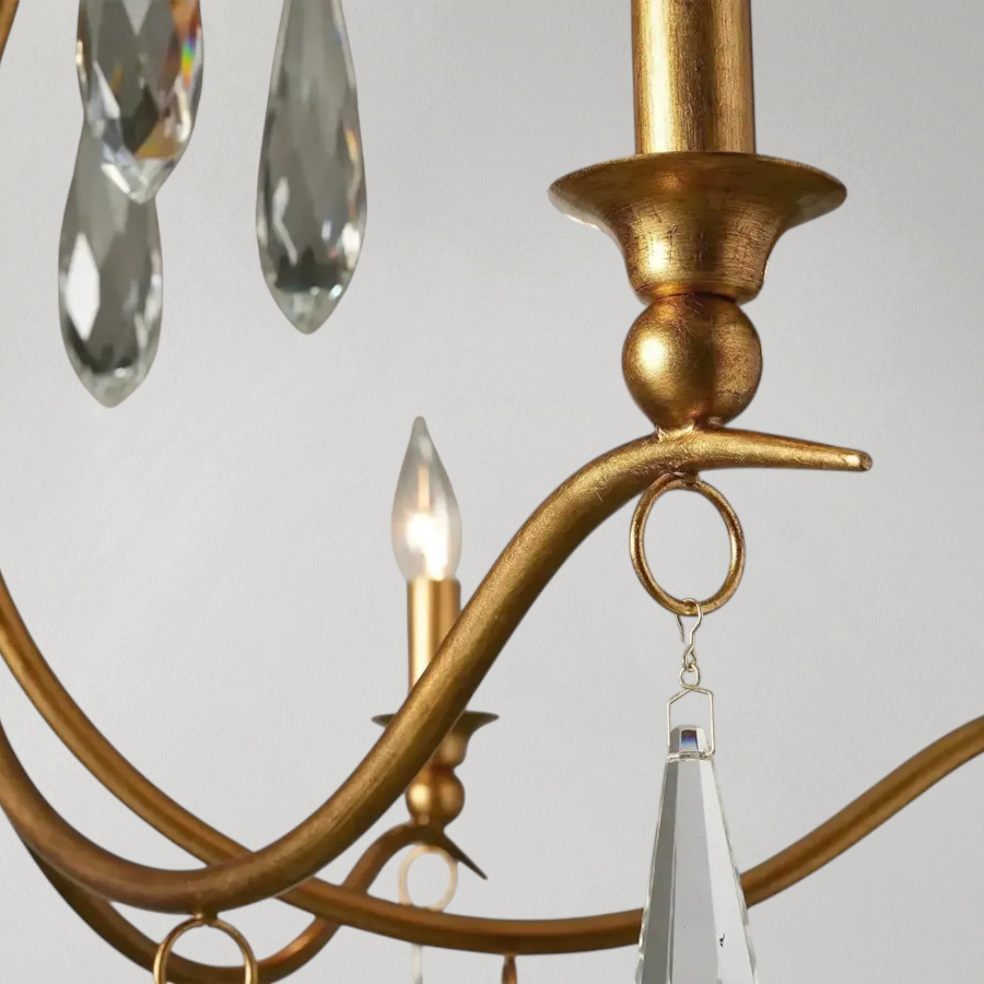 This chandelier features a grand silhouette accented with 18 shimmering crystal drops that catch and reflect light when illuminated. Its generous scale and hand-applied gold leaf finish create a warm, refined presence, allowing the fixture to stand out as a focal point. Balanced proportions and decorative detailing make it an elegant choice for living rooms, dining areas, and rooms with higher ceilings.