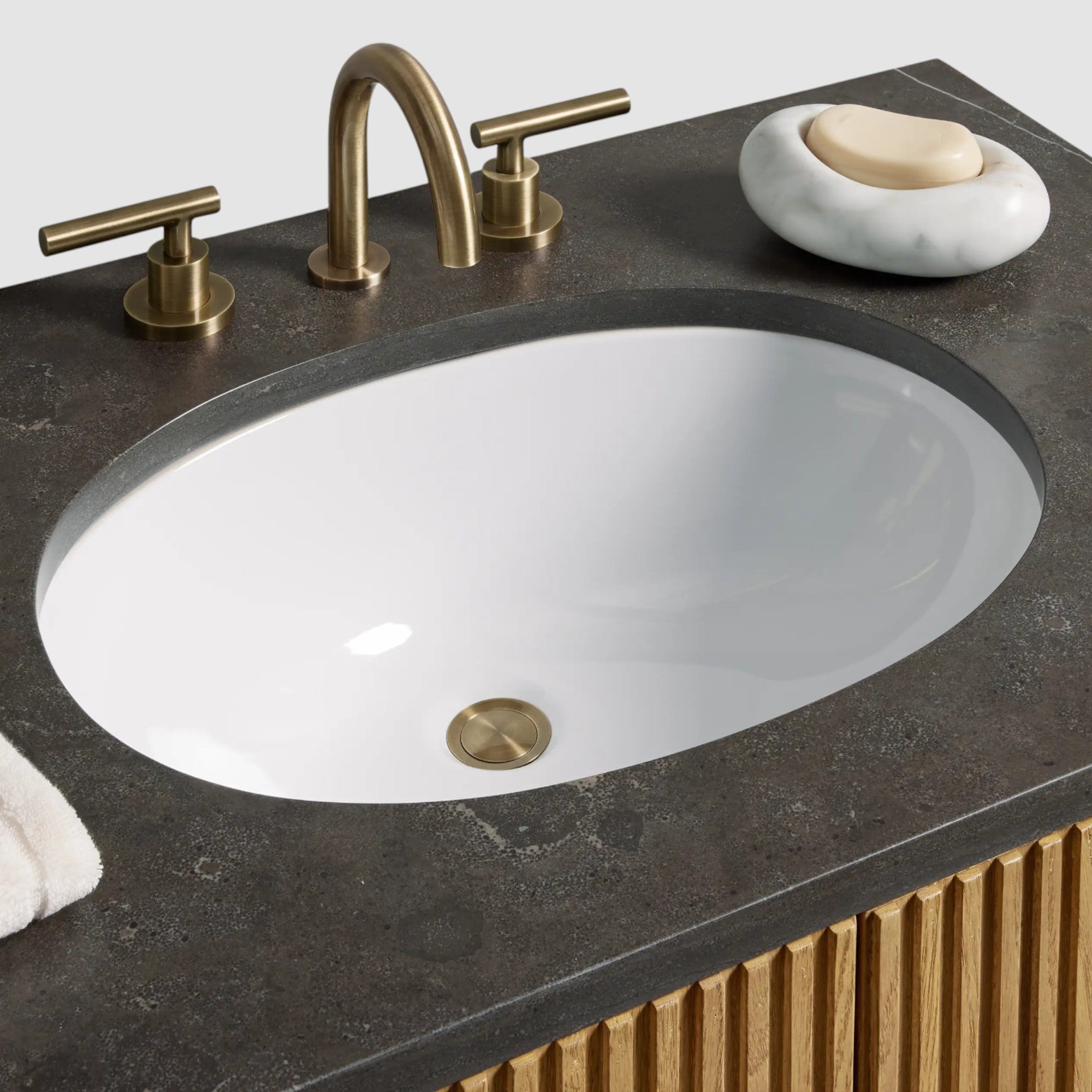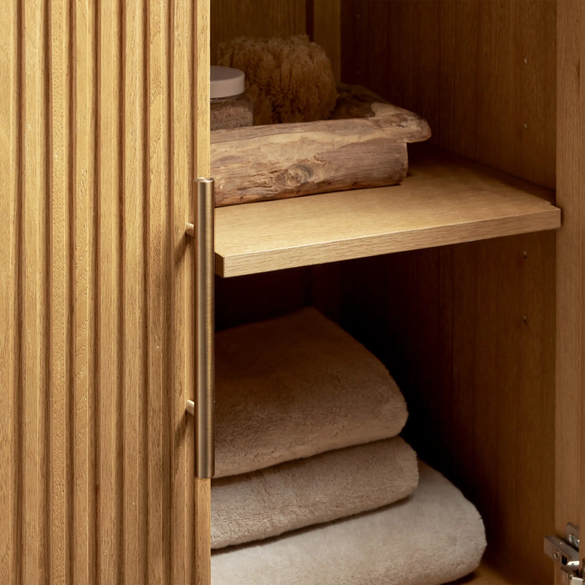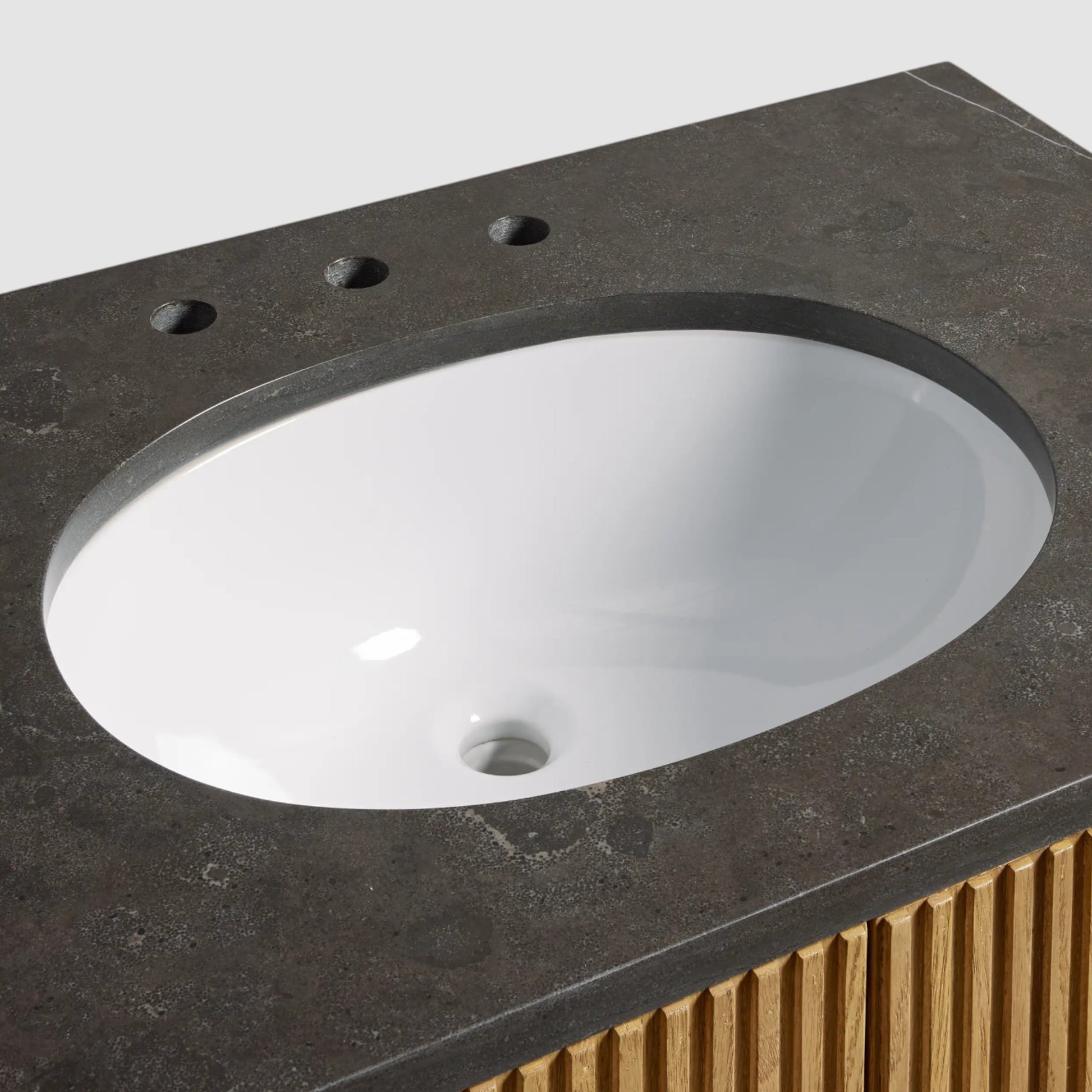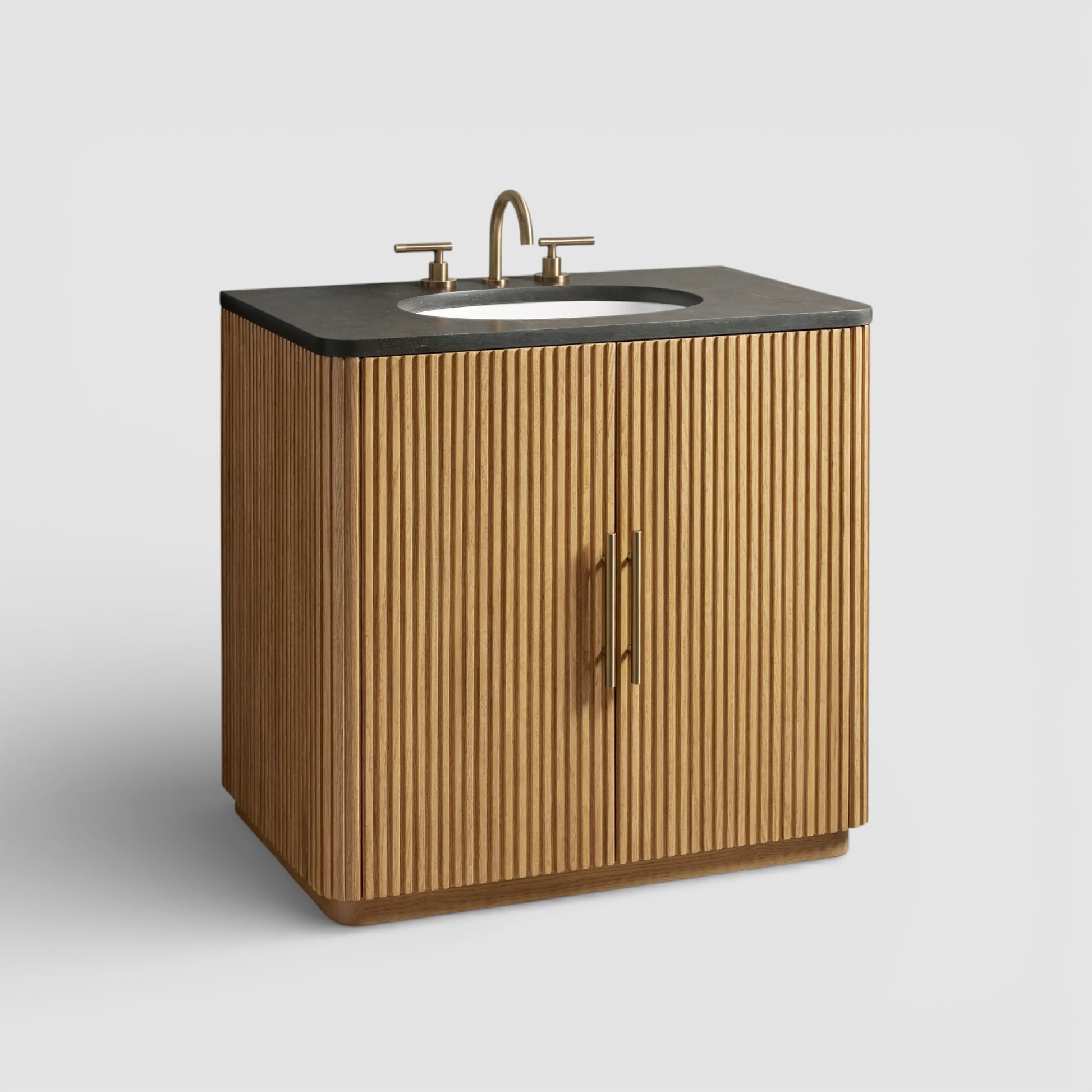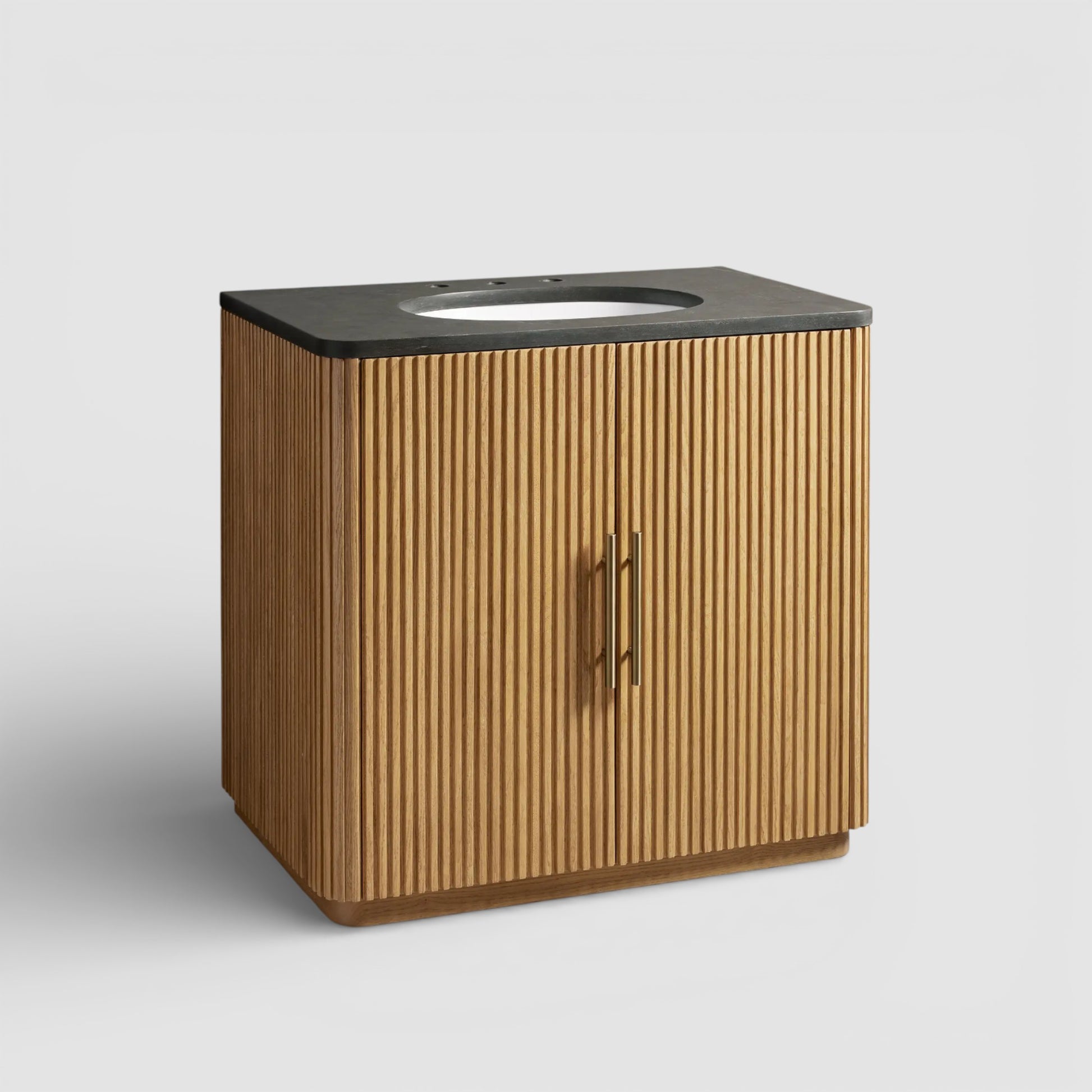 Inspired by the quiet beauty of natural materials, this bath vanity features vertically reeded wood detailing that brings subtle rhythm and texture to the space. Crafted from oak wood and marine-grade plywood, it is topped with a finely honed natural stone surface that highlights organic depth and movement, offering a refined balance of visual warmth and everyday functionality.