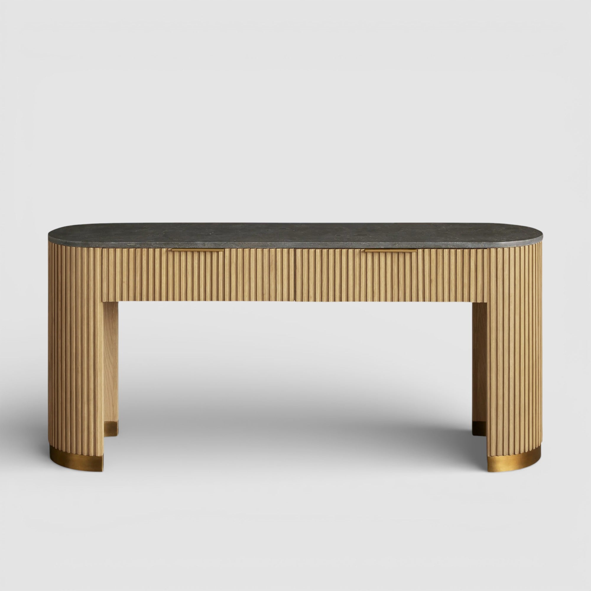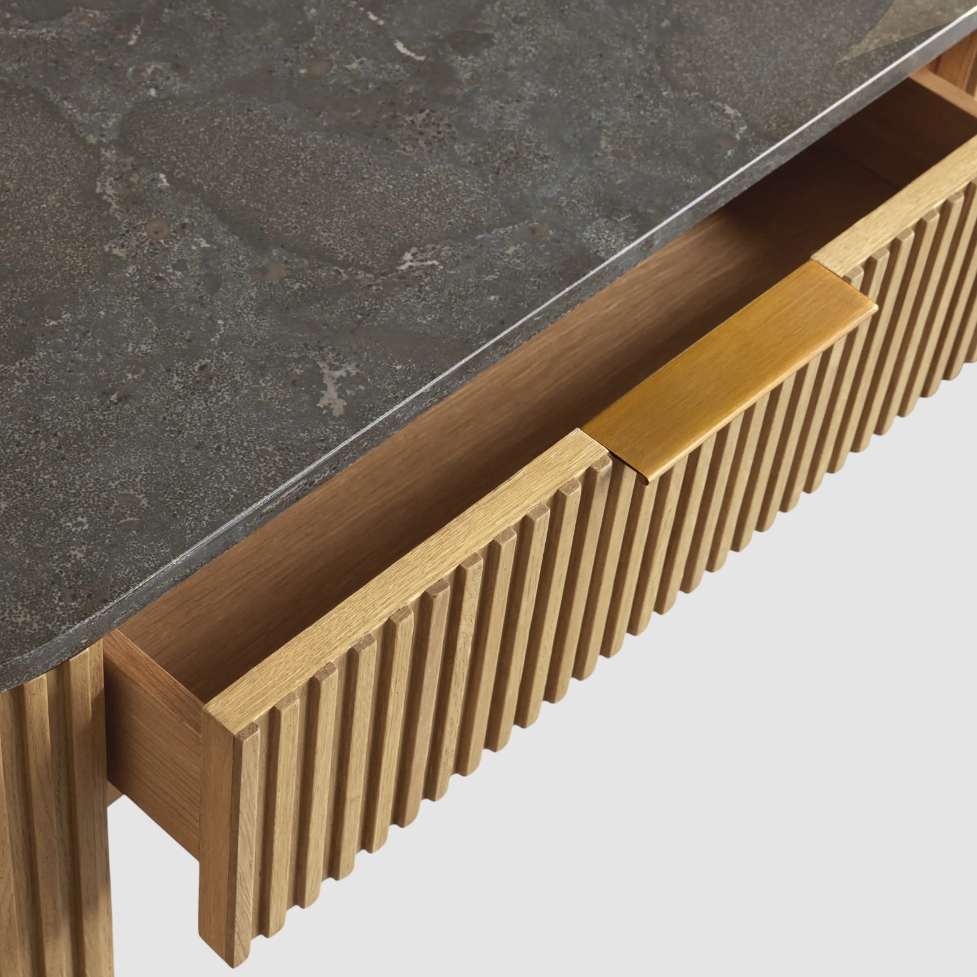 Defined by a refined balance of materials, this collection brings quiet sophistication to the home. Hand-finished Finnish pine or oak is paired with solid stone tops, while reeded detailing and a brass-finished plinth base add depth and architectural contrast.