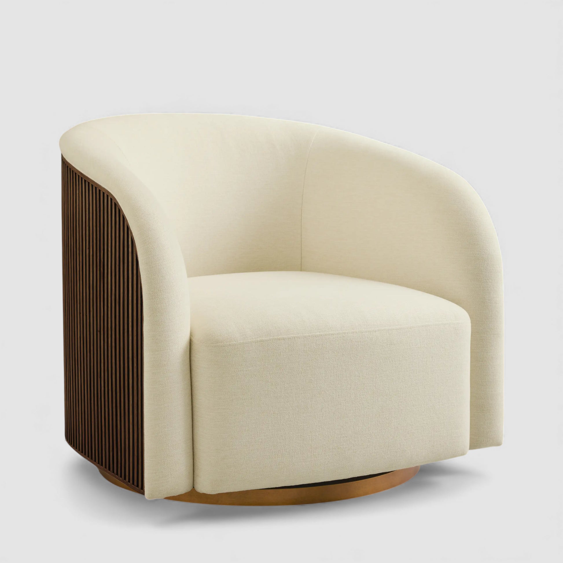 Supportive cushioning and a smooth swivel base enhance everyday comfort, while the mixed-material construction adds visual depth without overwhelming the space. Designed for versatility, the piece transitions easily between casual lounging and refined entertaining environments.
