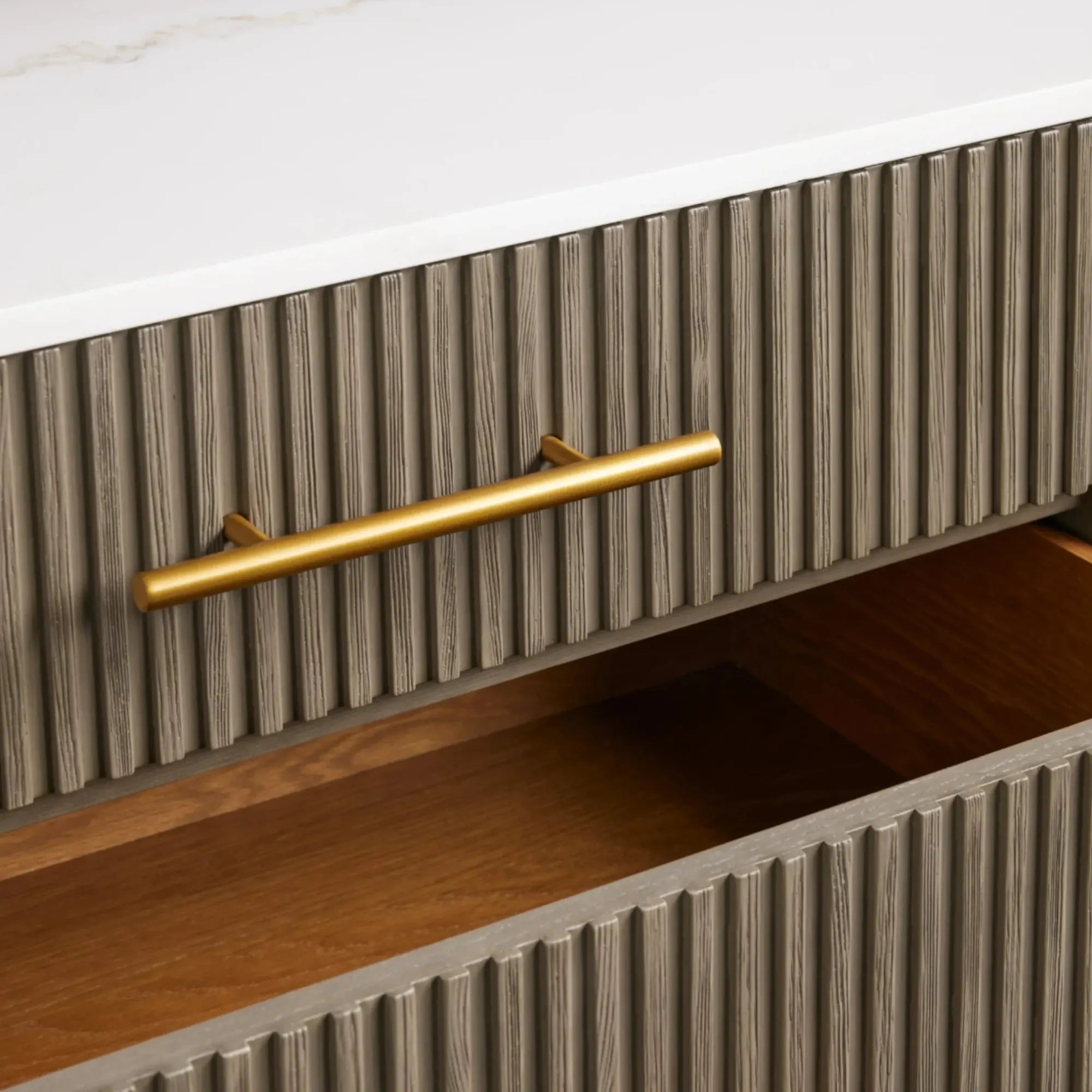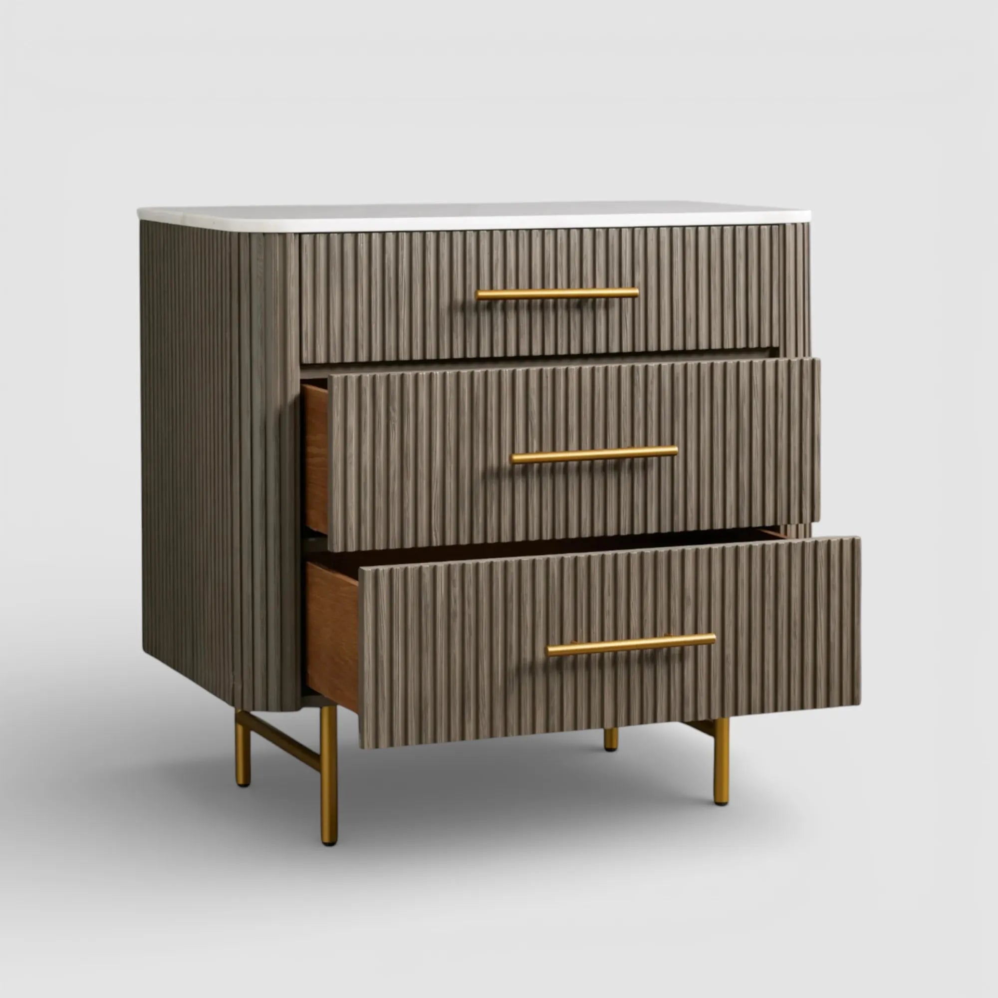 This three-drawer chest is defined by a refined balance of materials, blending natural texture with tailored detail. Hand-finished Finnish pine or white oak is complemented by reeded accents, warm brass hardware, and a solid stone top—each showcasing unique variations in veining and mineral character.