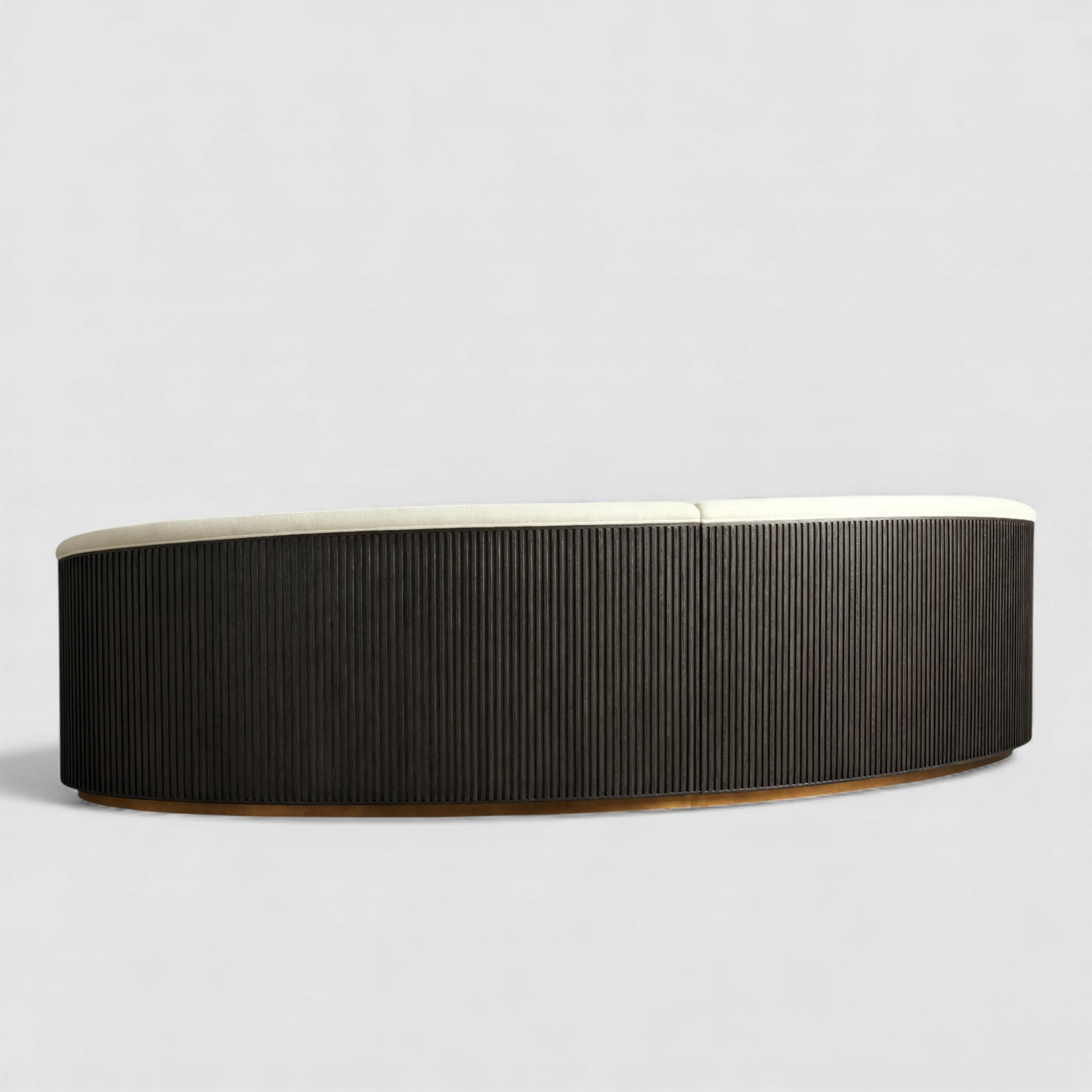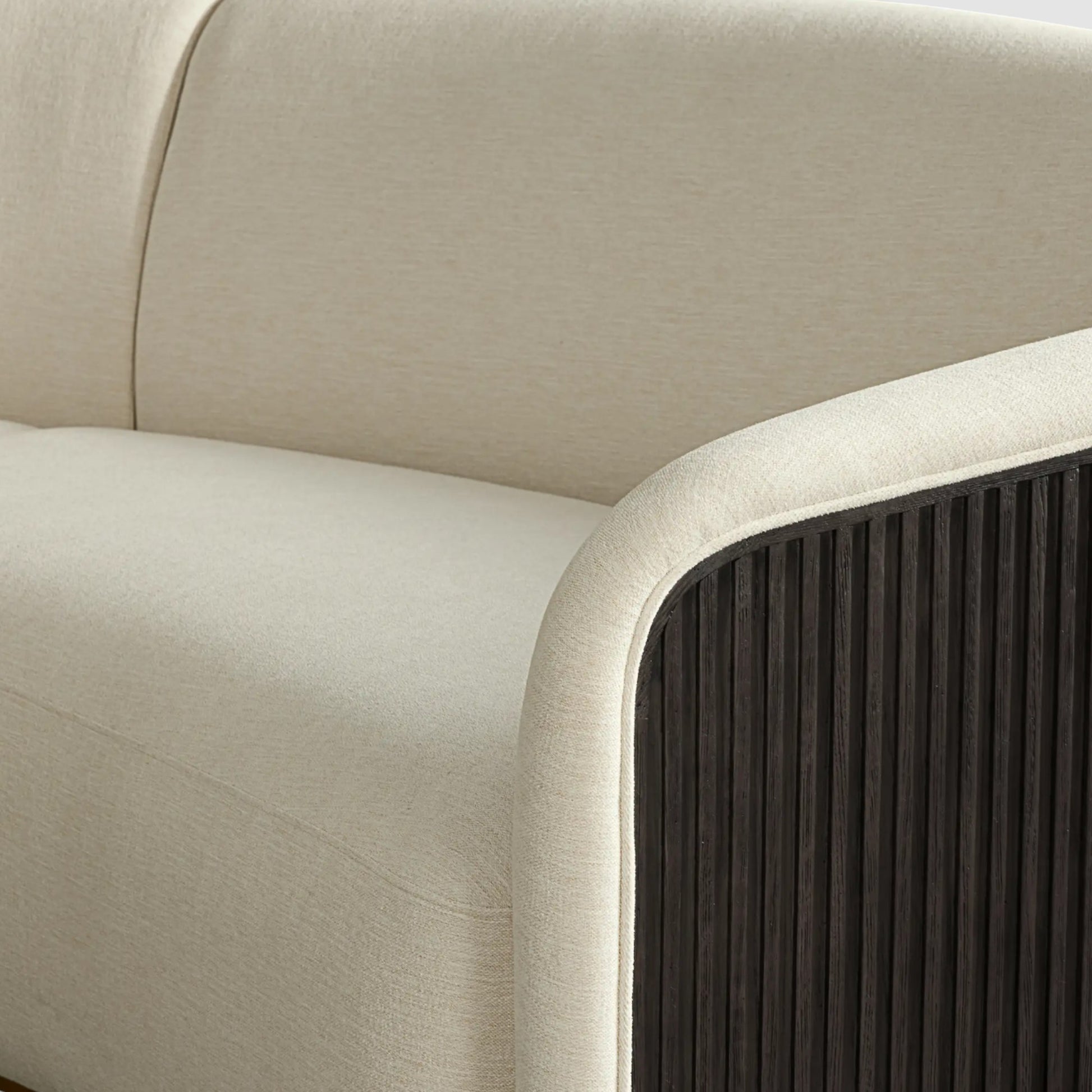 Hand-finished wood surfaces highlight the natural grain, while reeded detailing adds depth and rhythm to the design. Beneath the surface, a carefully engineered support system delivers lasting stability and a balanced sit—soft, resilient, and comfortable for extended lounging.