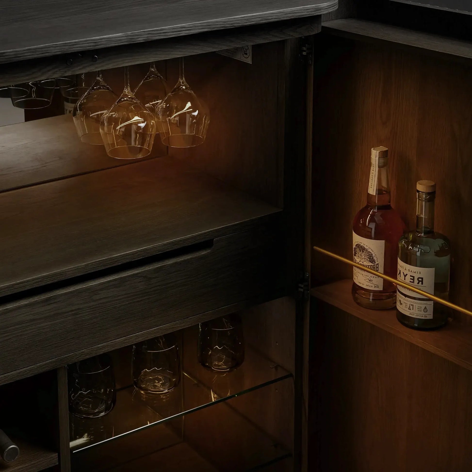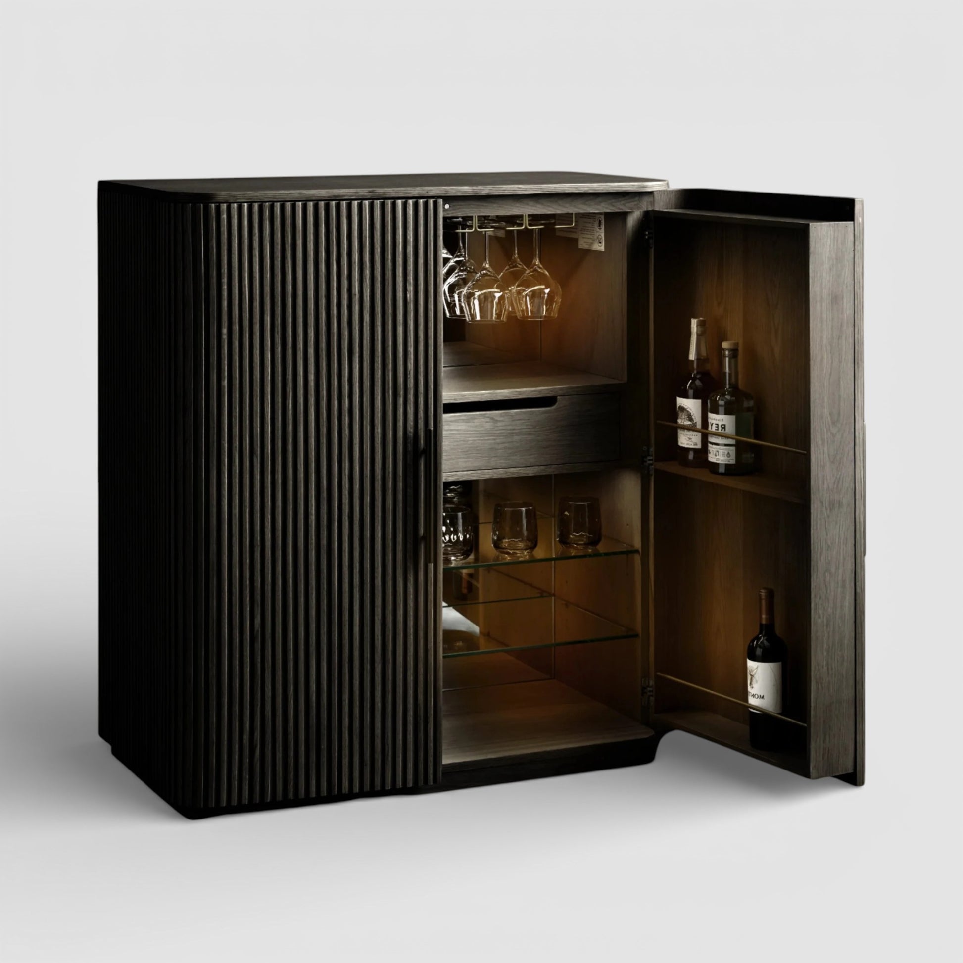 Hand-finished wood surfaces reveal subtle depth and character, while the thoughtfully organized interior balances display and storage. Integrated lighting softly highlights select compartments, enhancing visibility without compromising ideal conditions for wine storage. Designed to be both functional and architectural, the piece anchors the room with quiet confidence.
