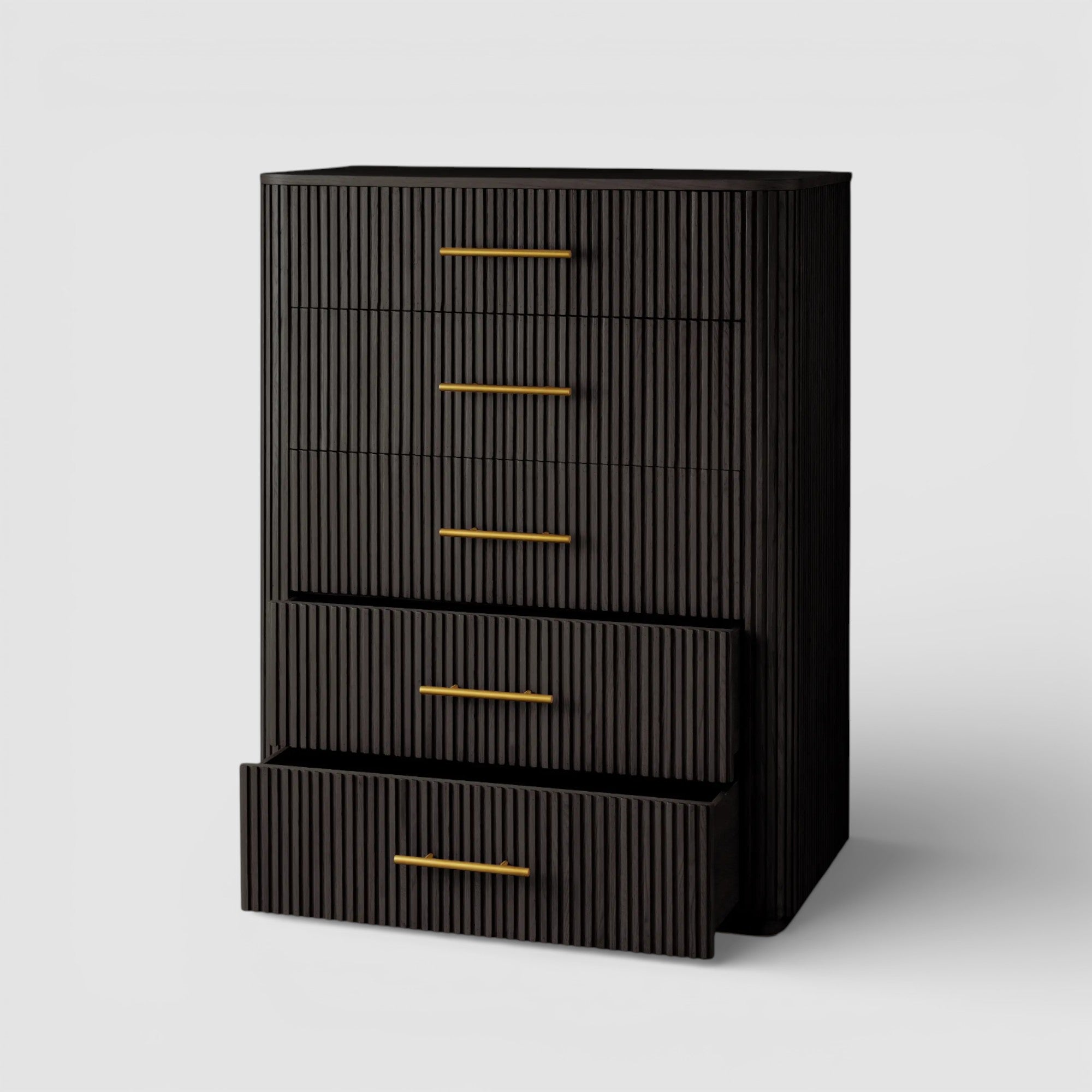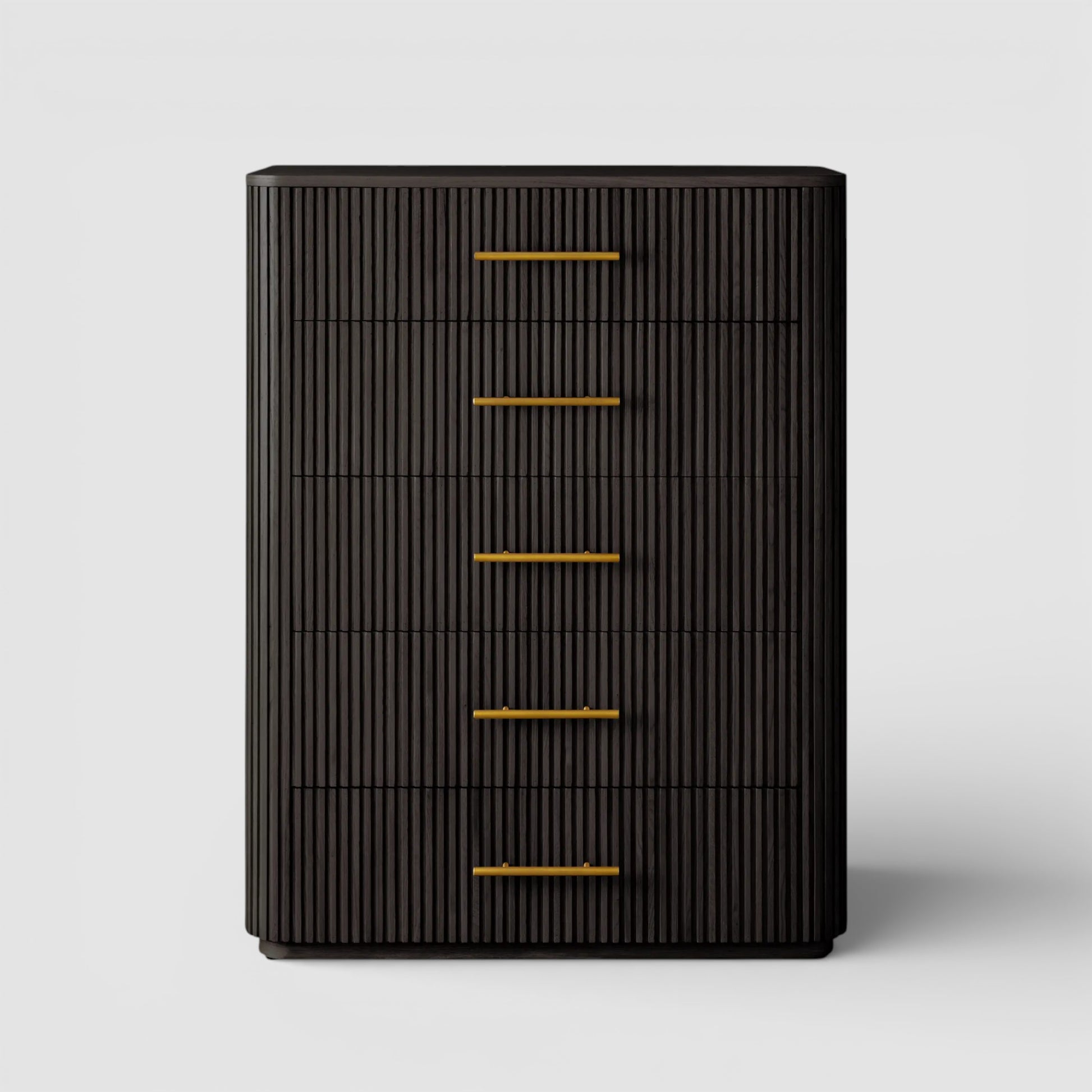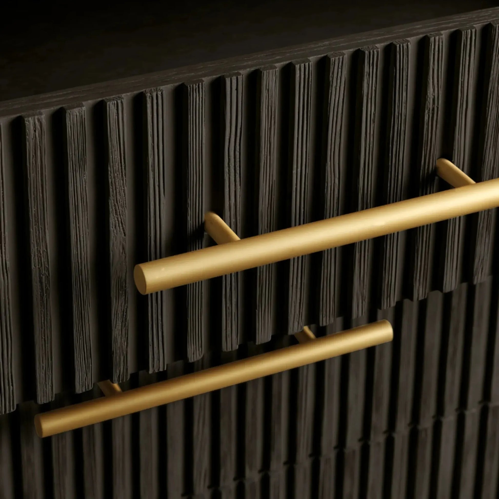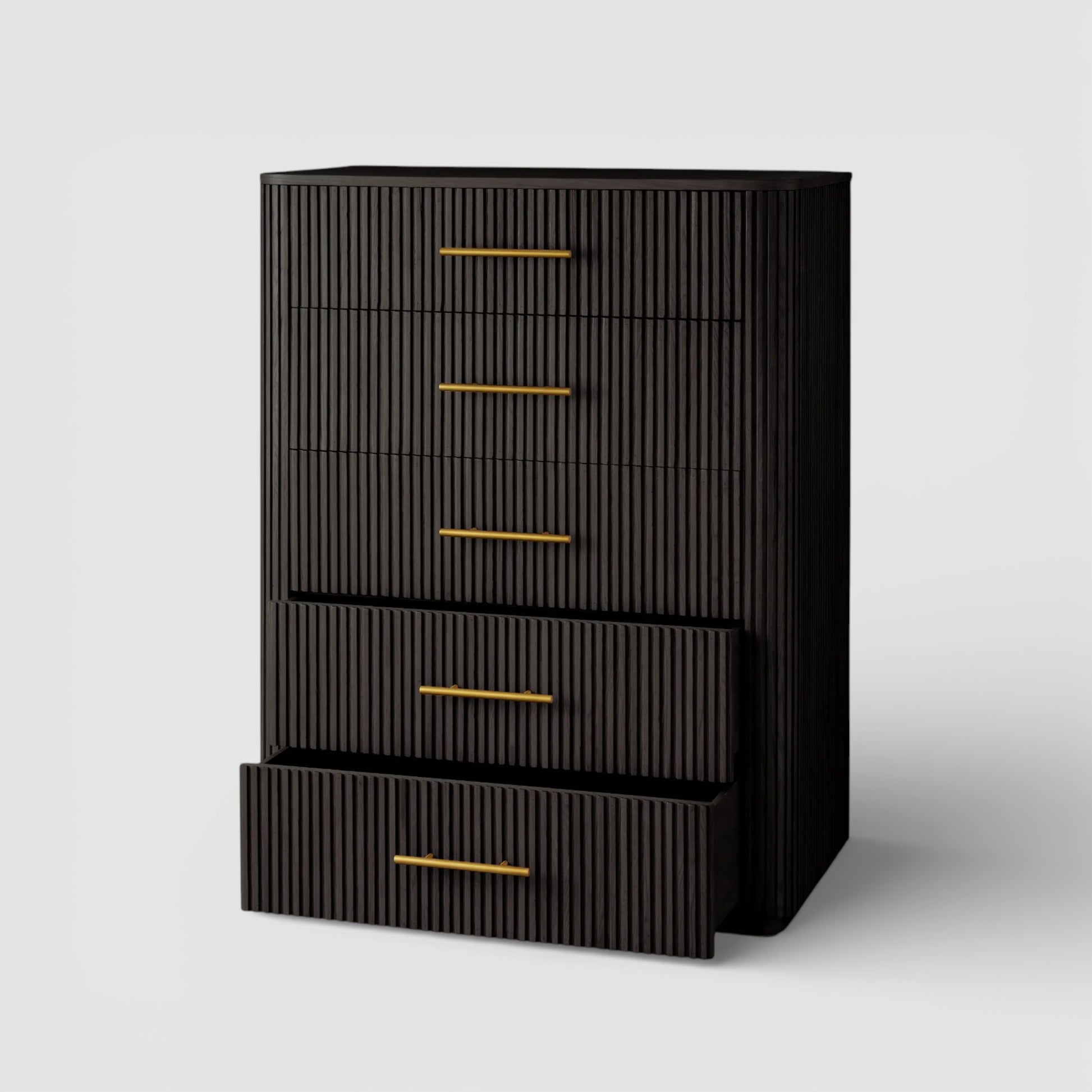 Defined by a sculptural reeded profile, this bedroom storage piece brings texture and quiet refinement to the sleeping space. Hand-finished solid wood is accented with warm brass hardware, creating a composed balance of natural material and tailored detail.