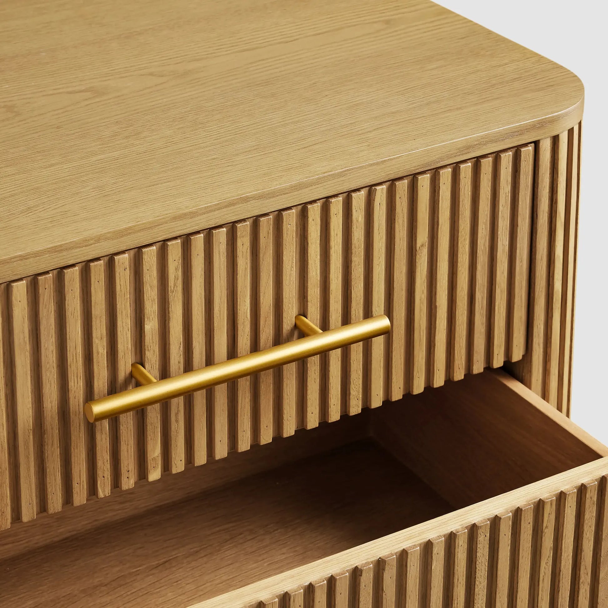 Defined by a sculptural reeded silhouette, this bedroom storage piece brings texture and quiet refinement to the sleeping space. Hand-finished wood is complemented by warm brass hardware, creating a composed balance of detail and restraint.