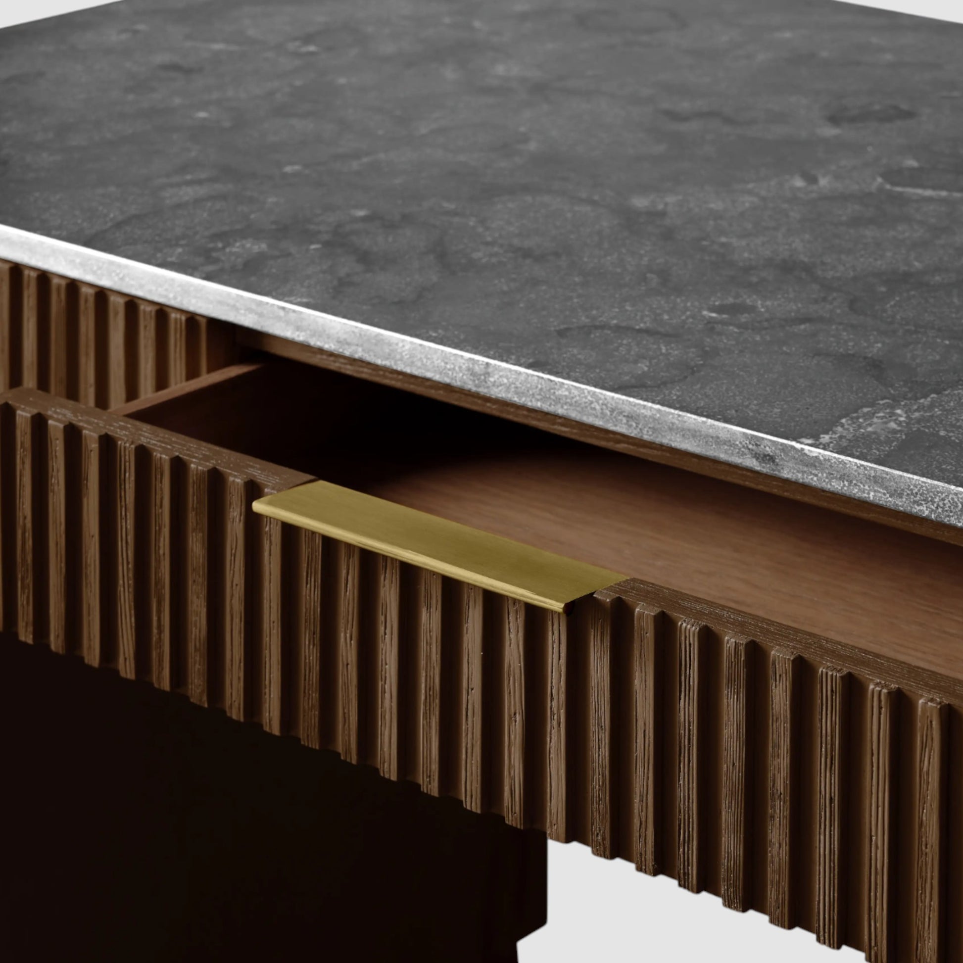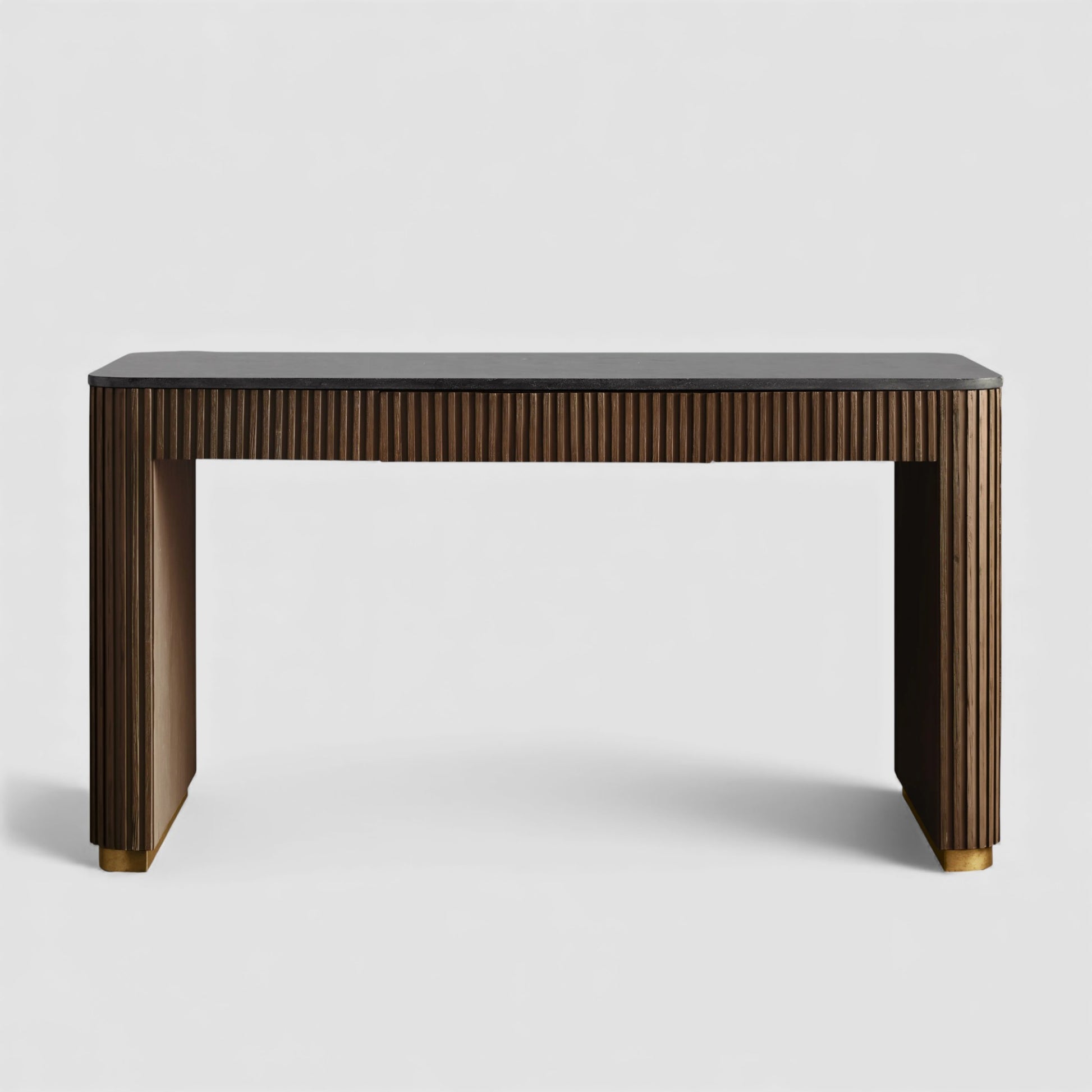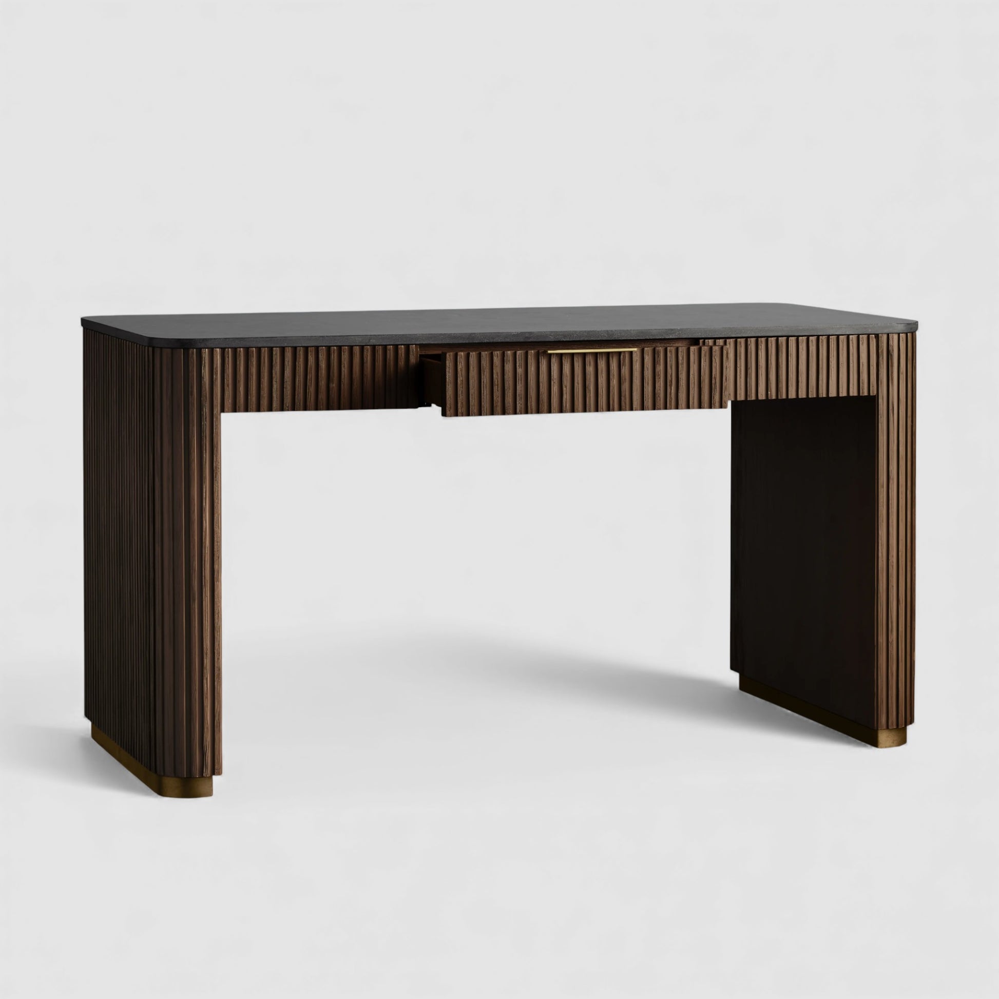 Defined by a refined balance of materials, this writing desk brings quiet sophistication to the modern workspace. Hand-finished Finnish pine or European white oak is paired with a solid stone top, while reeded wood detailing and subtle metal accents add depth and architectural rhythm.