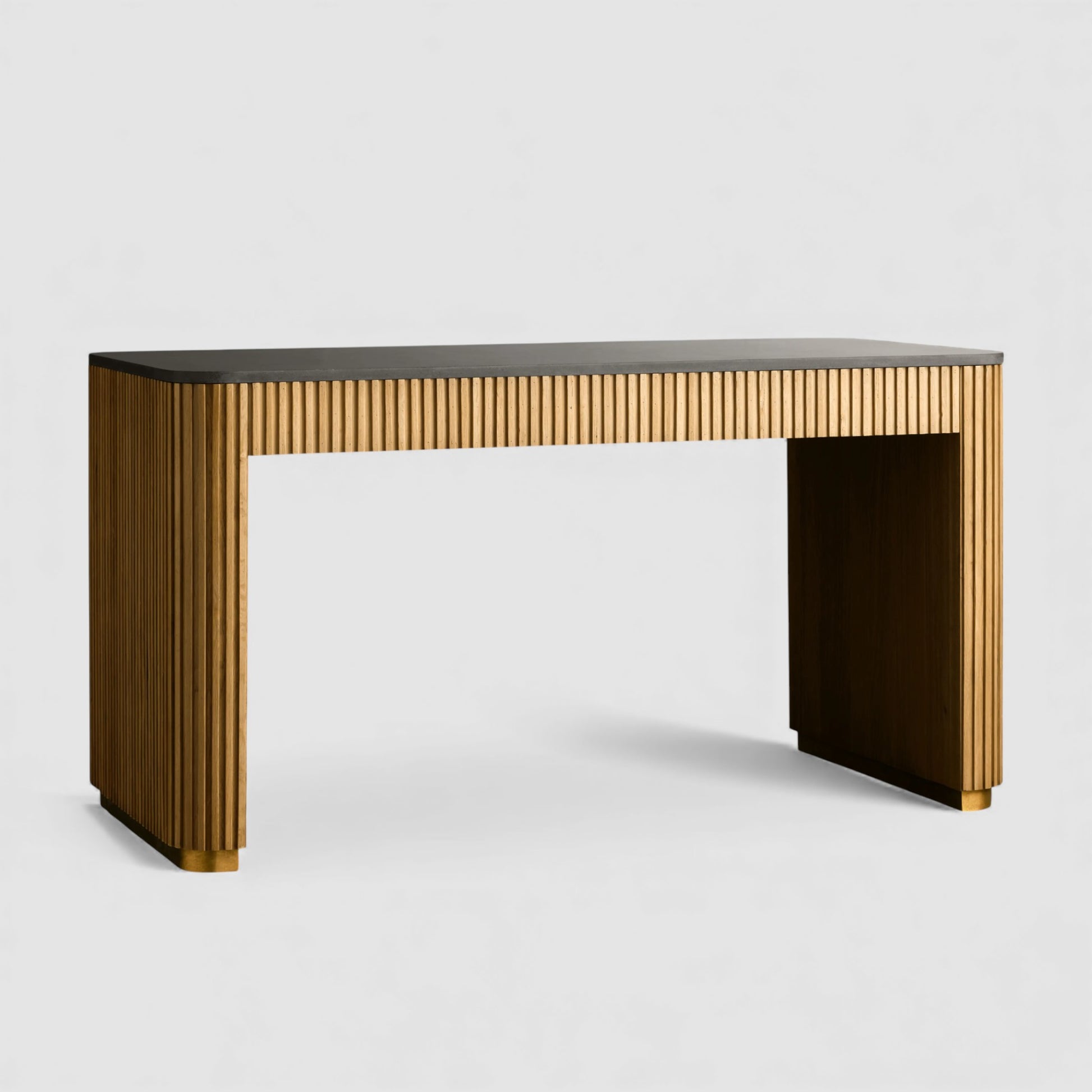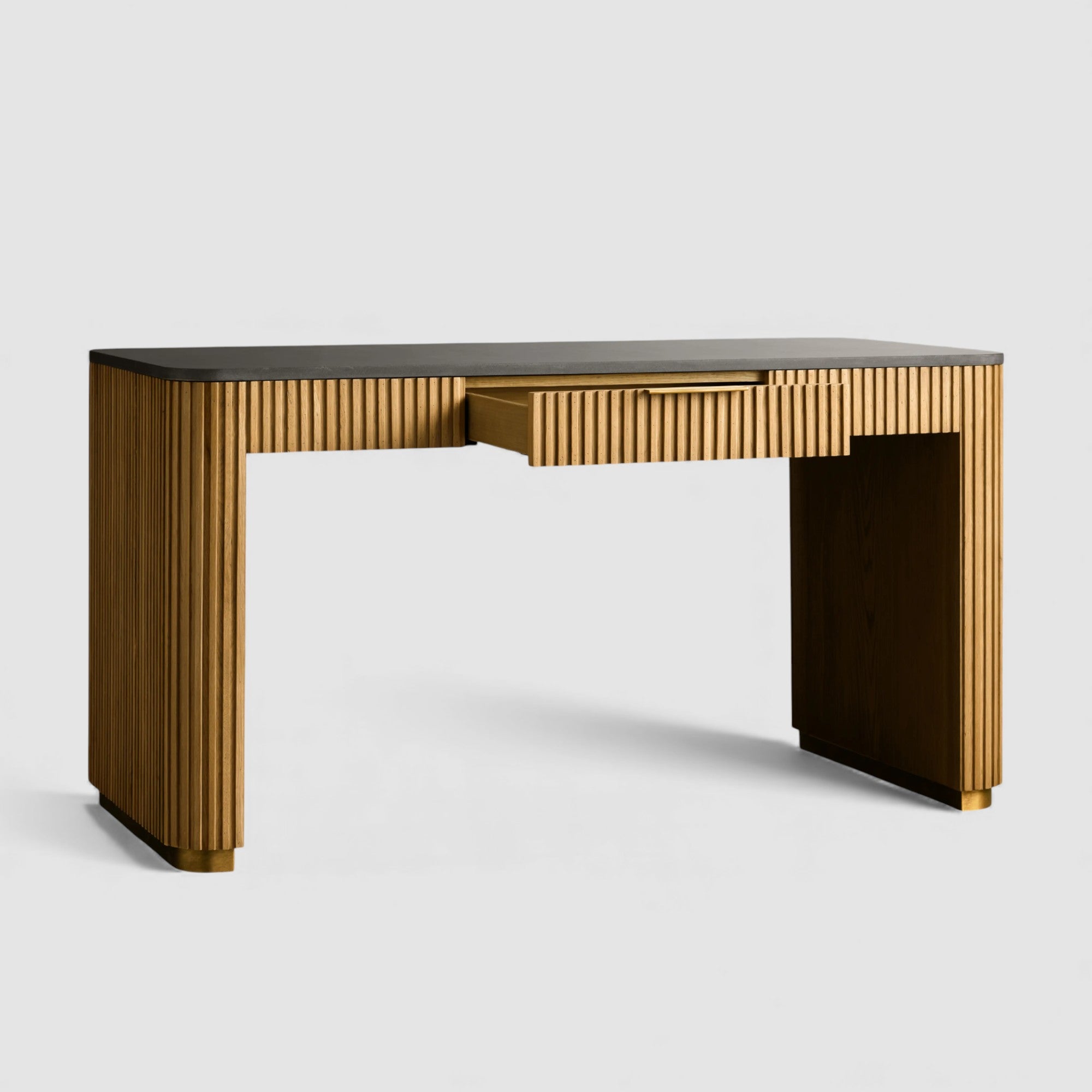 Defined by a refined balance of materials, this writing desk brings quiet sophistication to the modern workspace. Hand-finished Finnish pine or European white oak is paired with a solid stone top, while reeded wood detailing and subtle metal accents add depth and architectural rhythm.