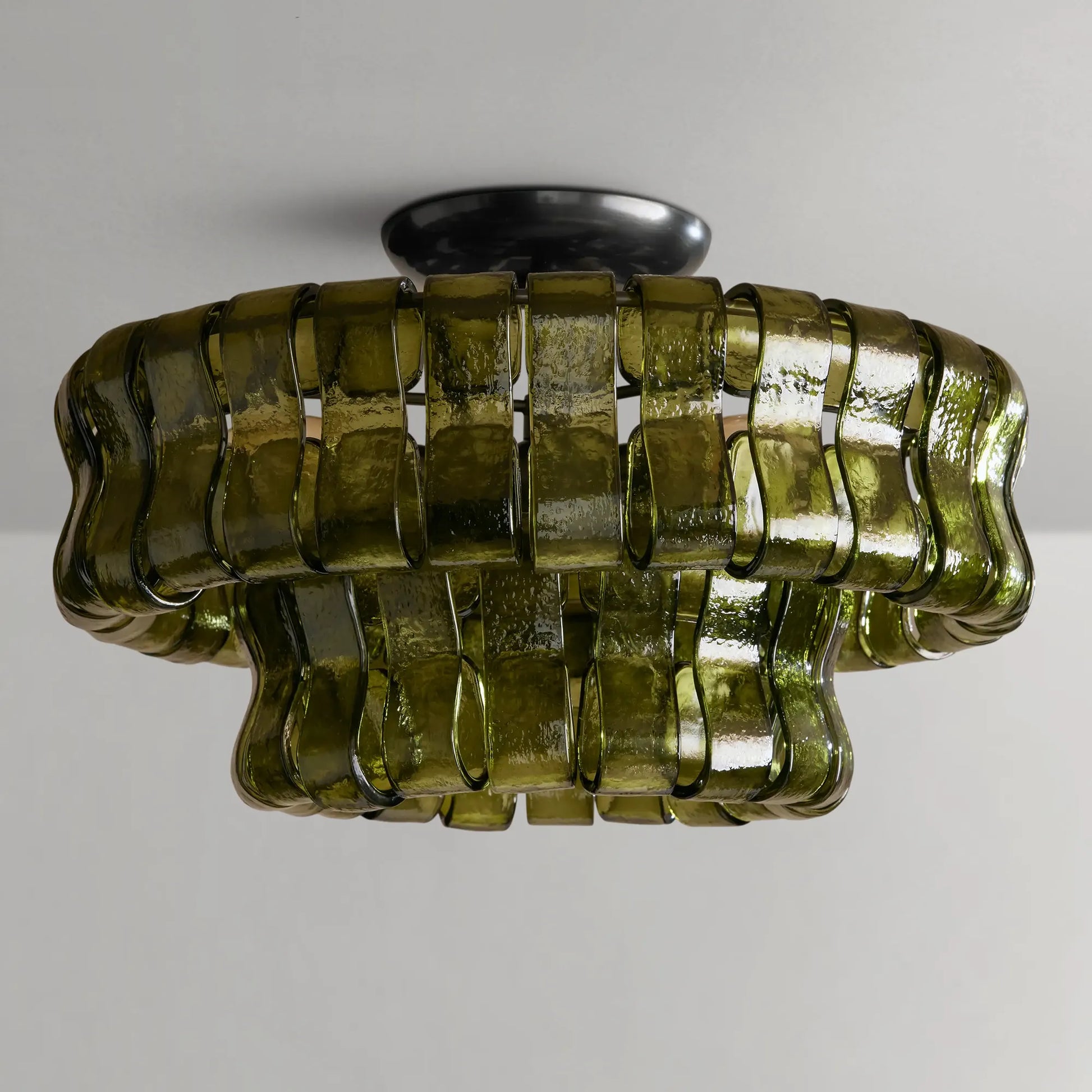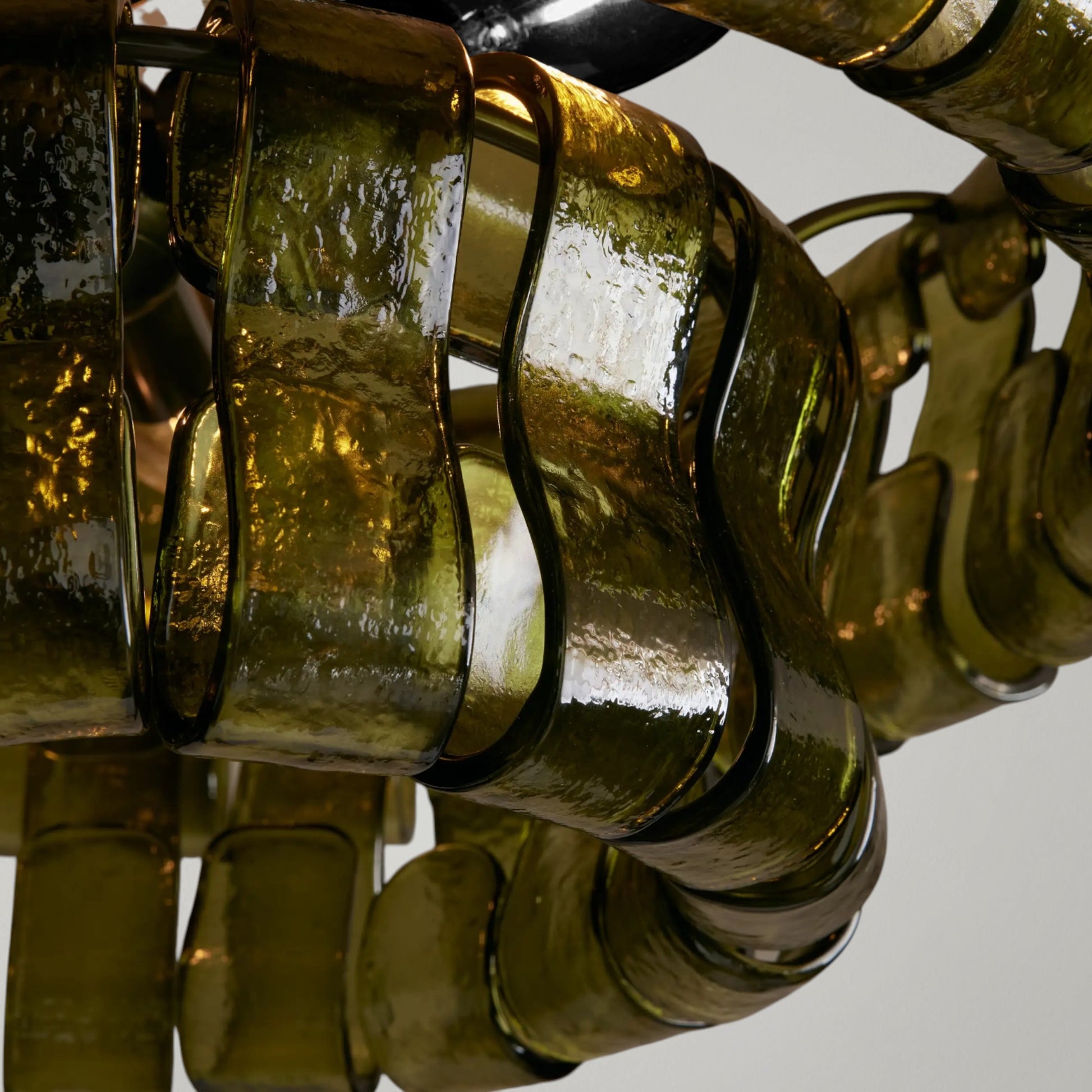Drawing inspiration from classic Italian glassmaking, this chandelier features gracefully curved, textured glass panels arranged in layered formation. The sculptural design creates depth and movement, while your choice of brass or bronze finish adds warmth and refinement. When illuminated, the glass softly diffuses light, filling the room with a dimensional glow that feels both elegant and inviting.