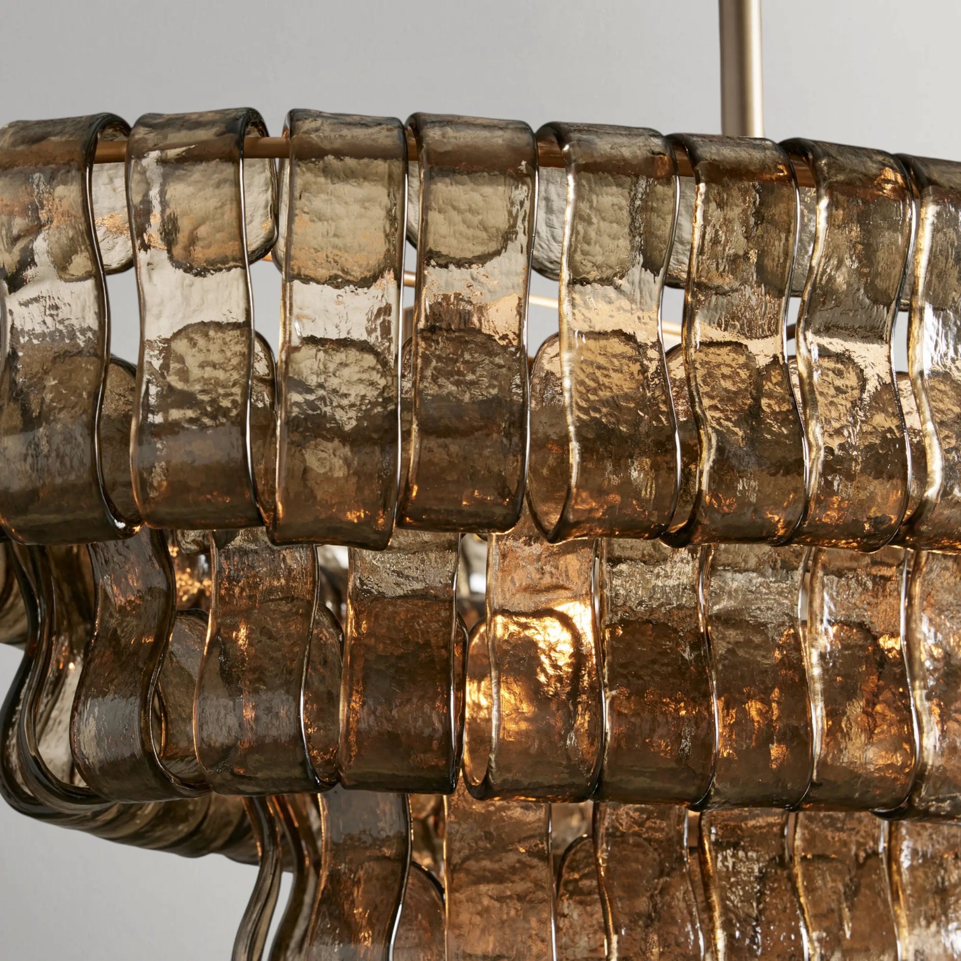 This chandelier draws inspiration from the timeless elegance of Italian glass artistry, combining curved, textured glass panels with gracefully layered forms. When illuminated, the glass diffuses light into a warm, dimensional glow that adds depth and softness to the room. Balanced metal framing and sculptural proportions give the fixture a refined presence, making it well suited for dining areas, living spaces, and other interior settings where ambient lighting and visual impact are equally important.