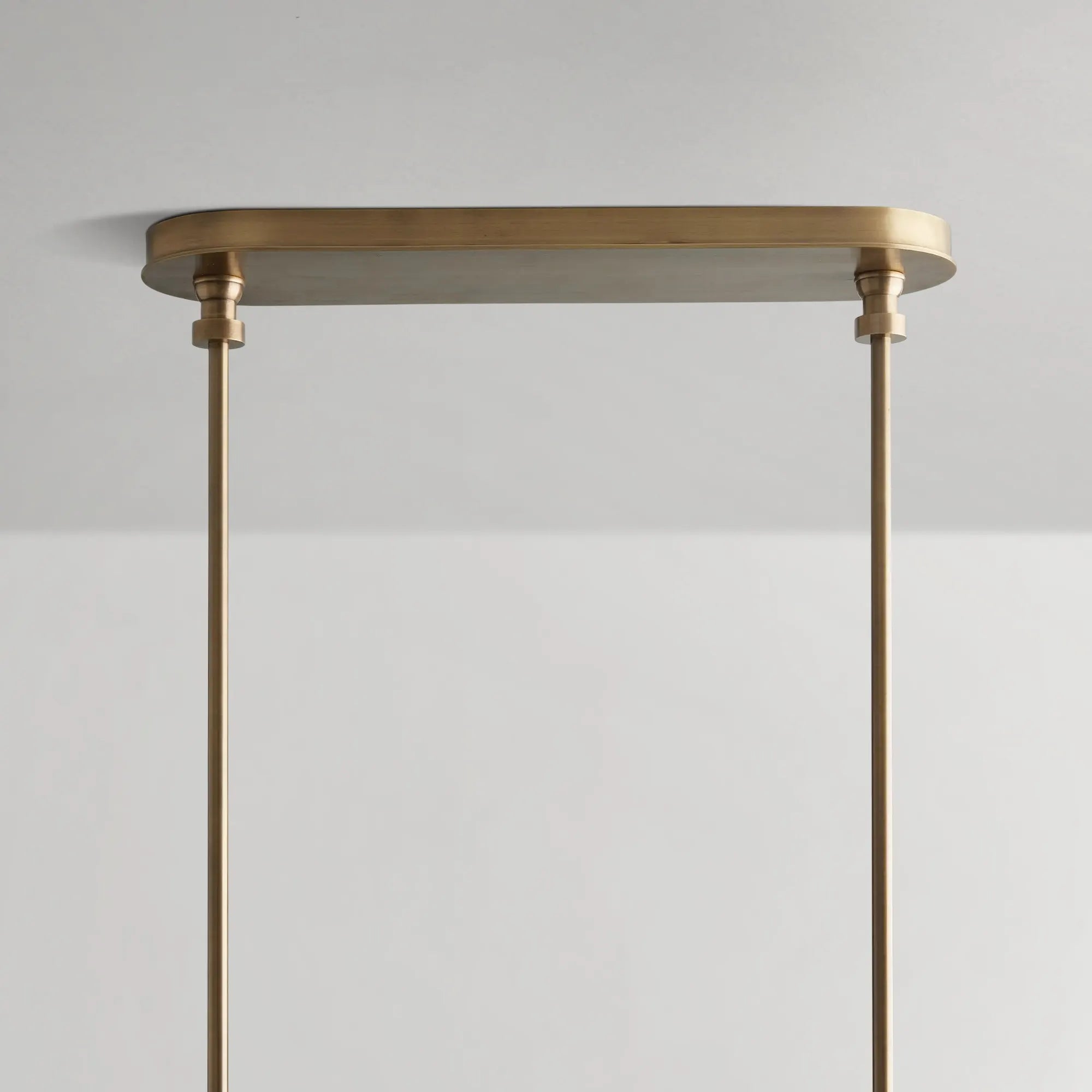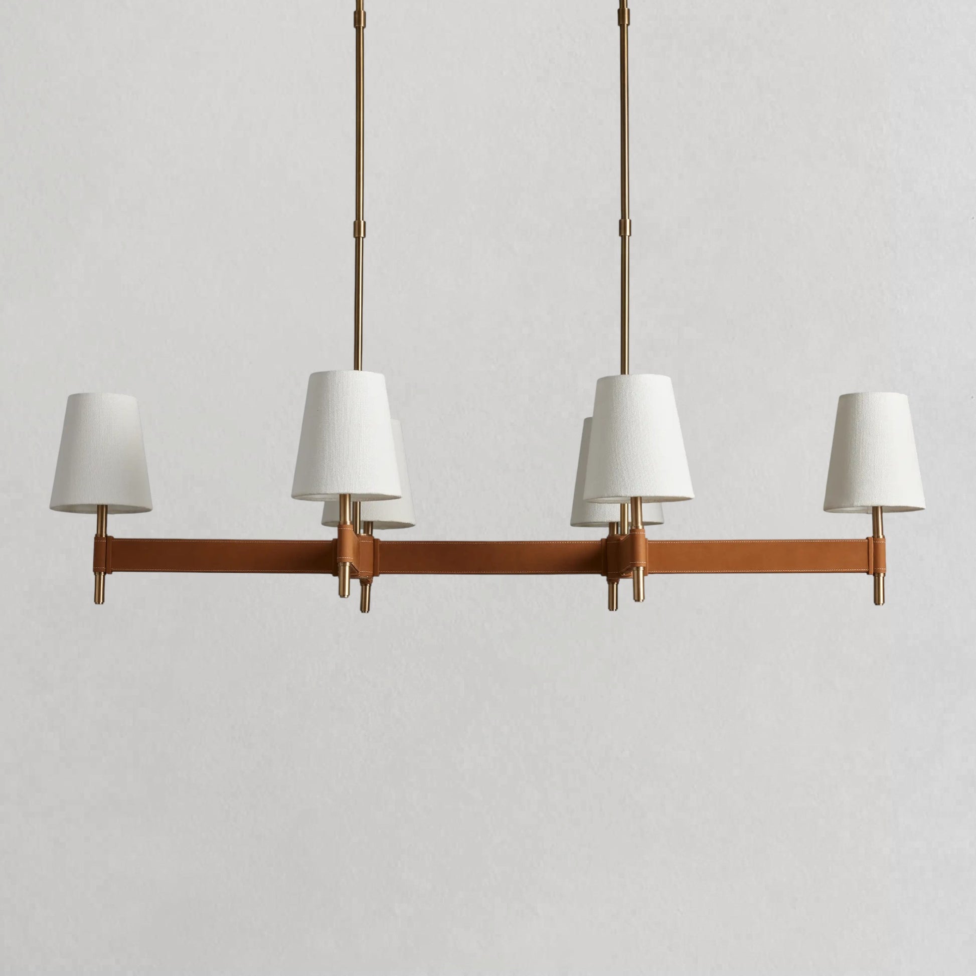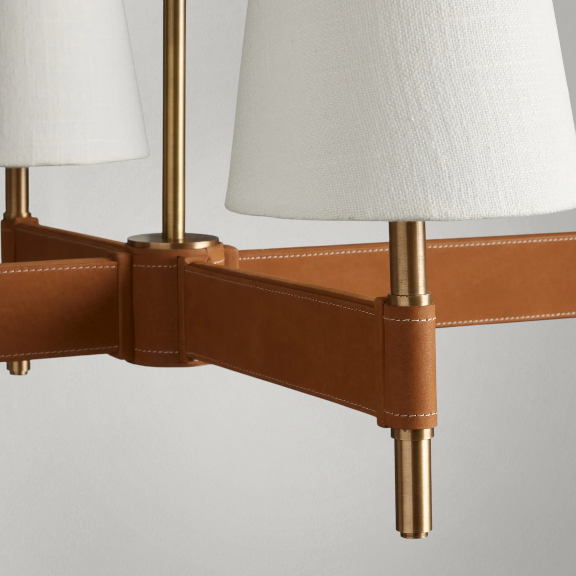 This chandelier draws inspiration from iconic midcentury modern design, pairing refined metalwork with thoughtfully layered materials. Antiqued brass arms are accented with stitched leather details and softened by white linen shades, creating a warm and balanced glow when illuminated. The mix of textures adds visual depth while maintaining a clean, timeless silhouette, making the fixture a sophisticated addition to dining rooms, living spaces, and studies.