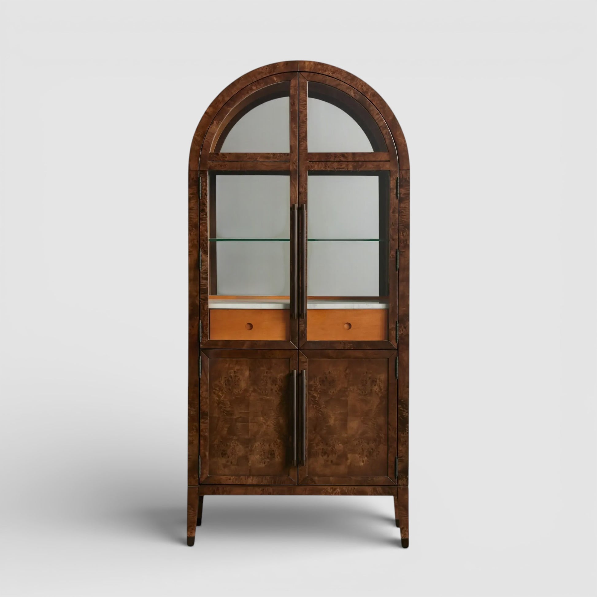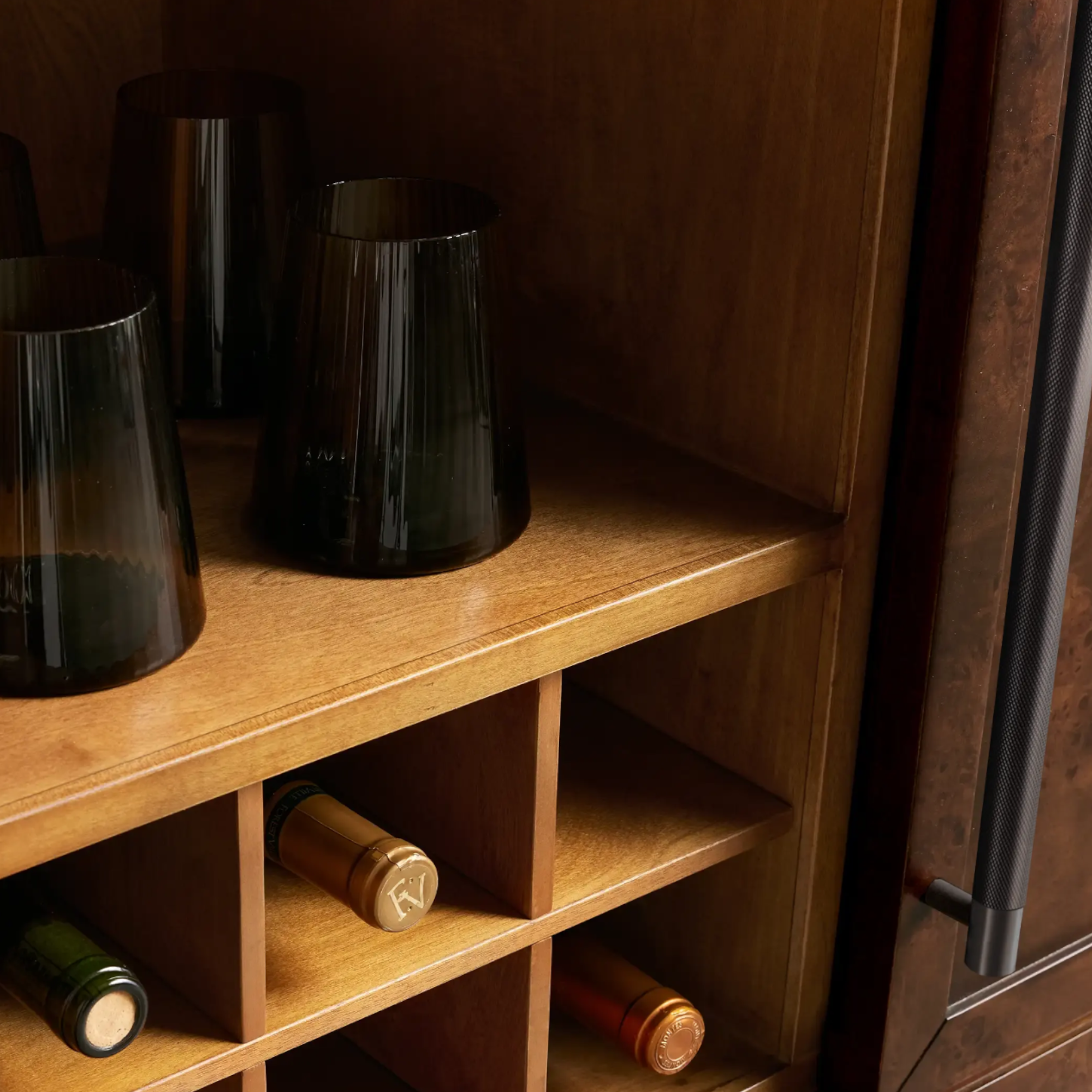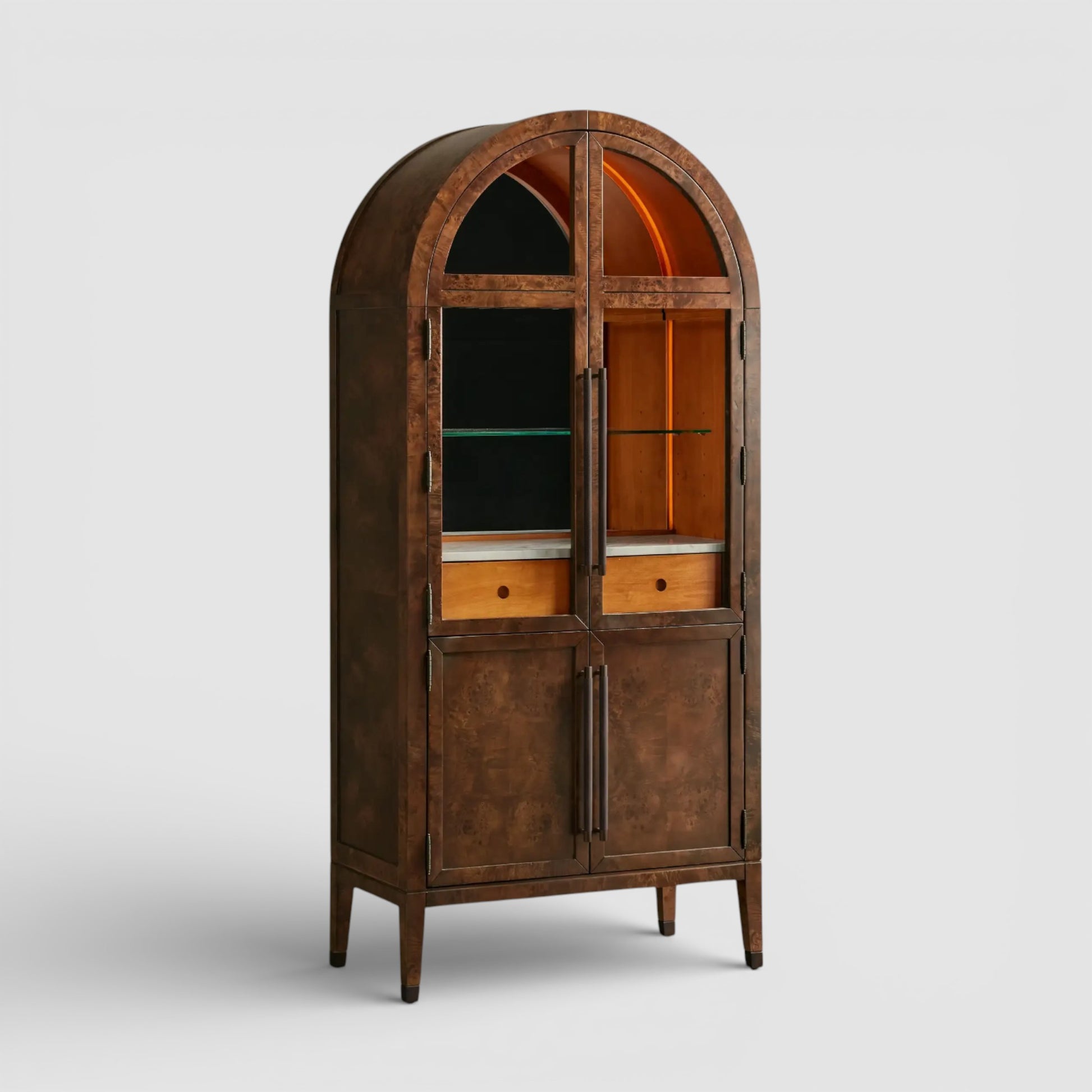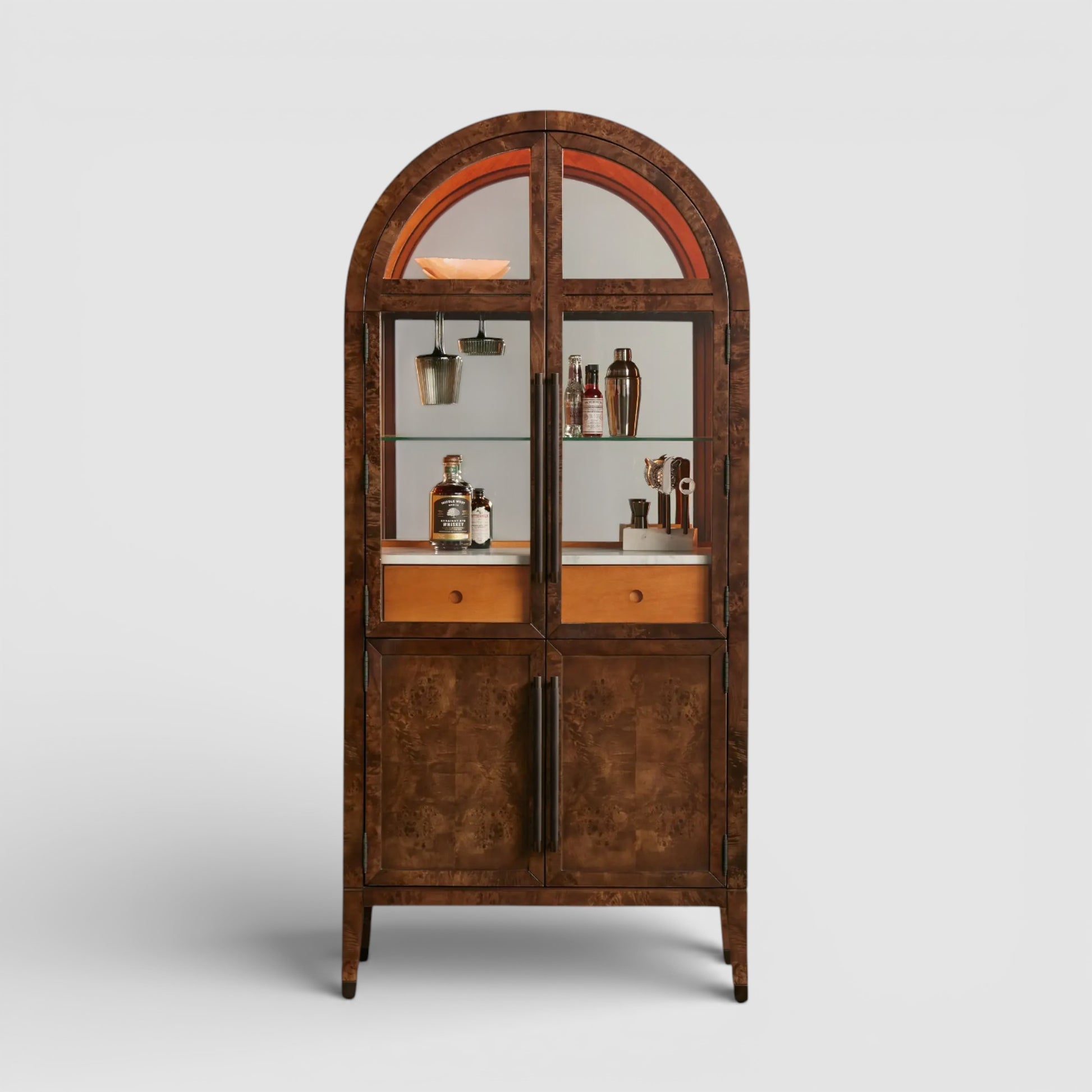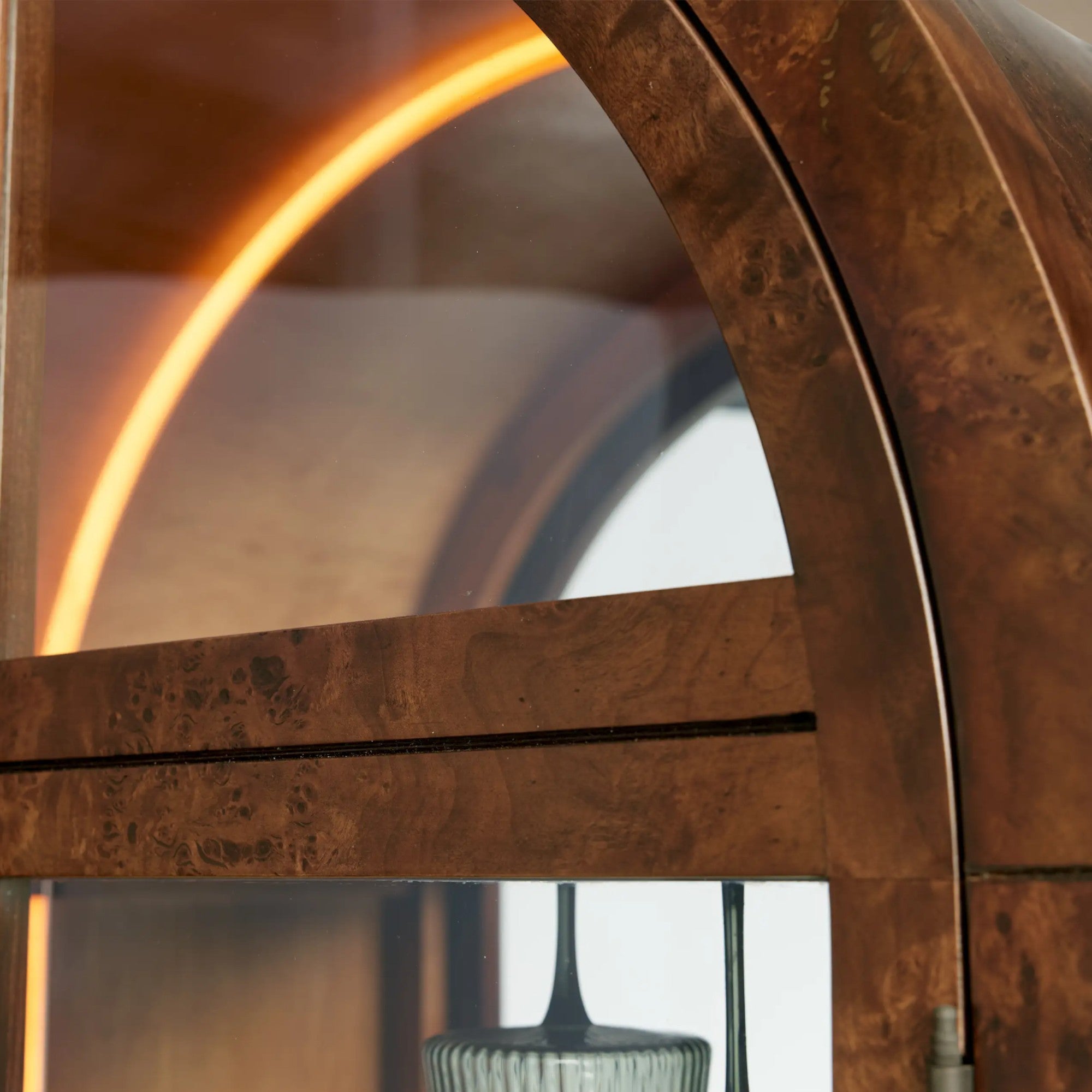 Where sculpted curves meet the dramatic grain of mappa burl, this bar cabinet introduces depth, movement, and refined character to any entertaining space. The richly patterned wood surface showcases the natural variation of the burl, making each piece visually distinctive while maintaining a balanced, architectural presence.