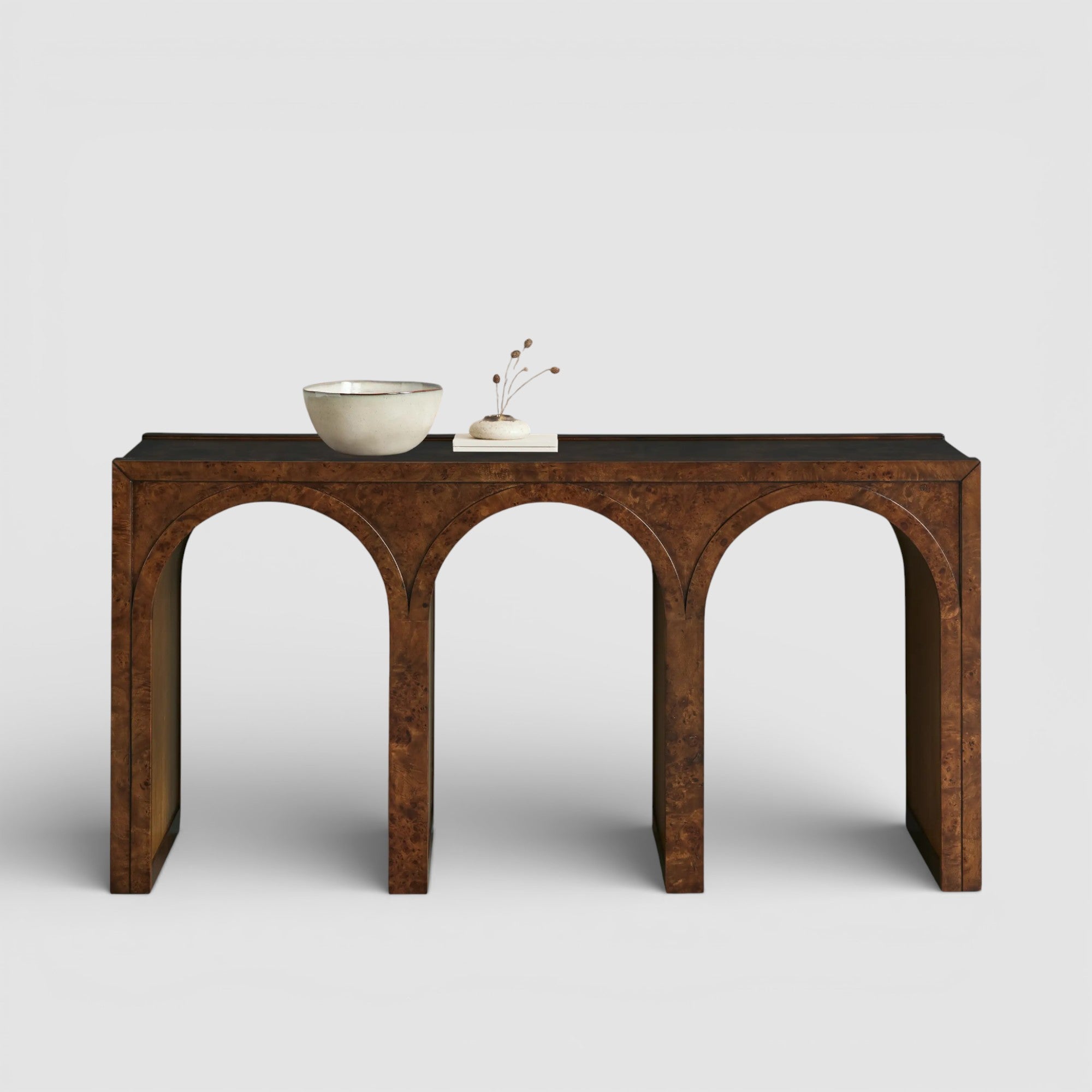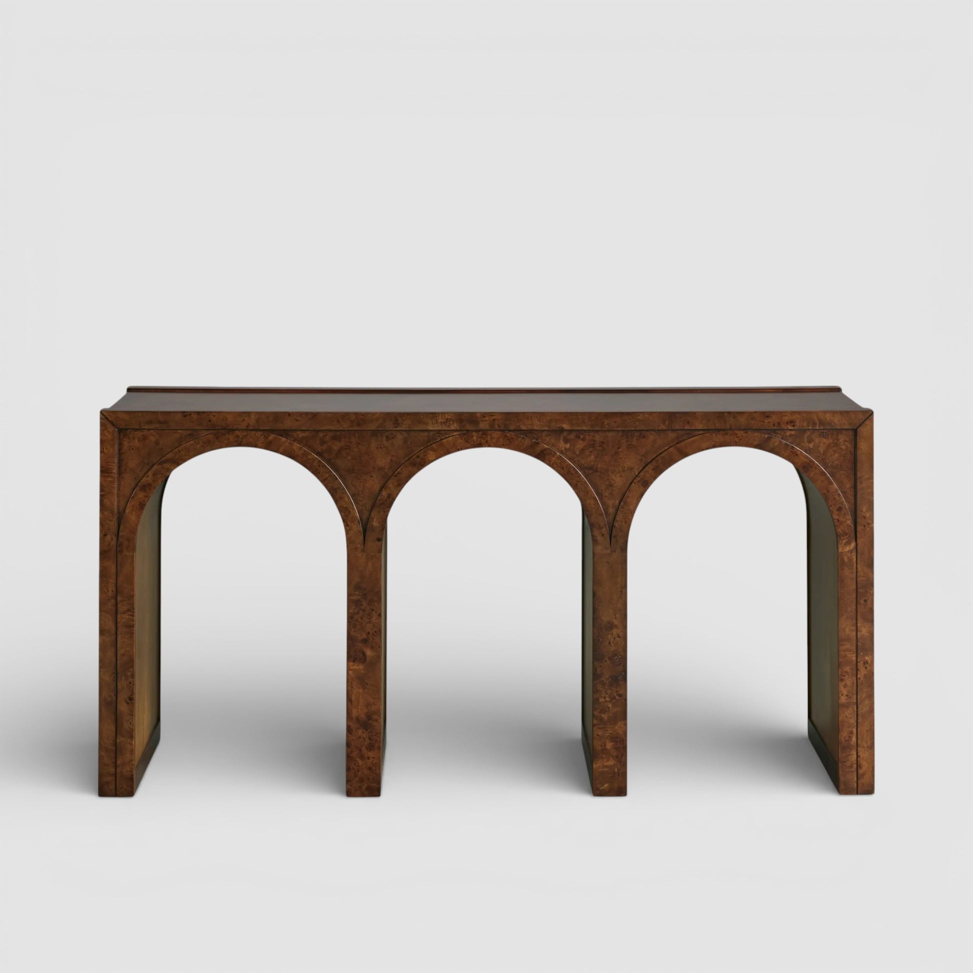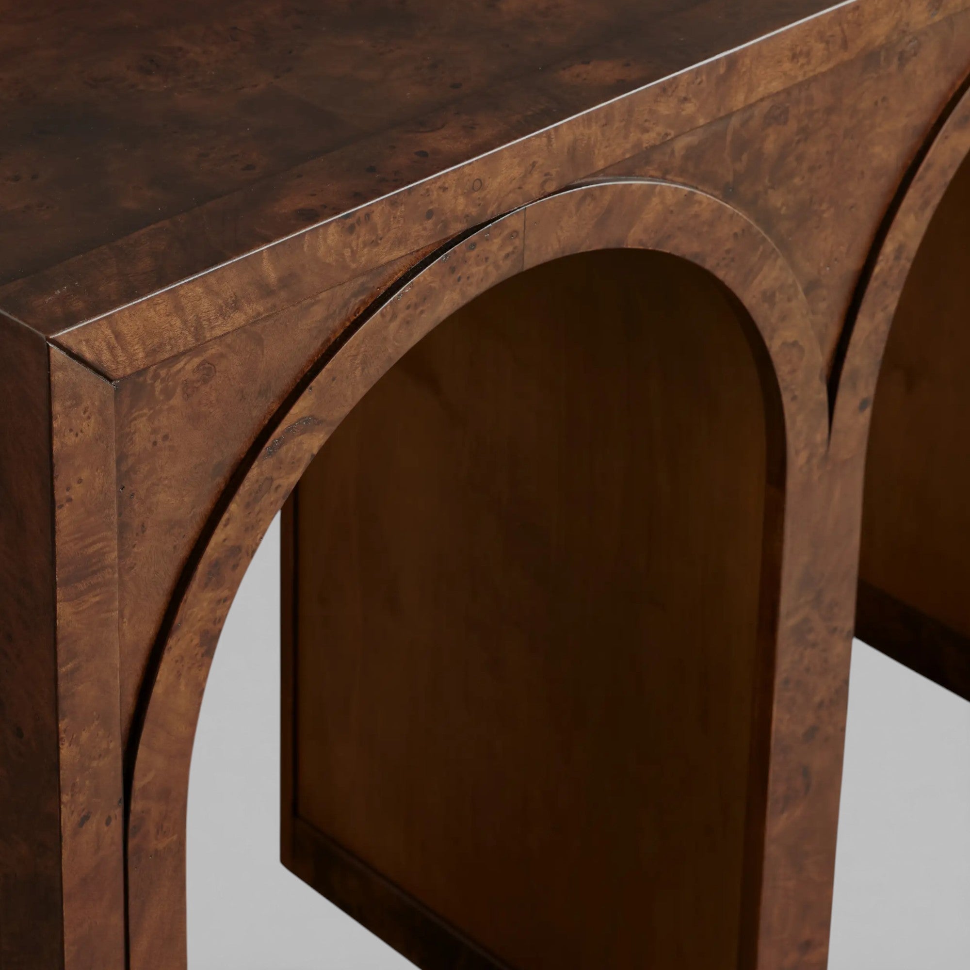 Where gentle curves meet the luminous grain of burl wood, this artisan-crafted piece introduces quiet architectural interest to the space. Distinguished arches soften the silhouette, creating a balanced composition that feels both sculptural and composed.