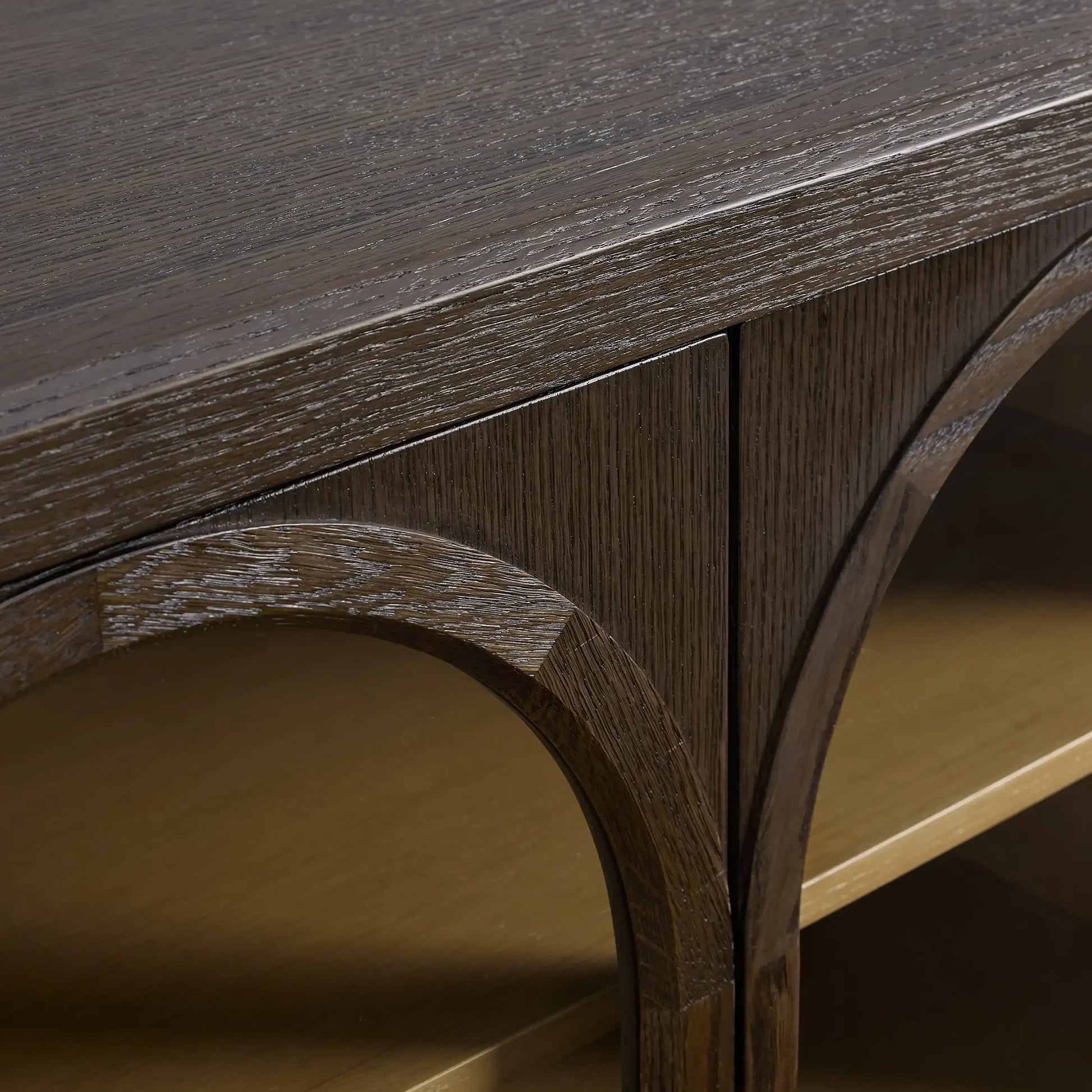 Shaped from oak and defined by its arched glass doors, this media console brings sculptural presence to functional storage. The softened geometry lends architectural character, while the glass-front design keeps the visual weight light and refined.