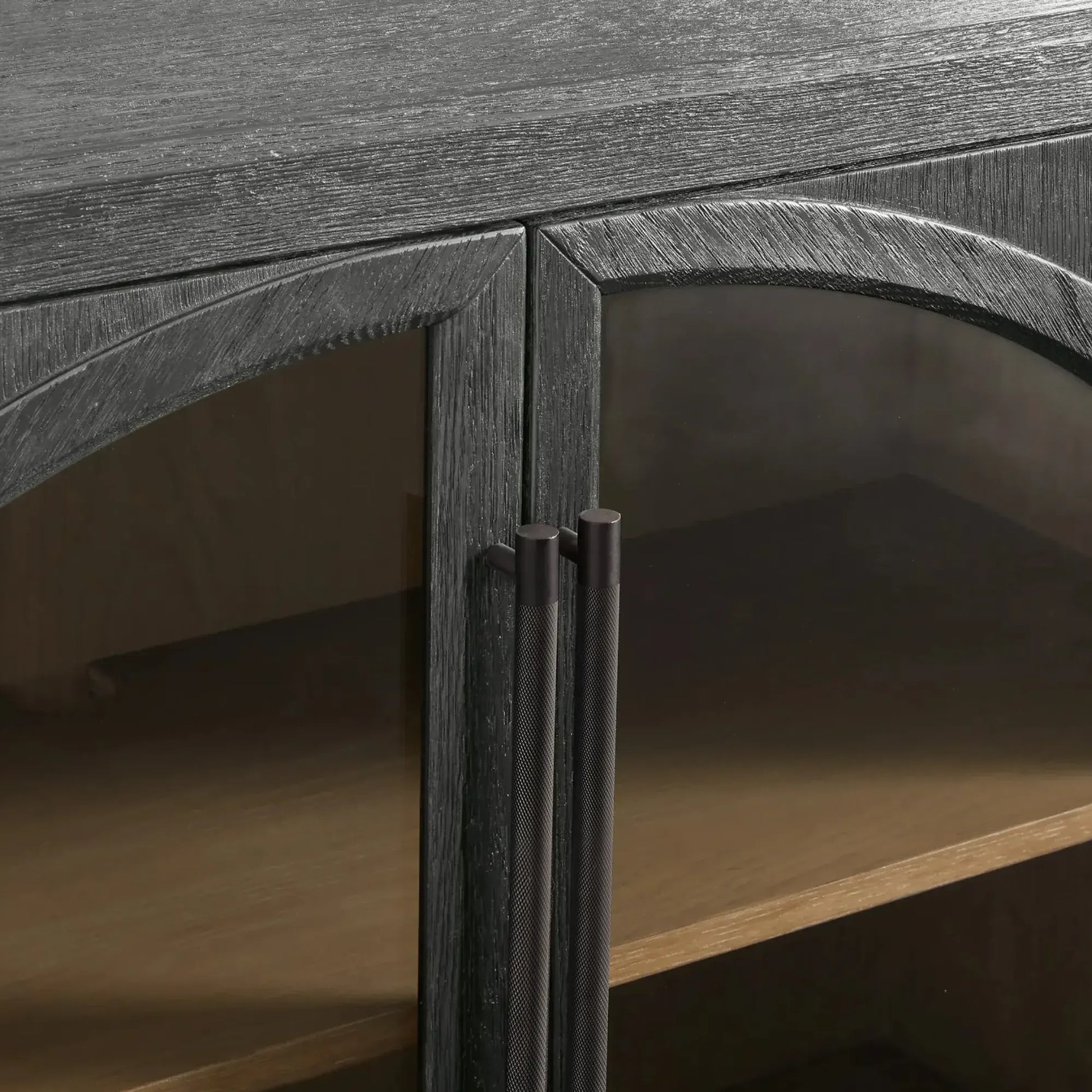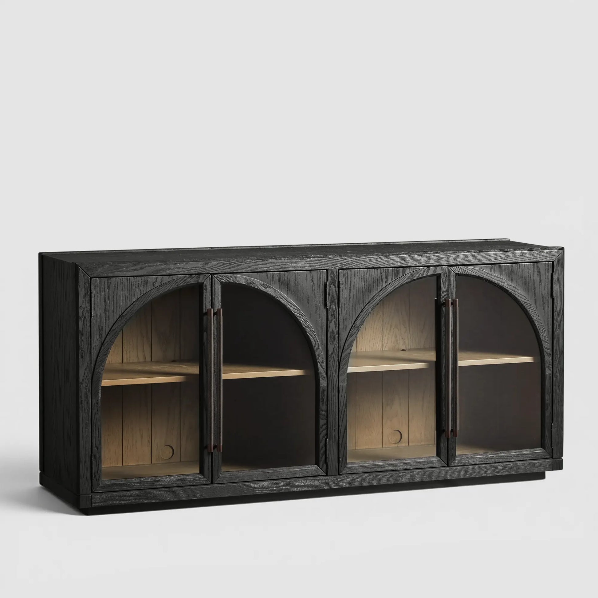 Crafted where gentle curves meet the quiet depth of natural oak, this sideboard offers both sculptural beauty and everyday function. Arched glass doors soften the silhouette and reveal a warm interior framed with subtle shiplap paneling, adding architectural character without overwhelming the space. Inside, adjustable shelving provides generous room for serveware, linens, and daily essentials—kept neatly organized and always within reach.