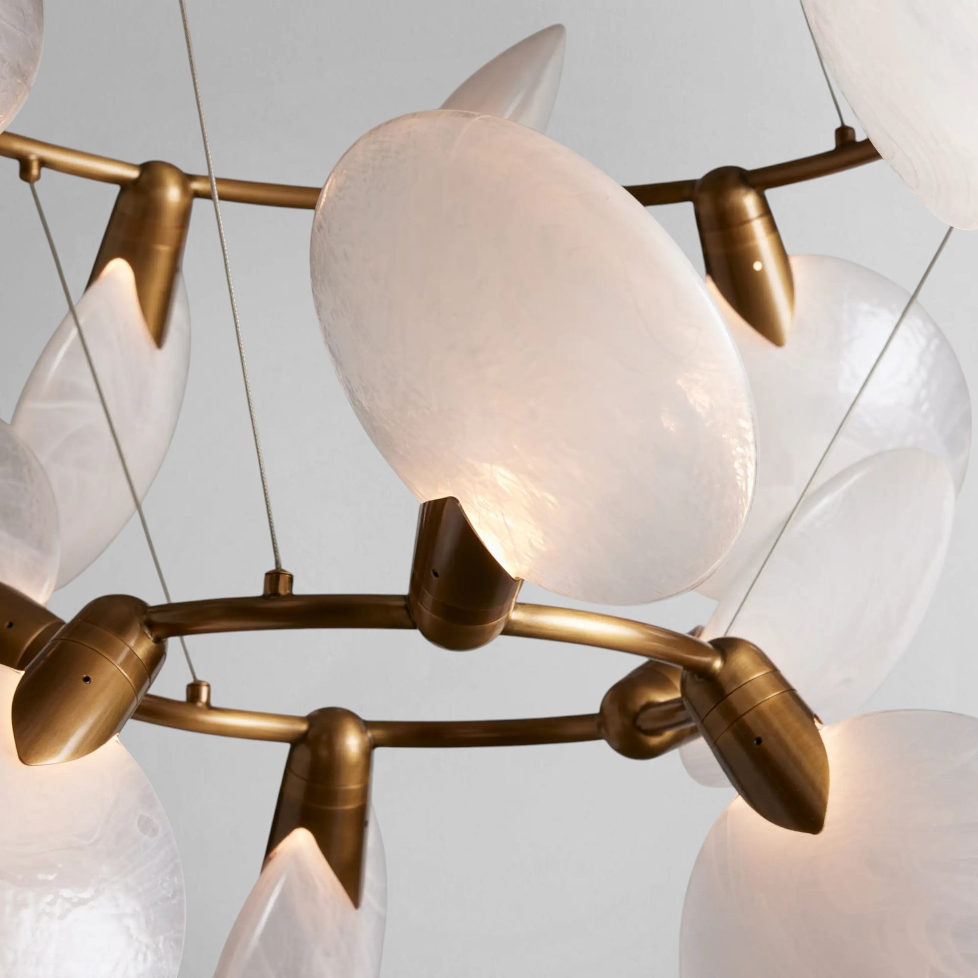 This chandelier features a sculptural petal-like silhouette formed by hand-blown glass discs, each revealing natural swirls, streaks, and subtle textural ripples. When illuminated, the integrated LED light source enhances the translucency of the glass, creating a warm, layered glow. With an expanded light count and balanced suspension, the design is well suited for high ceilings and open interiors where statement lighting is desired.