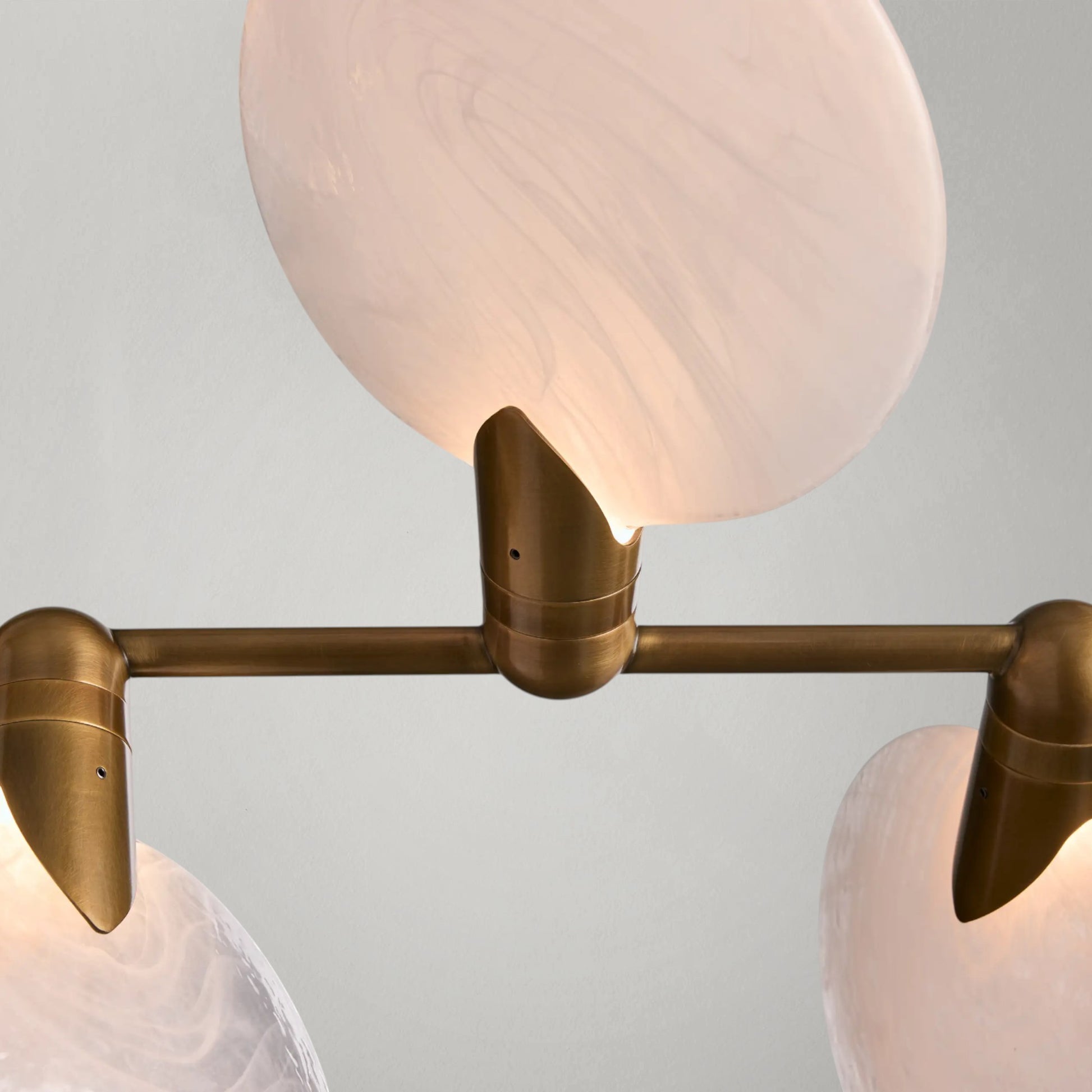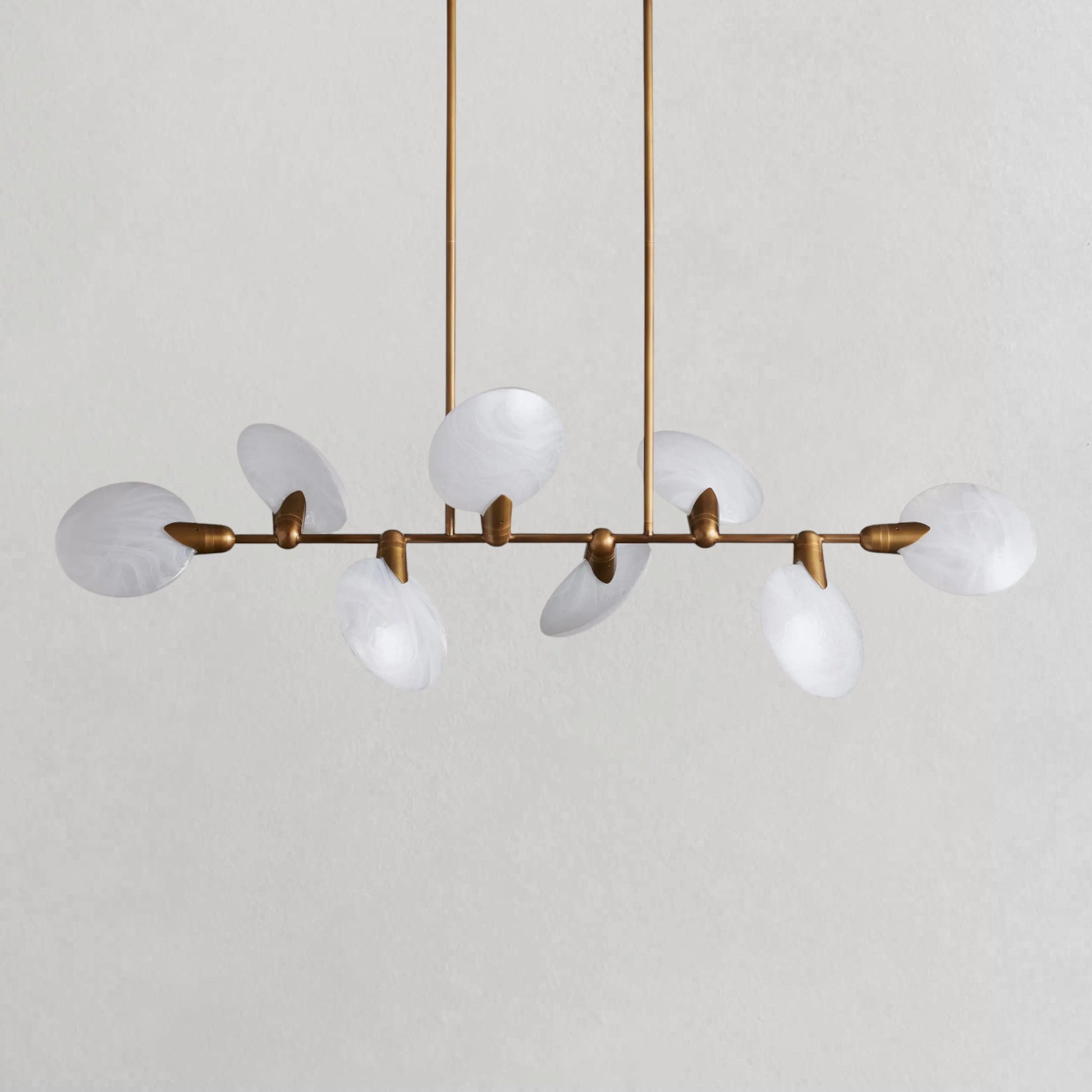 This linear chandelier features a refined petal-like silhouette formed by hand-blown glass discs arranged in a clean, elongated composition. When illuminated, the integrated LED light source enhances the natural swirls, streaks, and subtle textural ripples within the translucent glass, creating a soft, layered glow. The streamlined form and balanced suspension make it an ideal choice for dining tables, kitchen islands, and modern open-plan interiors.