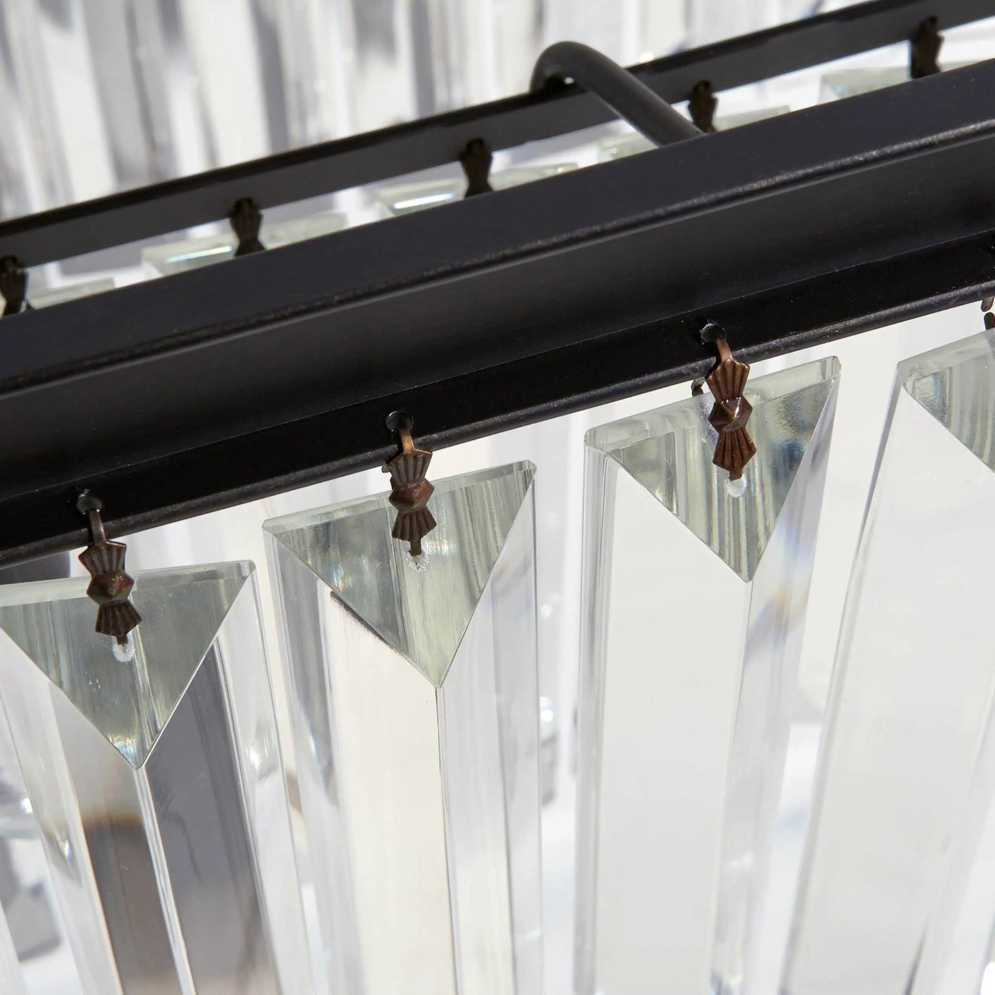 This chandelier revives the glamour of 1920s French Art Deco through layered rows of faceted glass crystals suspended from a rustic metal frame. When illuminated, the crystal elements refract light from multiple angles, creating a warm, atmospheric glow with refined visual depth. The linear composition feels elegant yet architectural, making it a striking centerpiece for dining areas and high-ceiling interiors.
