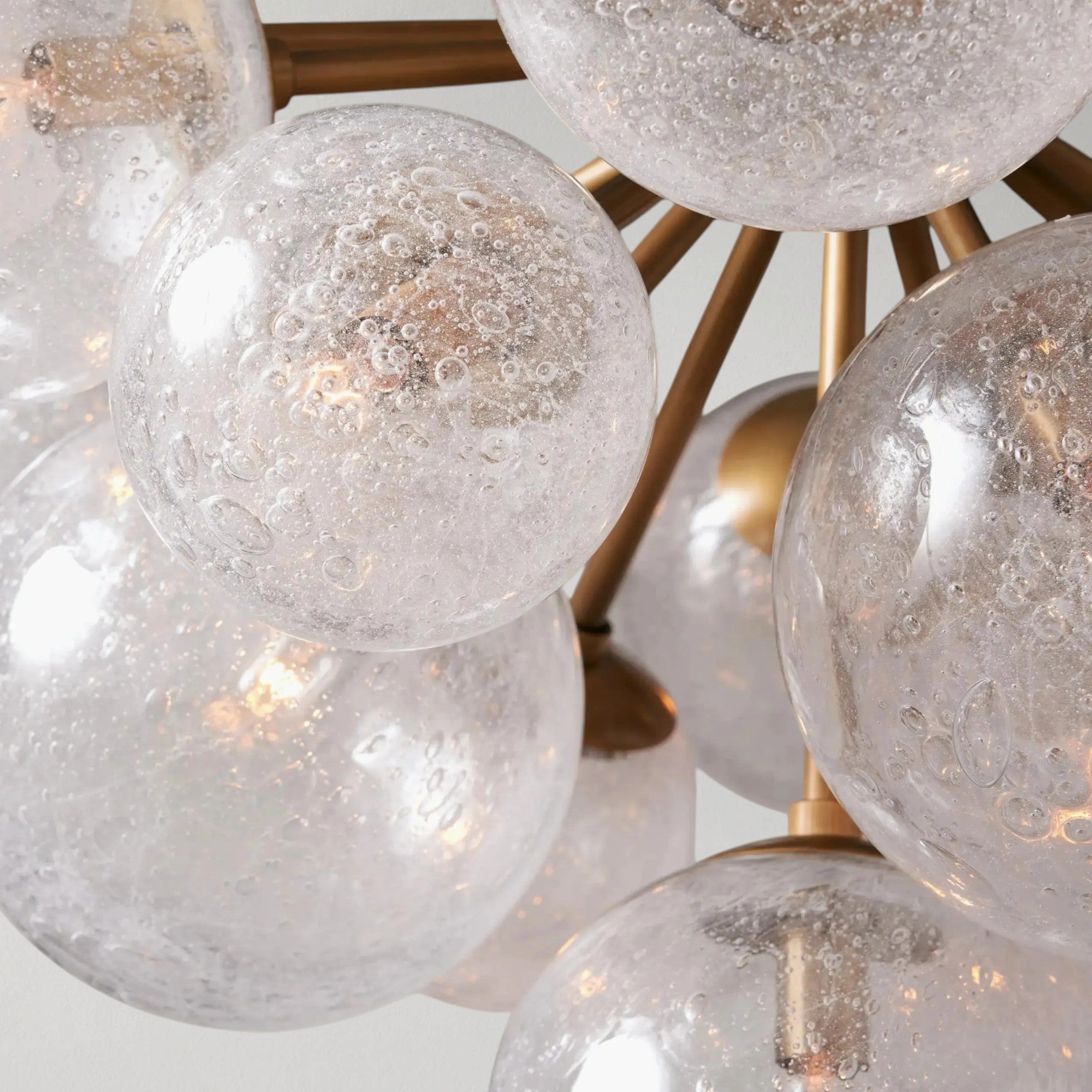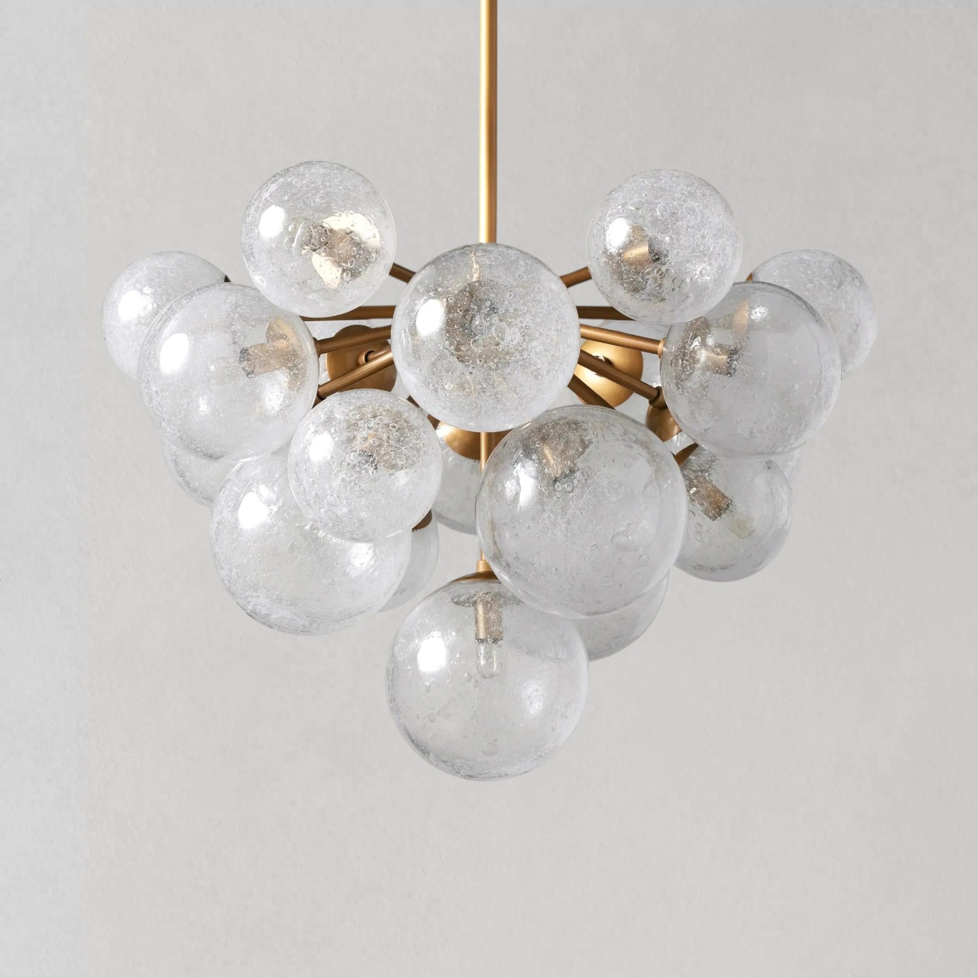 This chandelier blends rustic character with industrial design through a bold mixed-material composition and sculptural silhouette. Each glass globe is hand-blown using a reactive technique, forming a dense pattern of bubbles within thick glass. When illuminated, light radiates from every angle, creating depth, texture, and a striking visual presence that transforms the fixture into a true statement piece.