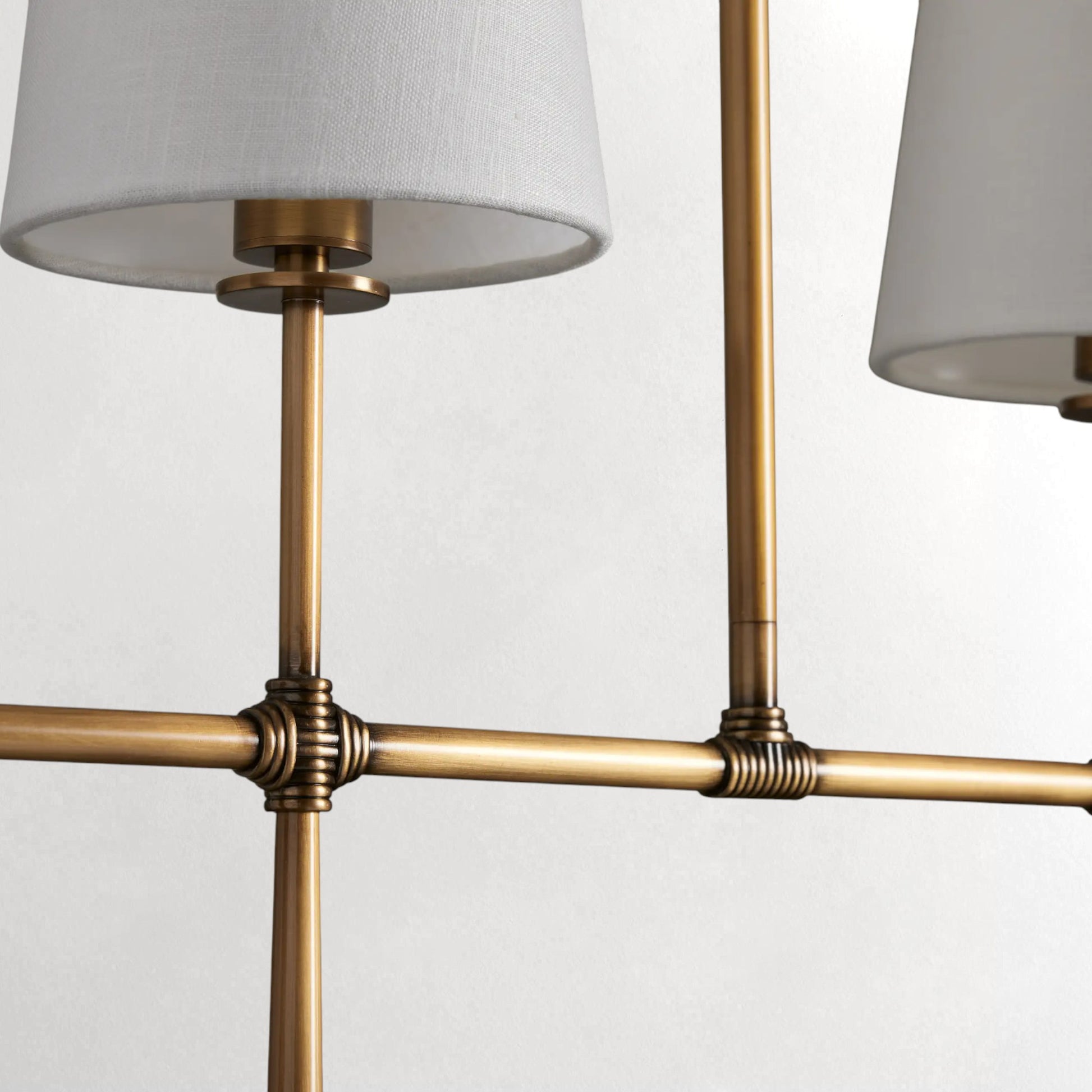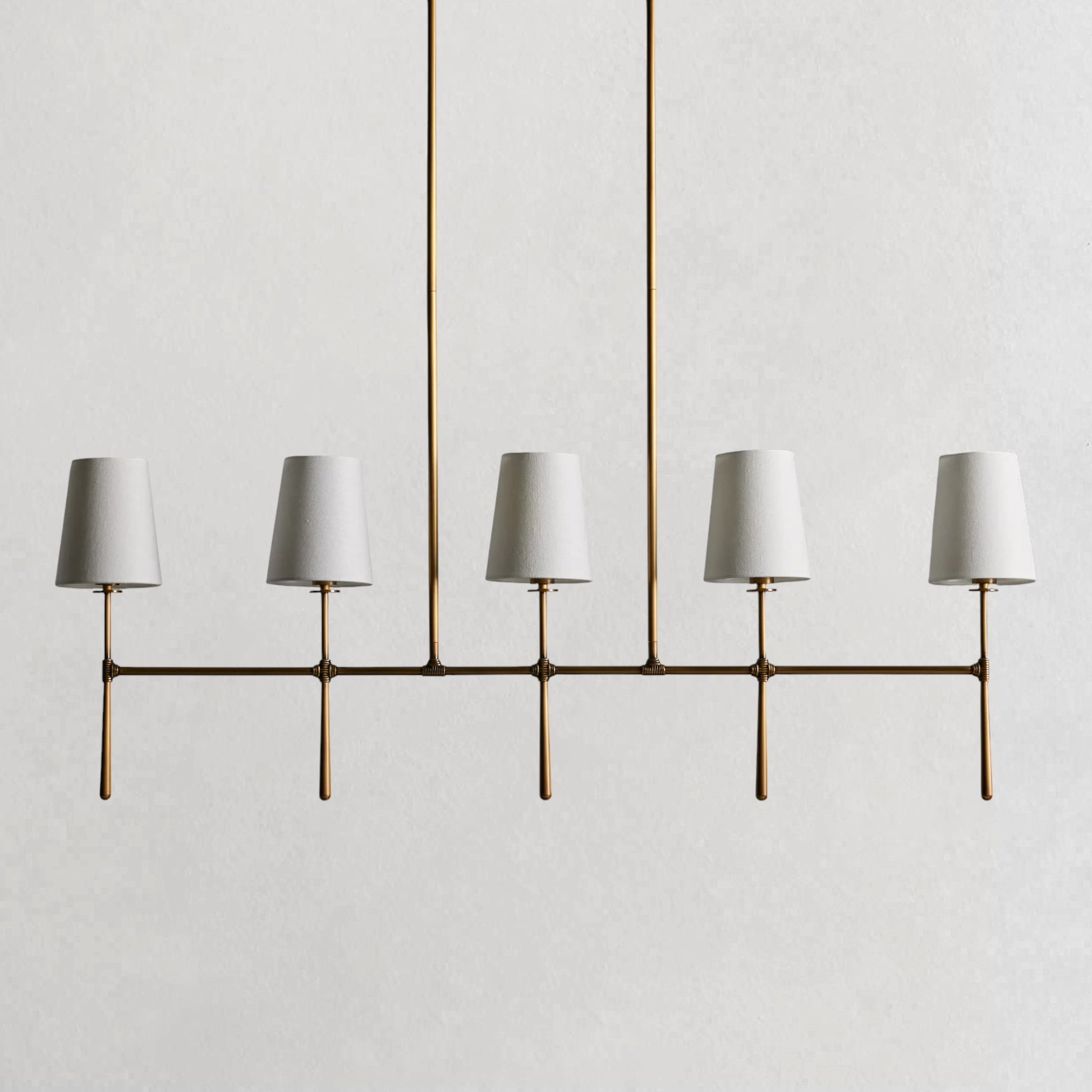 This chandelier features an elegant tapered torch silhouette paired with textured linen shades, drawing inspiration from mid-century modern design. The balanced multi-light arrangement produces a warm, inviting glow while maintaining a refined visual presence. Subtle detailing along the metal framework adds cohesion and character, allowing the fixture to transition seamlessly from living spaces to dining rooms and offices, complementing a wide range of interior styles.