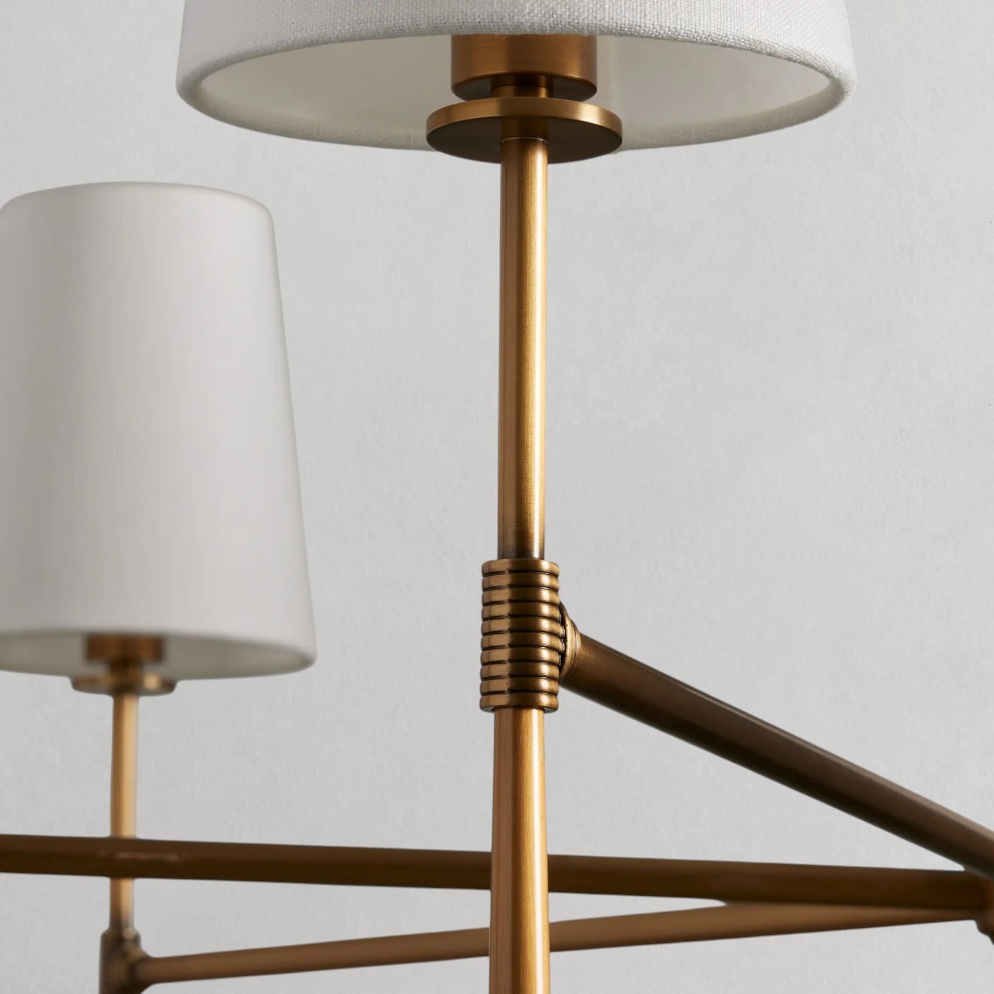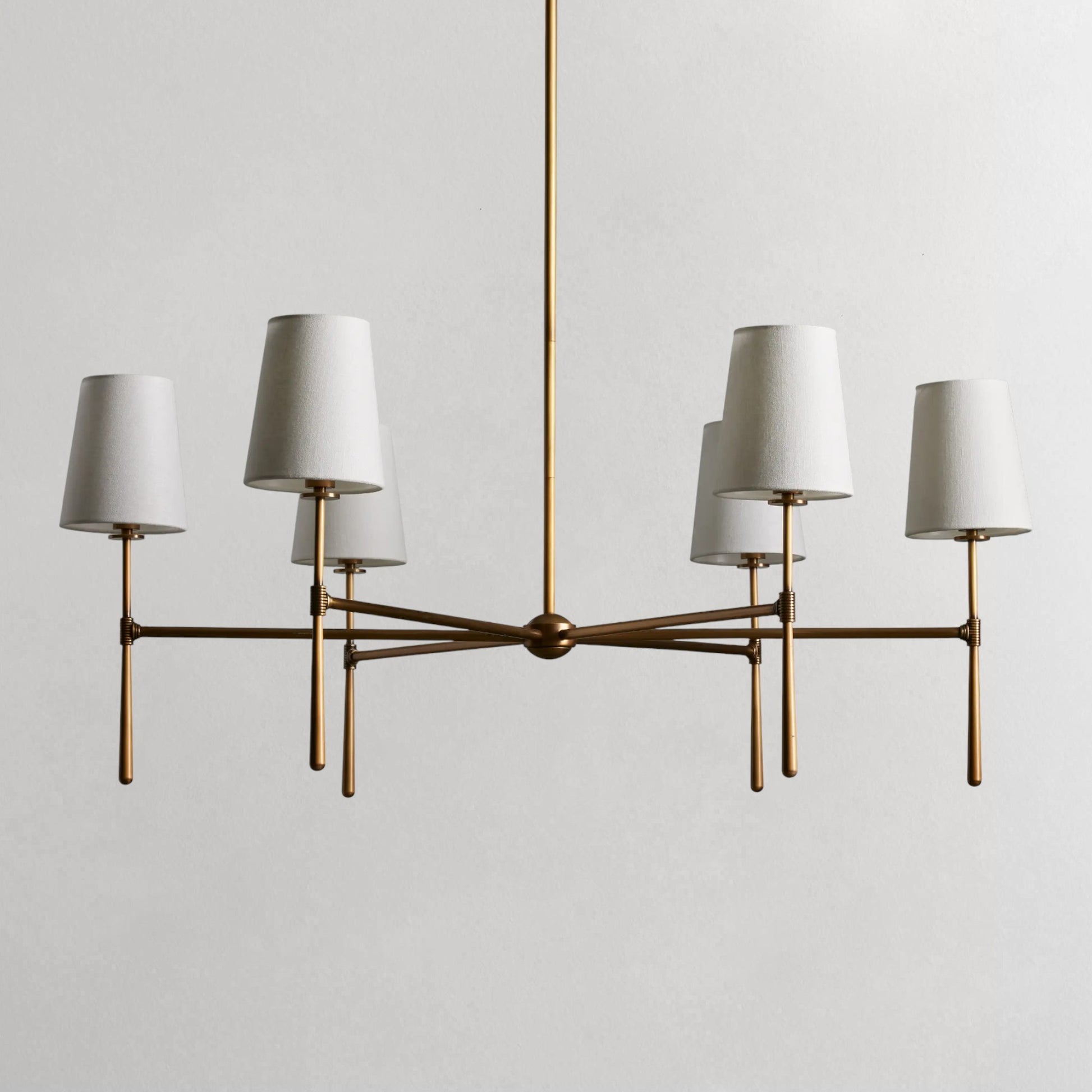 This chandelier showcases a refined tapered torch silhouette paired with textured linen shades, drawing inspiration from mid-century modern design. The balanced multi-light configuration delivers a soft, welcoming glow while maintaining a clean and elegant profile. Subtle detailing along the metal framework adds visual continuity, allowing the fixture to complement living spaces, dining rooms, and office interiors with ease.