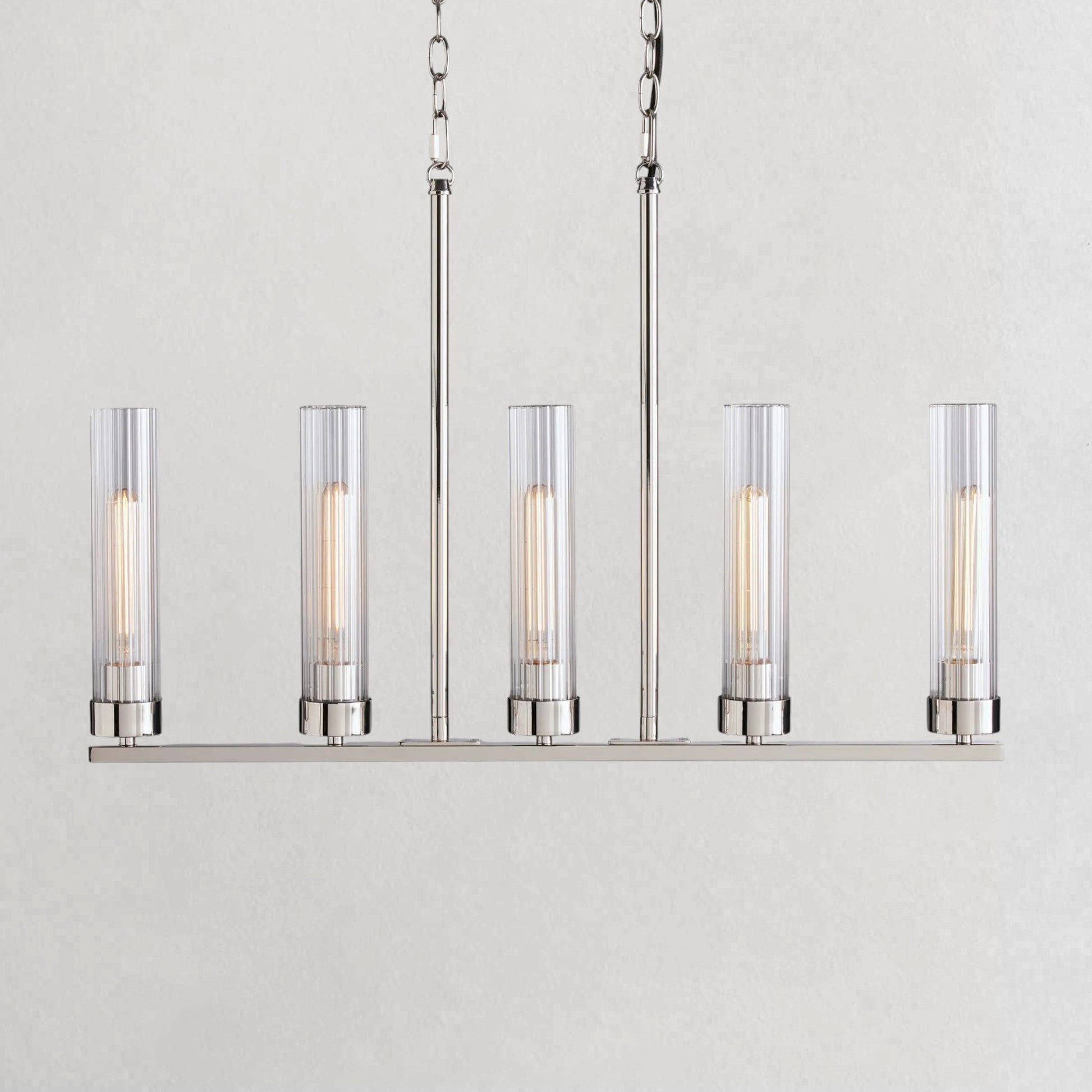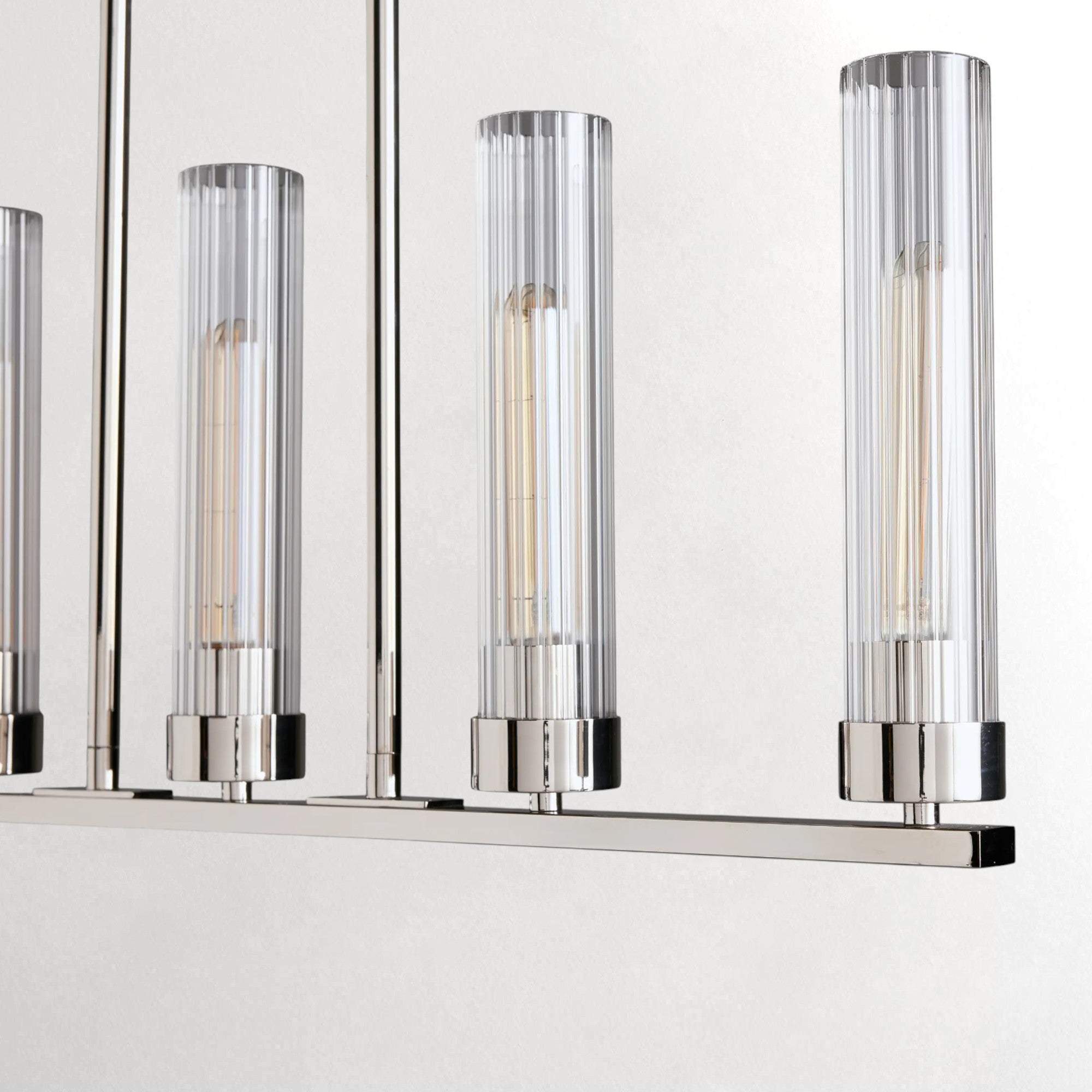 This linear chandelier blends vintage-inspired detailing with modern design, creating a refined and welcoming presence. Fluted glass shades line the sleek structure, softly diffusing light while adding texture and visual rhythm. With multiple points of illumination arranged along a clean silhouette, it brings warmth, balance, and understated elegance to dining areas, kitchen islands, or contemporary open spaces.
